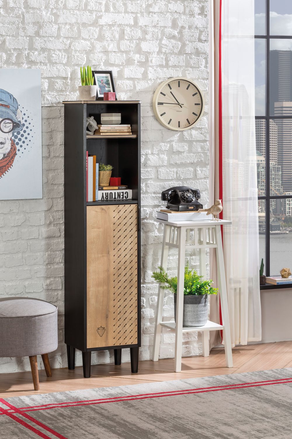 Dieses Regal bietet vielfältige Verwendungszwecke und Aufbewahrungs-Möglichkeiten. Schulutensilien verschwinden hinter der Tür und in den offenen Regalen lassen sich Fotos, Bücher und Dekoartikel, effektvoll präsentieren. Das Regal macht sich sowohl als Einzelstück, wie auch in Kombination mit dem Schreibtisch Prima.