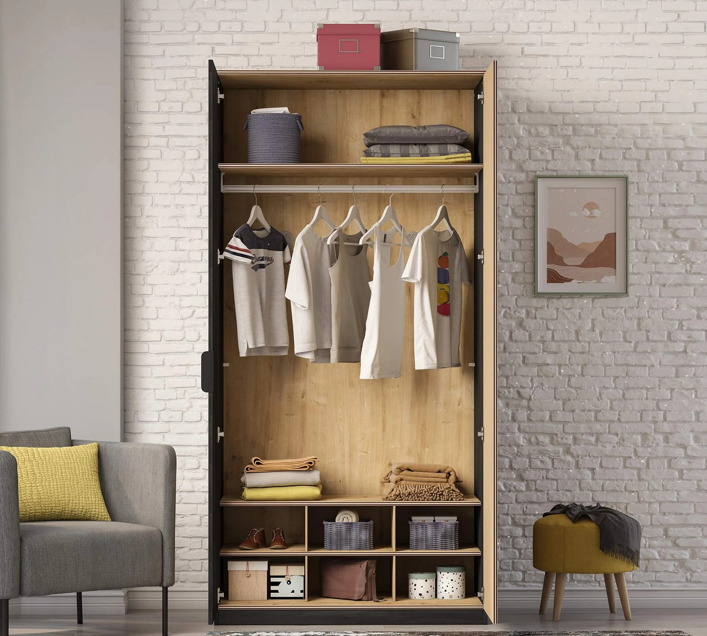 - Einteilung: 2 x Einlegeböden, 1 x Kleiderstange und 6 offene Fächer