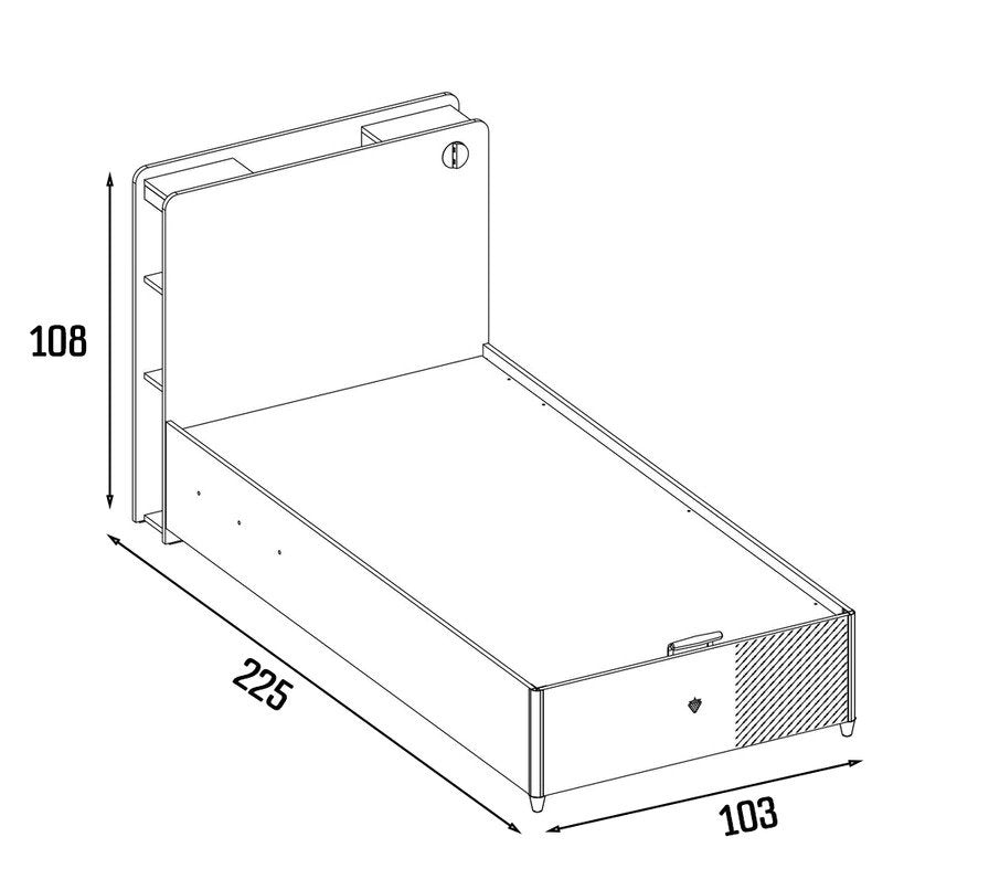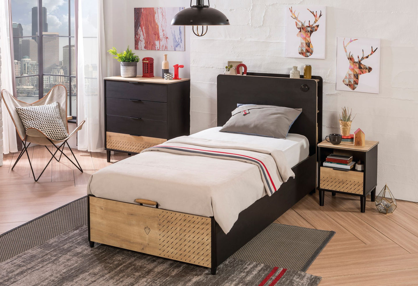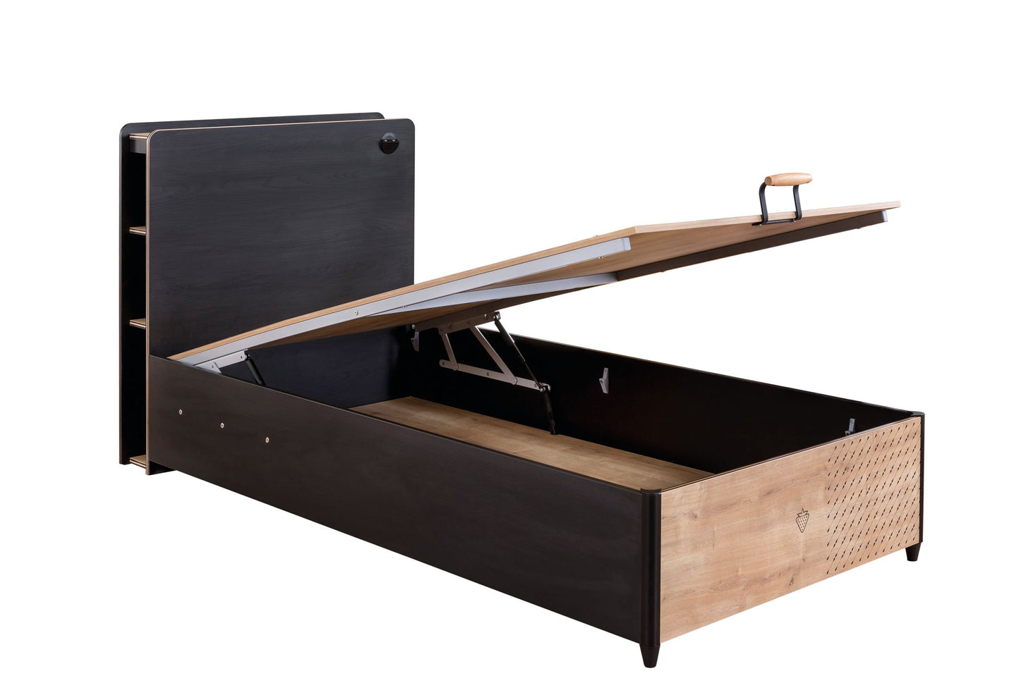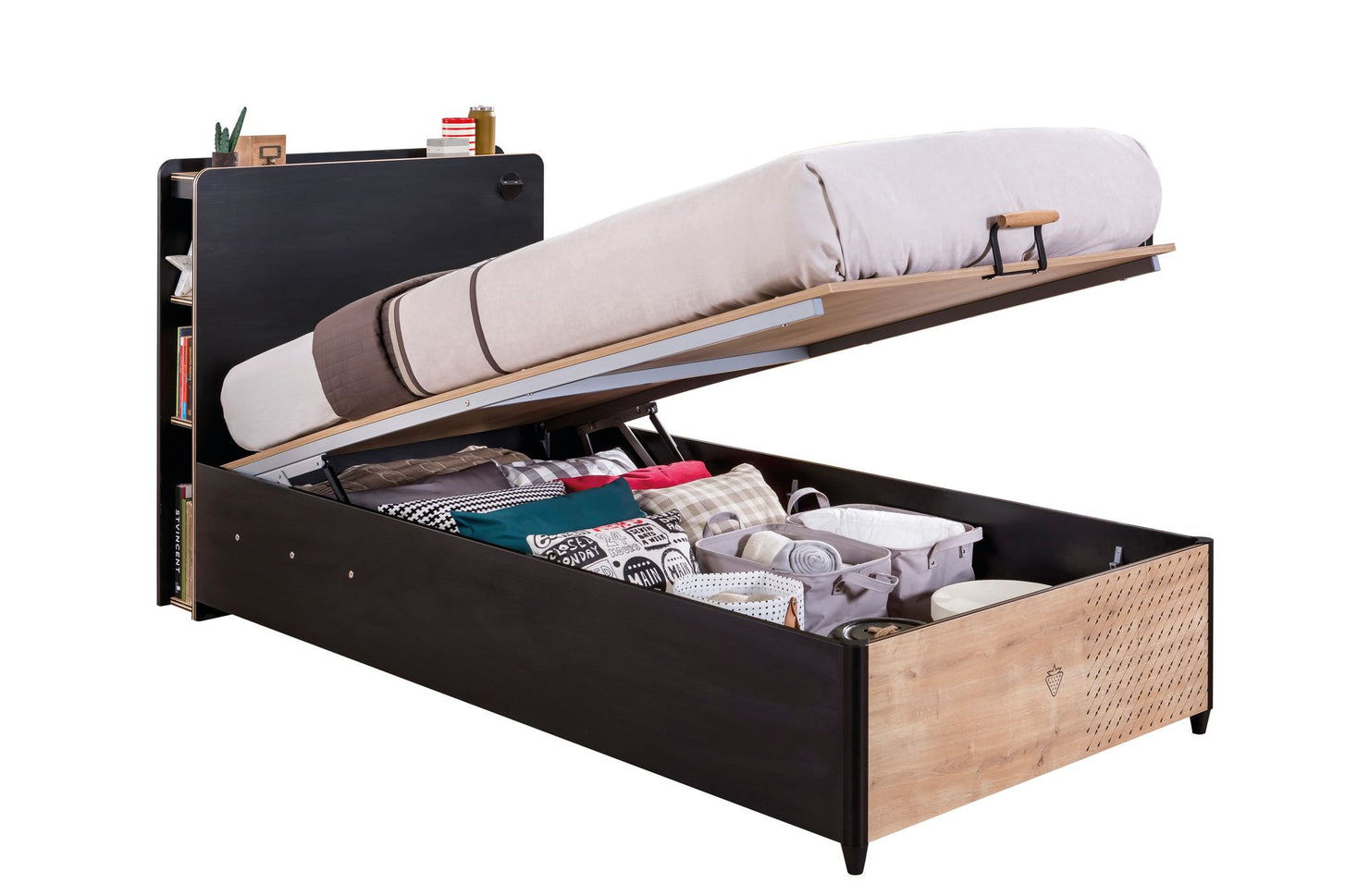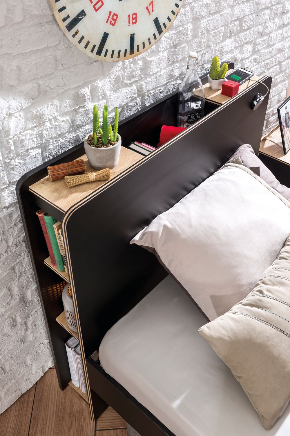 Das BLACK Kinderbett mit Bettkasten ist ein kleines Platzwunder. Mit dem Griff am Fußende lässt sich die Liegefläche im Handumdrehen anheben und bietet Zugang zum Bettkasten, wo sich allerlei Utensilien verstauen lassen. In diesem Bett kann man sich auch entspannt zurücklehnen – direkt am Kopfteil integrierte Regale und Ablagefläche sorgen dafür das Bücher, Brille und Co. immer griffbereit sind und am integrierten USB-Anschluss mit zwei Eingängen können die Smart-Geräte, direkt am Bett aufgeladen werden.