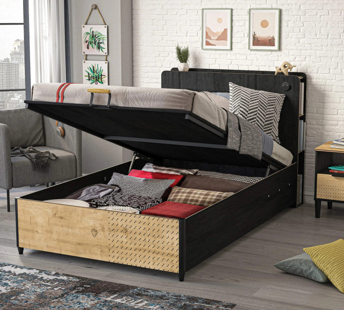Willkommen zum Cilek BLACK Stauraumbett - eine praktische und stilvolle Lösung für Ihr Schlafzimmer. Dieses Bett in der Größe 120x200 cm bietet nicht nur eine komfortable Liegefläche, sondern auch einen großzügigen Bettkasten mit Hydrauliköffnung für zusätzlichen Stauraum. Das integrierte Regal am Kopfteil ermöglicht es Ihnen, persönliche Gegenstände griffbereit zu halten. Mit der USB-Dose am Kopfteil können Sie Ihre elektronischen Geräte bequem aufladen. Entdecken Sie die Eleganz und die modernen Funktionen des Cilek BLACK Stauraumbetts und genießen Sie erholsame Nächte in Ihrem neuen Lieblingsbett.