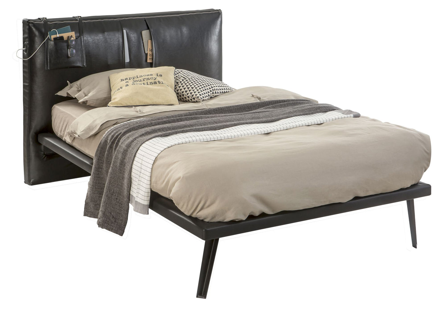 Das Kinderbett Dark Metal ist nicht nur komfortabel sondern auch ein echter Hingucker. Hier wurde am Kopfteil über die komplette Breite ein silberner Reisverschluss eingearbeitet, was auf dem schwarzen Leder zu einem optischen Highlight wird. Funktional wird das Bett, durch die am Kopfteil integrierten Taschen, wo kleine Lektüren verstaut werden können. Genau so praktisch ist die lederne Tasche, wo die Technik ein Platz findet, denn die kann direkt über den eingebauten USB-Anschluss aufgeladen werden. Eine interessante Ergänzung zum Bett ist das Ausziehbare Unterbett, welches Sie bei uns im Onlineshop optional erwerben können.