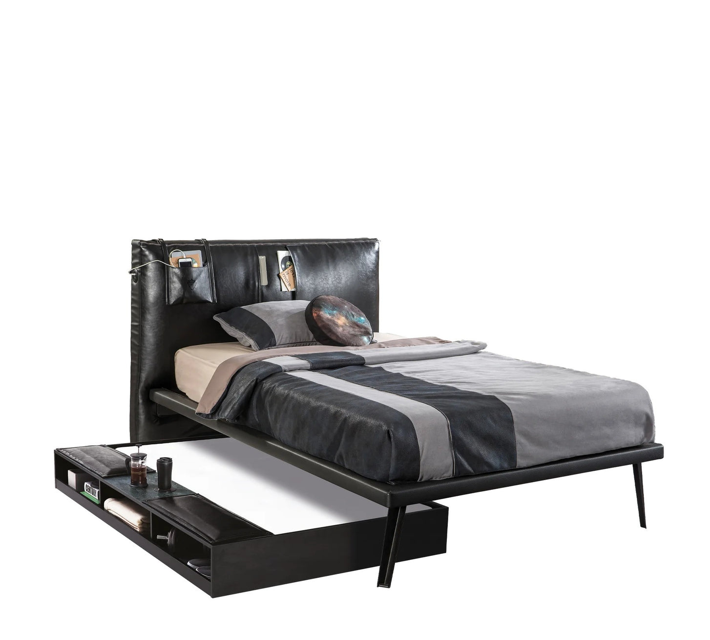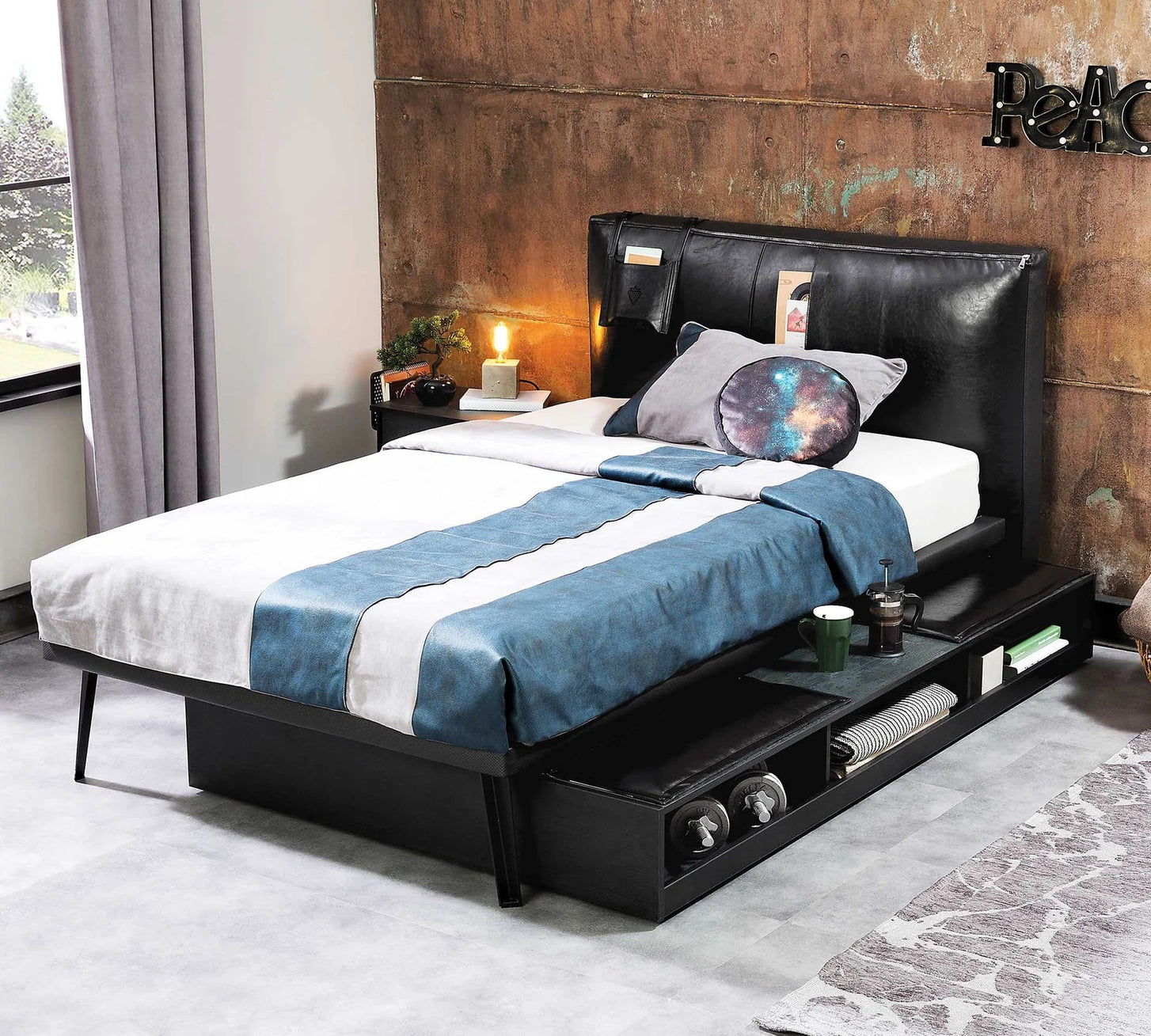 Der Bettkasten DARK METAL ist äußerst vielseitig einsetzbar. Er kann als Bettkasten genutzt werden oder zusammen mit einer Matratze als Gästebett dienen. Zusätzlich bietet der Kasten drei eingebaute Ablageflächen für zusätzlichen Stauraum. Mit den zwei mitgelieferten Sitzkissen kann der Bettkasten auch als gemütliche Sitzfläche verwendet werden. Durch eine Abstellfläche zwischen den Sitzkissen kann sogar auf einen separaten Nachttisch verzichtet werden.