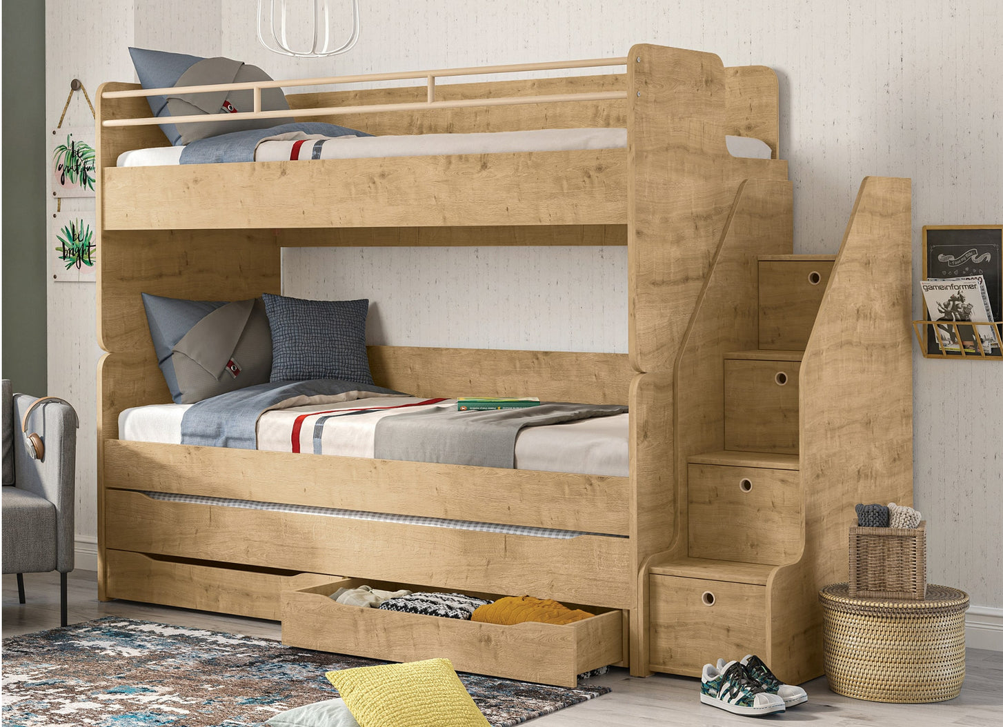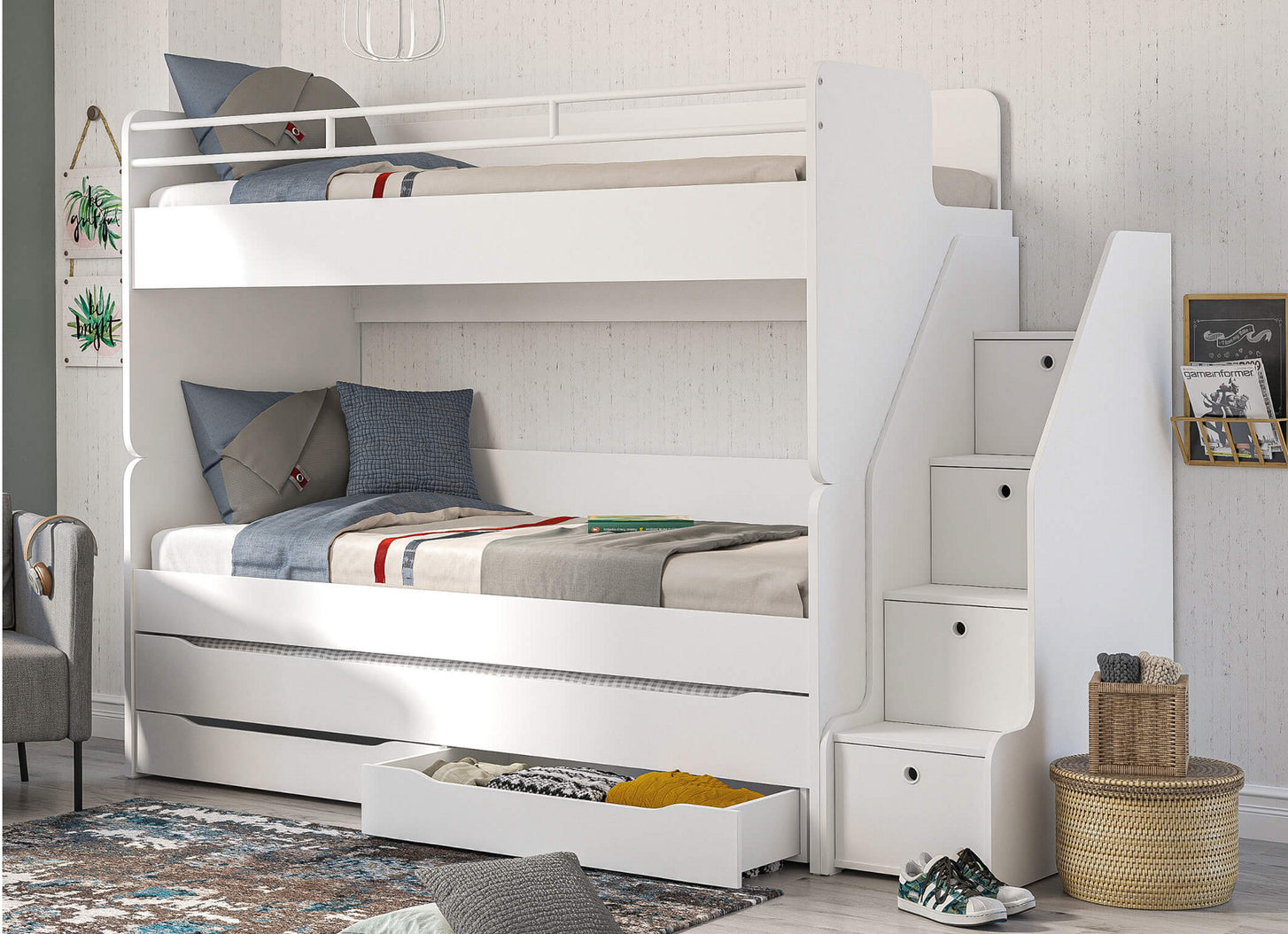 Kinderzimmer für Drei? Kein Problem! Das Cilek Studio Etagenbett ist die perfekte Lösung für kleine Räume. Mit drei Schlafplätzen, vier geräumigen Schubladen in der Treppe und zwei Bettkästen bietet es jede Menge Stauraum. So bleibt mehr Platz zum Spielen und Lernen. Und das Beste: Die Betten können auch einzeln genutzt werden!