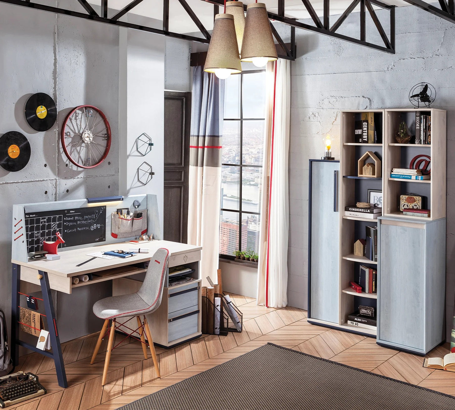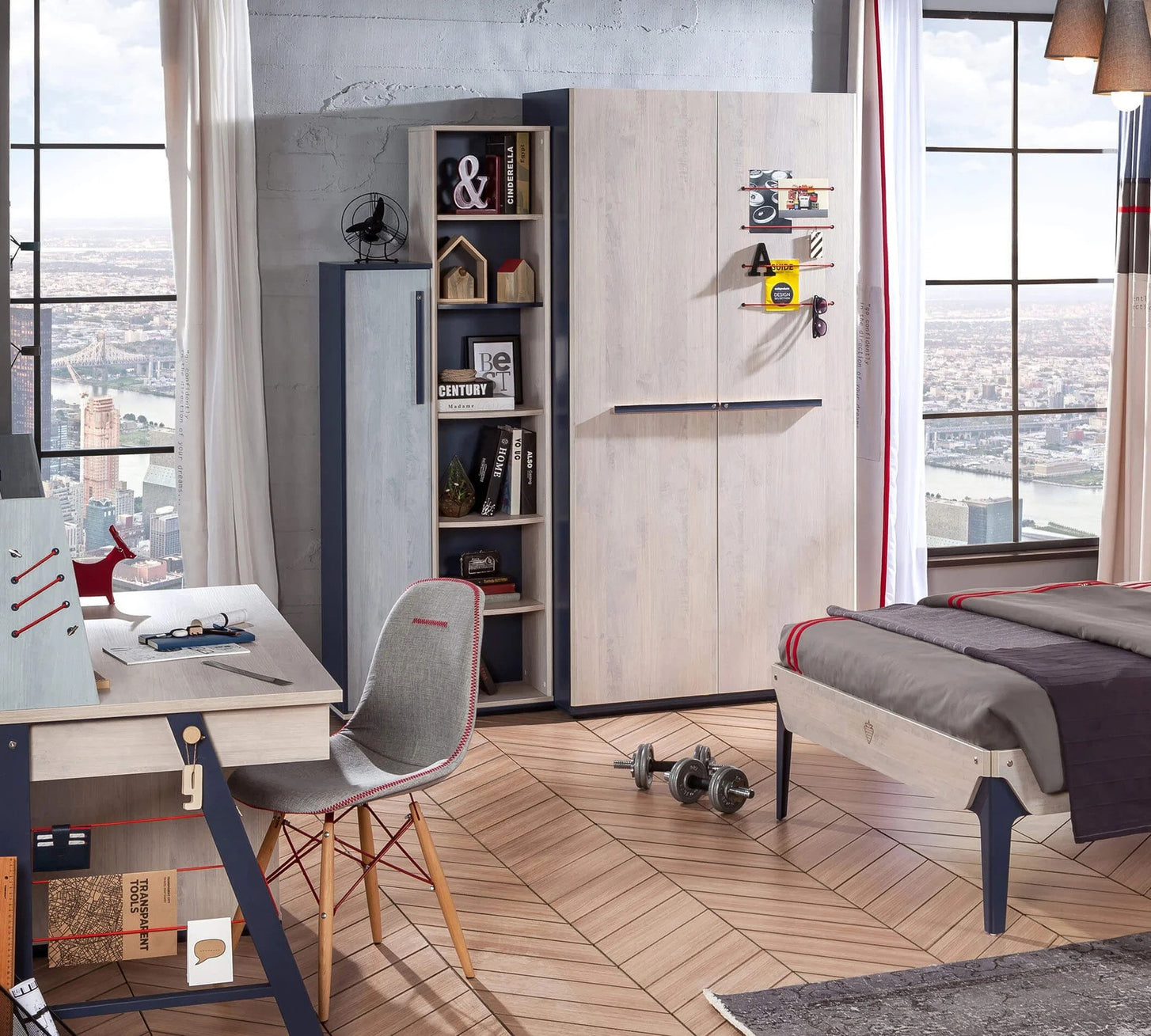Das moderne und natürliche Kinderzimmerprogramm von Cilek, das TRIO, überzeugt mit seinem Design und seiner Funktionalität. In soften Grau- und Holztönen in Kombination mit marinem Blau gehalten, strahlt es eine angenehme Ruhe aus und lädt zum Verweilen ein. Dank des frischen und jugendlichen Looks bietet das TRIO Kinderzimmerprogramm nicht nur einen Ort zum Chillen, sondern schafft auch eine inspirierende Umgebung für Schularbeiten und andere Aktivitäten.
