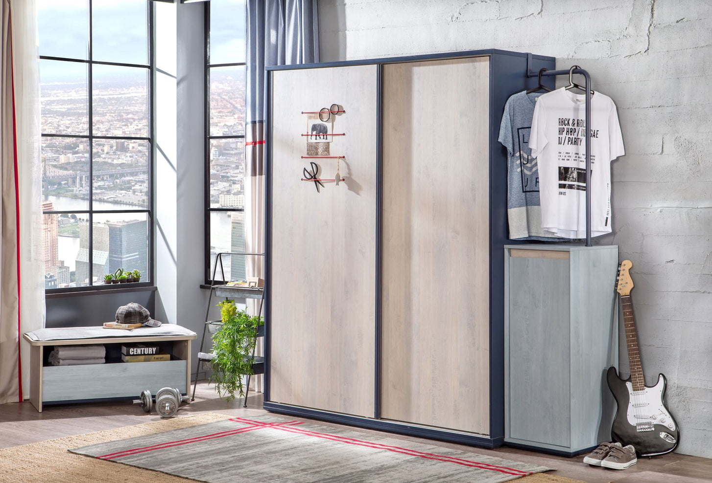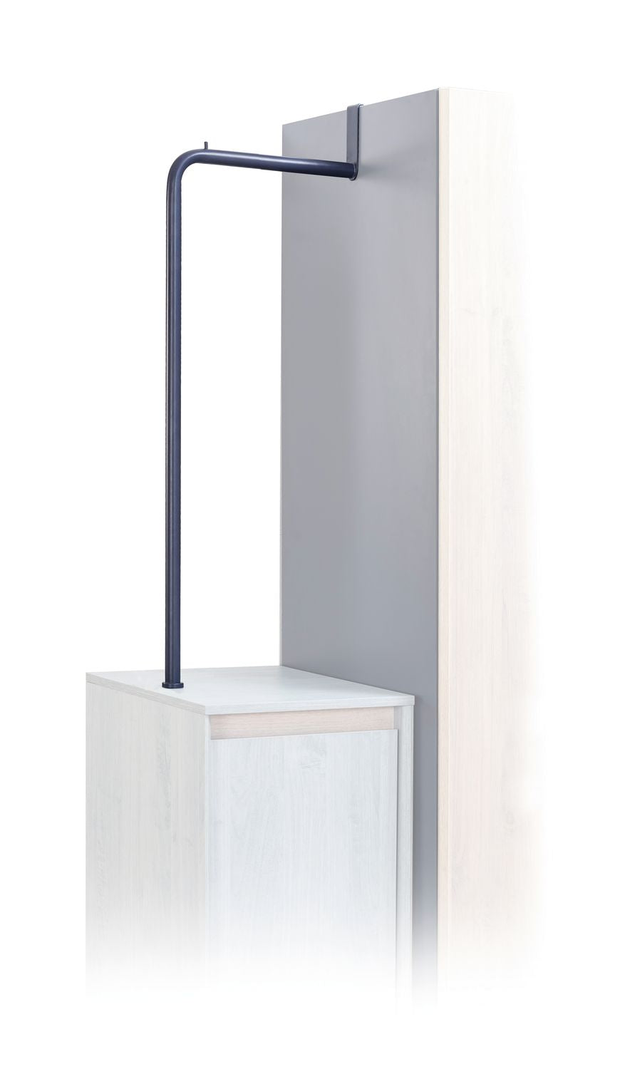 Eine pfiffige Erweiterung zum Kleiderschrank, ist die marineblaue Garderobenstange, die für Industrial Look sorgt. Die Lieblingsstücke vom Ihrem Kind werden hier prachtvoll in Szene gesetzt. Die Garderobenstange lässt sich einfach auf der Korpusseite vom Kleiderschrank aufstecken. Den passenden Kleiderschrank und den Zustellschrank finden Sie in unserem Online-Shop.