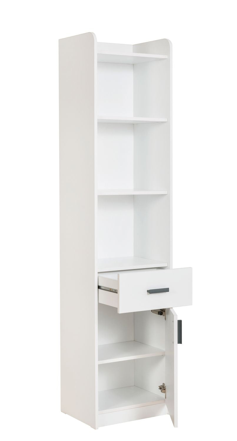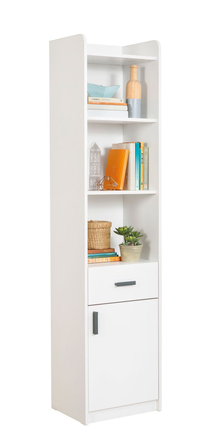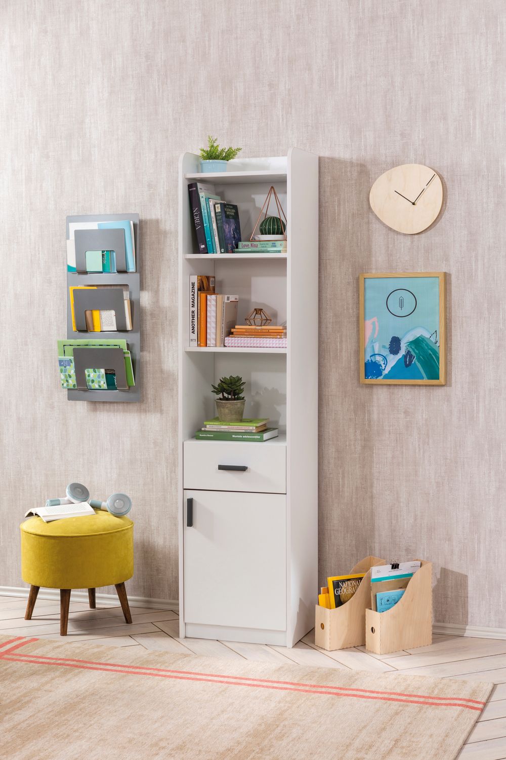 Das WHITE Bücherregal überzeugt mit klarer Optik und zeitlosem Design. Auf dem weißen Hintergrund werden die Lieblingsbücher, Fotos und Deko-Artikel, besonders effektvoll in Szene gesetzt. Während Ordner und andere Utensilien im geschlossenen Fach unterkommen. Für allerlei Stifte ist die Schublade vorhanden. Die Tür und Schublade sind mit Soft-Close-Funktion versehen, die für sanftes und leises Schließen sorgt.