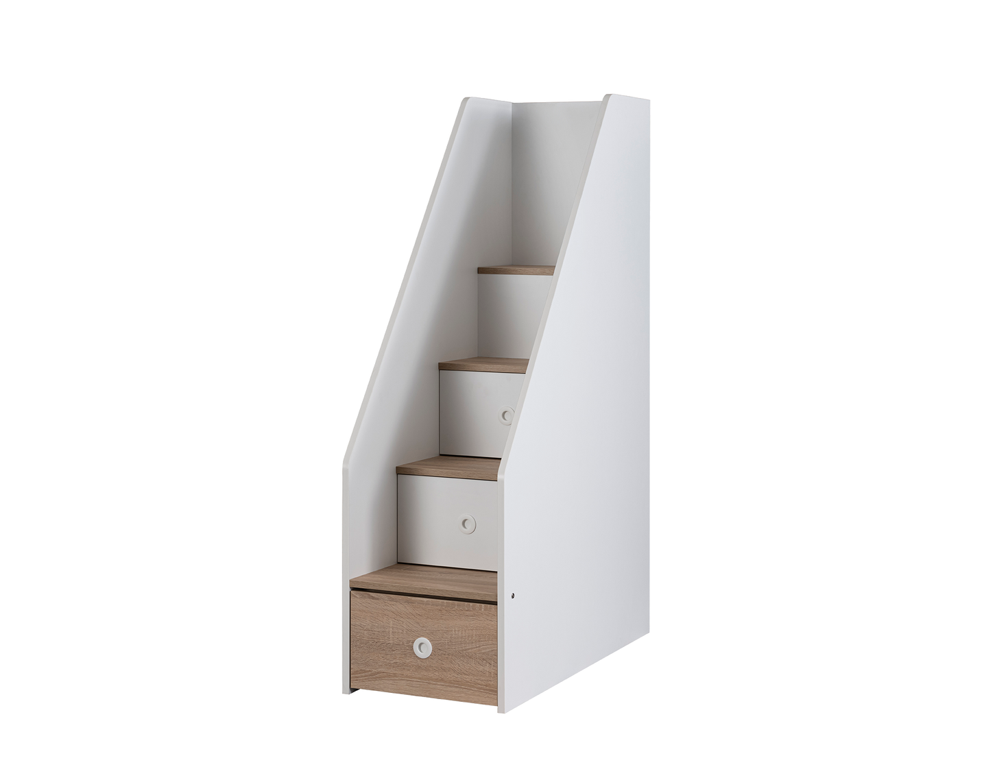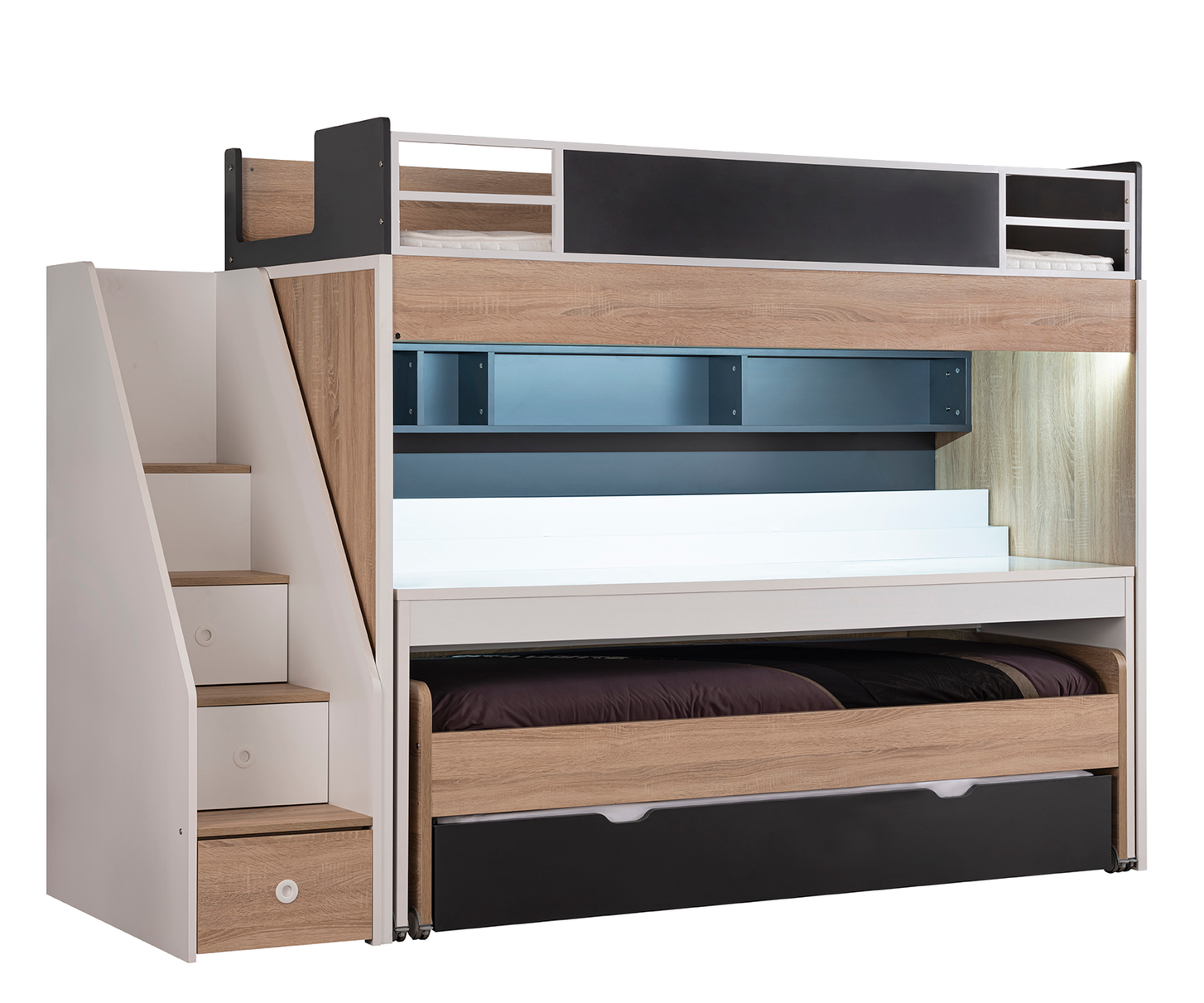 Unser Etagenbett ist mehr als nur ein Schlafplatz. Es ist ein Raumwunder, das Schlafen, Lernen und Spielen vereint. Das obere Bett bietet eine gemütliche Schlafinsel, während der darunterliegende Schreibtisch mit integrierter Beleuchtung den idealen Platz zum Lernen oder Arbeiten schafft. Die geräumige Schublade bietet zusätzlichen Stauraum für Bücher, Spielzeug oder Kleidung. Das zeitlose Design in Holzoptik und die hochwertigen Materialien machen dieses Bett zu einem langlebigen Begleiter.