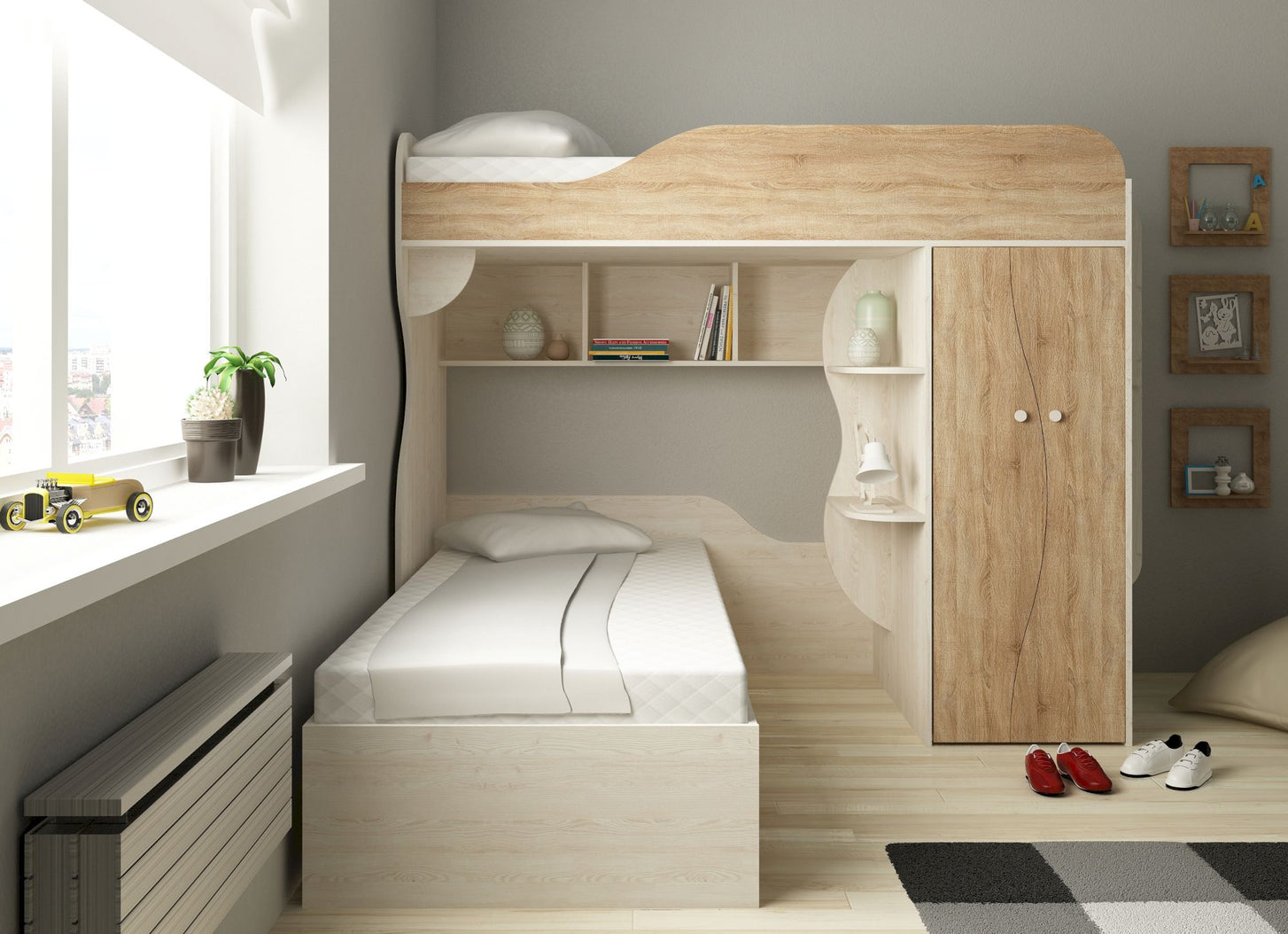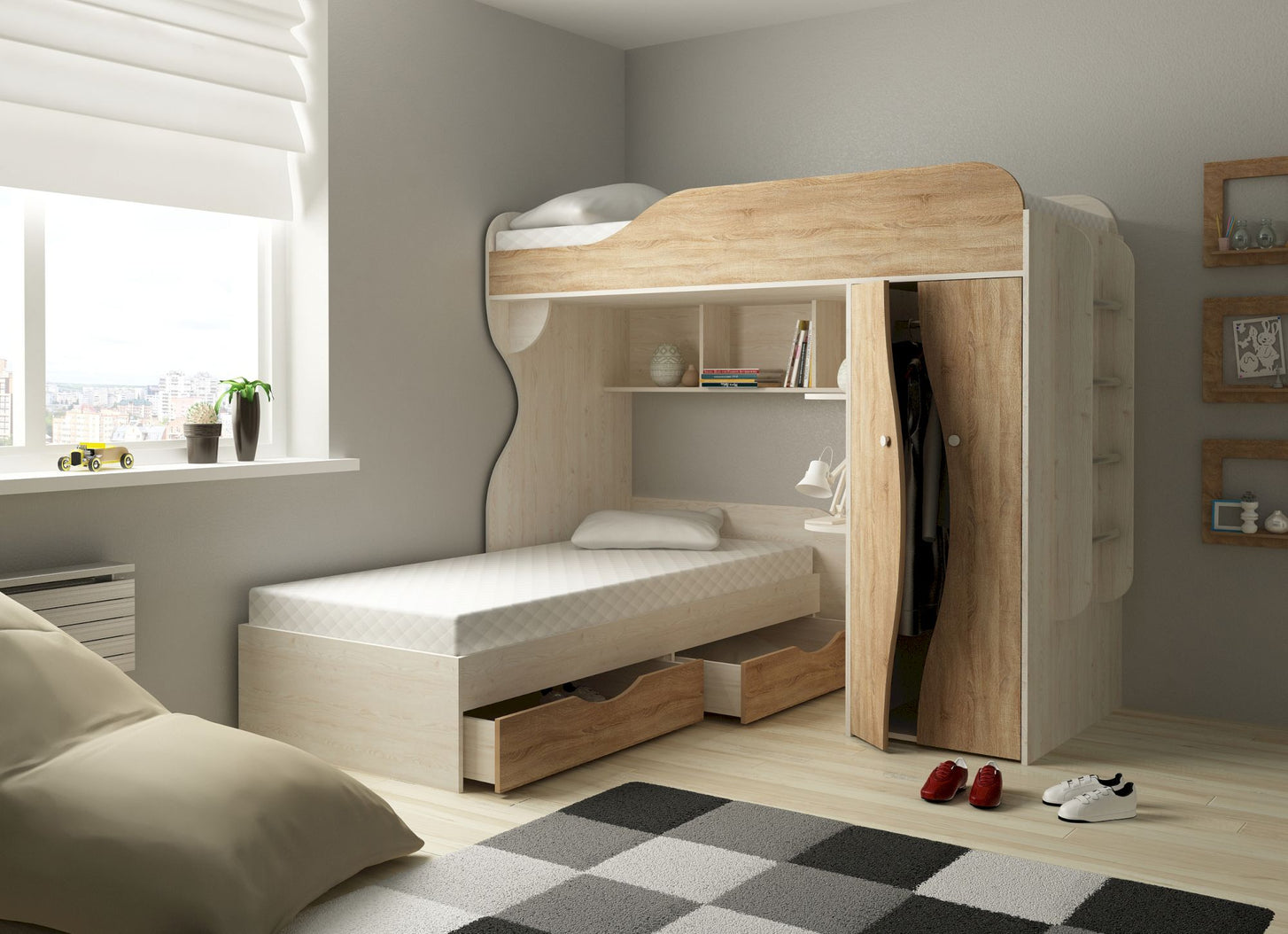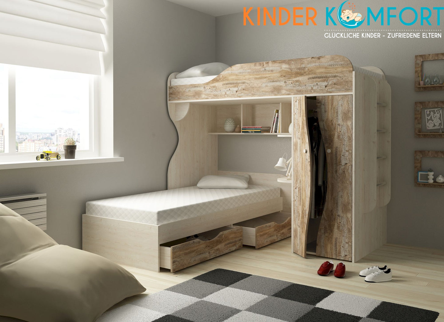 Der untere Schlafbereich setzt mit seinen speziellen Gestaltungselementen optische Höhepunkte für ein modernes und individuelles Kinderzimmer. Neben dem Bett befindet sich 2 kleine Ablagefläche, die als Stauraum und Nachtisch genutzt werden können. Oberhalb des Bettes sind 3 weitere Regale für Bücher, Spielsachen oder Accessoires. Unterhalb des Bettes gibt es 2 große Schubfächer für weitere Spielsachen, Kleidung, Bettwäsche oder andere Dinge. Im zweitürigen Kleiderschrank befindet sich eine Kleiderstange und Ablagefächern.