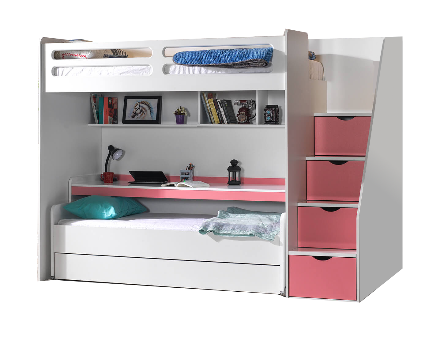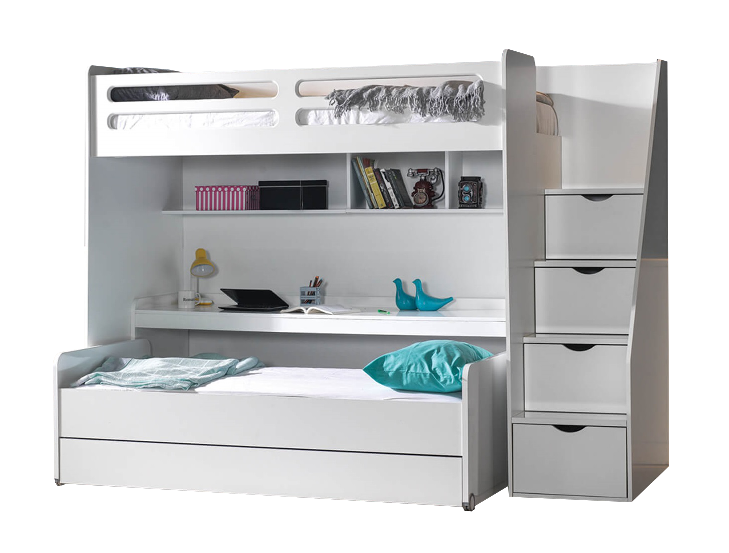 Dieses vielseitige Bettset ist die perfekte Lösung für Familien mit mehreren Kindern oder für Kinderzimmer, in denen regelmäßig Übernachtungsgäste willkommen sind. Das Hochbett bietet einen gemütlichen Schlafplatz, während das Unterbett mit Bettkasten zusätzlichen Stauraum schafft. Der integrierte Schreibtisch macht das Zimmer komplett.