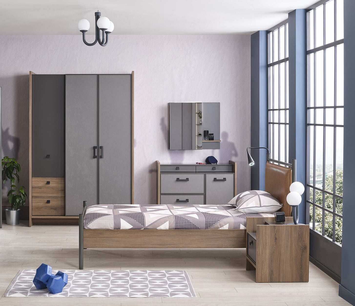 Das 5-teilige Jugendzimmer-Set ACTION ist in Holz, Anthrazit und Silbergrau gearbeitet und umfasst ein Jugendbett mit einer Liegefläche von 100x200 cm, eine Nachtkommode, einen 3.-türigen Kleiderschrank und eine Kommode mit passendem Wandspiegel. Das sorgfältig zusammengestellte Möbel-Set verbindet elegantes Design mit praktischer Vielseitigkeit und schafft eine harmonische Umgebung, in der sich jeder gerne aufhält.