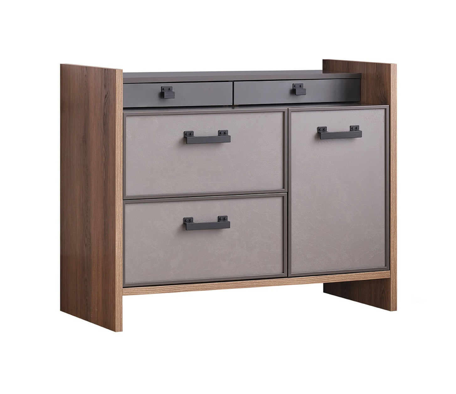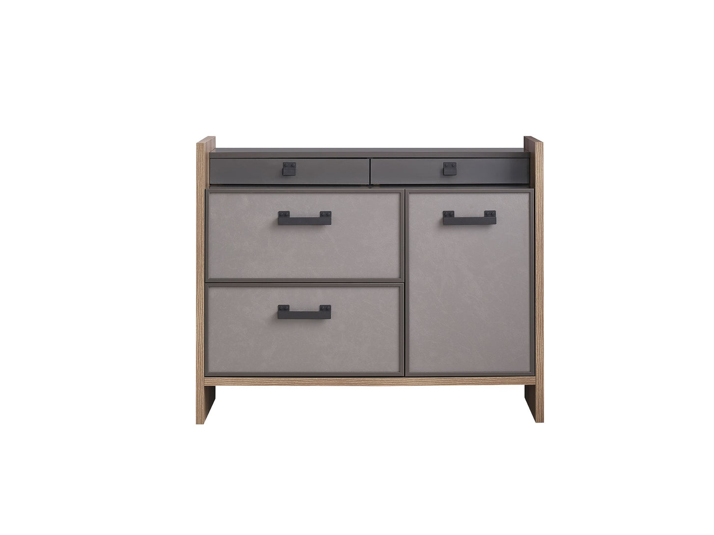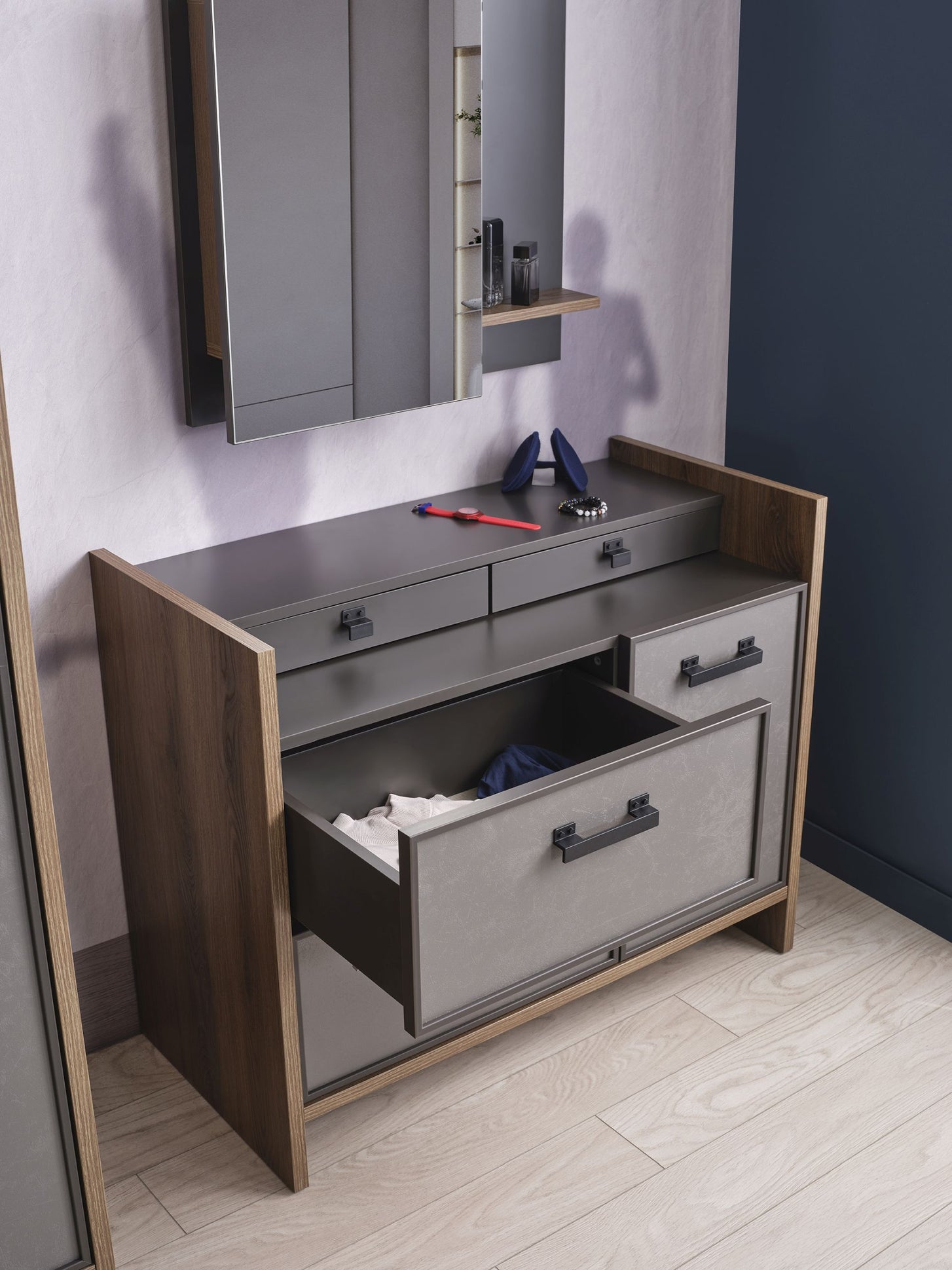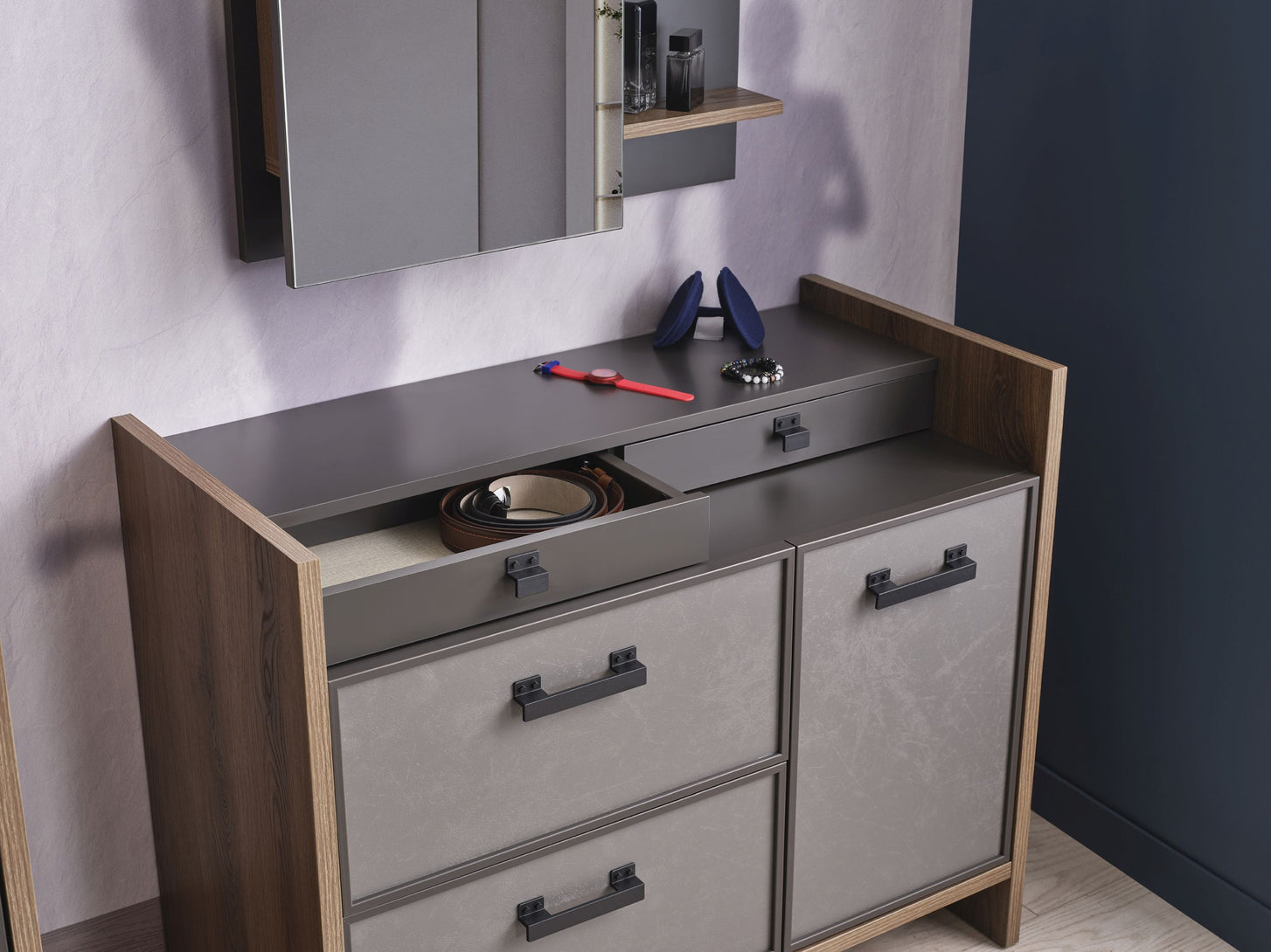 Die in elegantem Design gearbeitet Kommode ACTION von Kupa kombiniert Moderne mit durchdachtem Stauraum. Sie bietet zwei geräumige Schubladen, eine Tür und auf der oberen Ablage zwei weitere kleine Schubladen, die sich perfekt zur Aufbewahrung von kleineren Schätzen eignen. Dank des Soft-Close-Systems schließen die Türen und Schubladen sanft und sicher, während die schwarzen Griffe eine einfache Handhabung gewährleisten. Die hochwertigen Fronten sind elegant in Anthrazit oder Silbergrau gearbeitet und verleihen der Kommode eine ansprechende Optik.