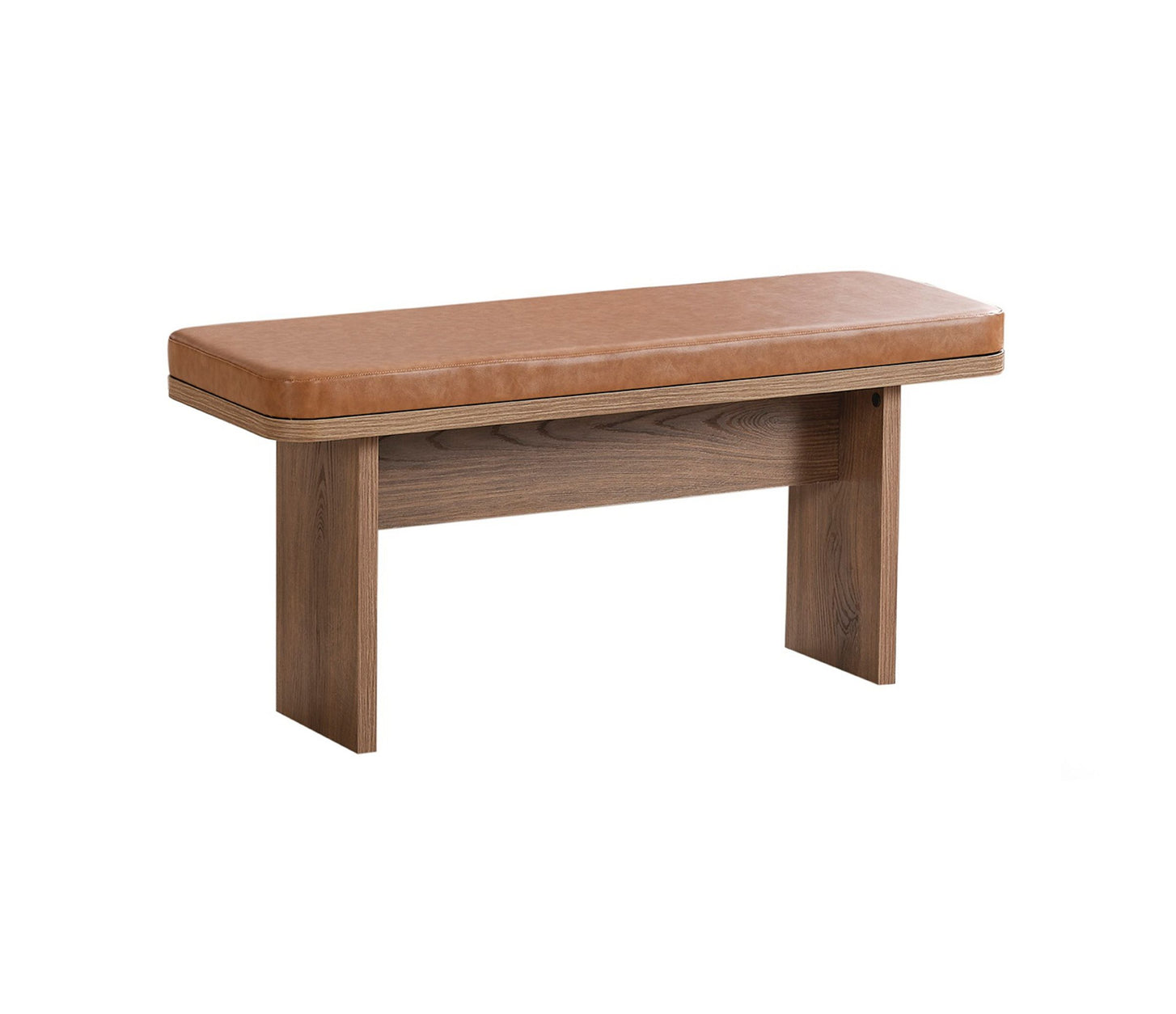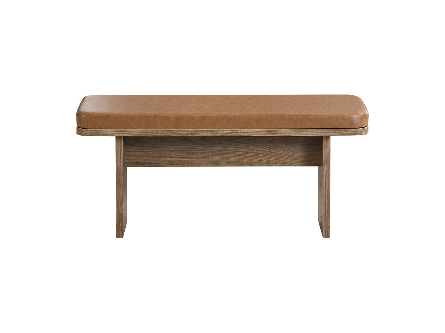 Die Sitzbank ACTION kombiniert stilvolles Design mit hohem Sitzkomfort. Gefertigt aus Holz mit einer gepolsterten, braunen Sitzfläche, verleiht sie jedem Raum eine elegante Note. Der Bezug aus robustem, pflegeleichtem Kunstleder sorgt für Langlebigkeit und Komfort. Dank der breiten Standfüße steht die Bank stabil und sicher.