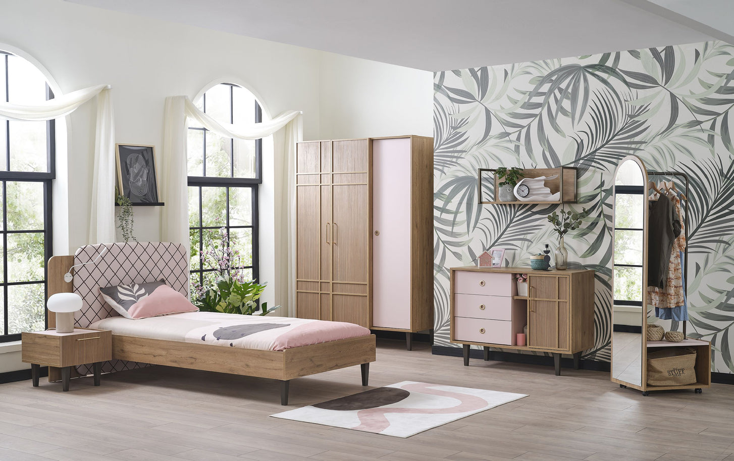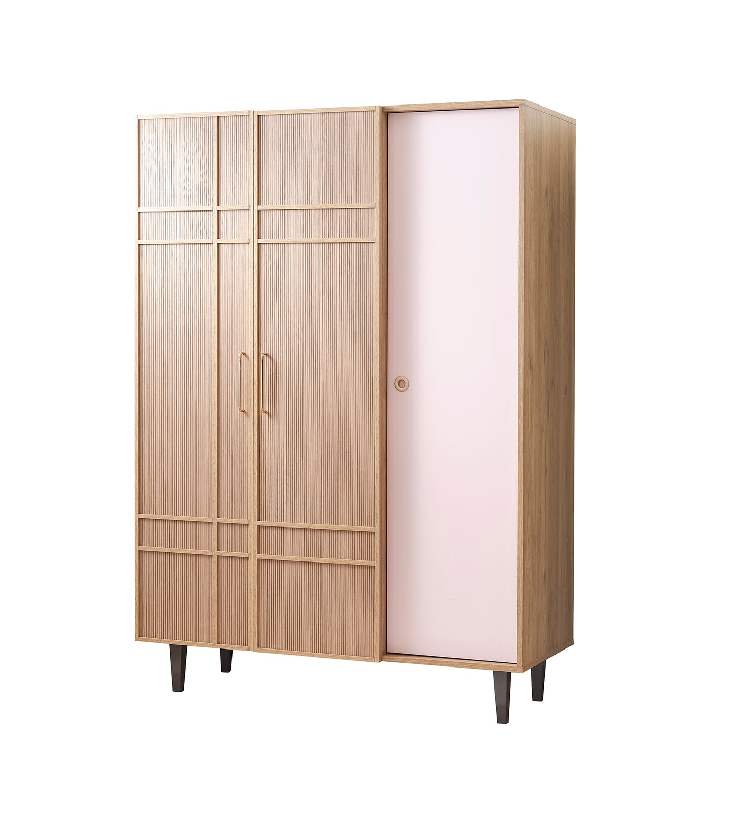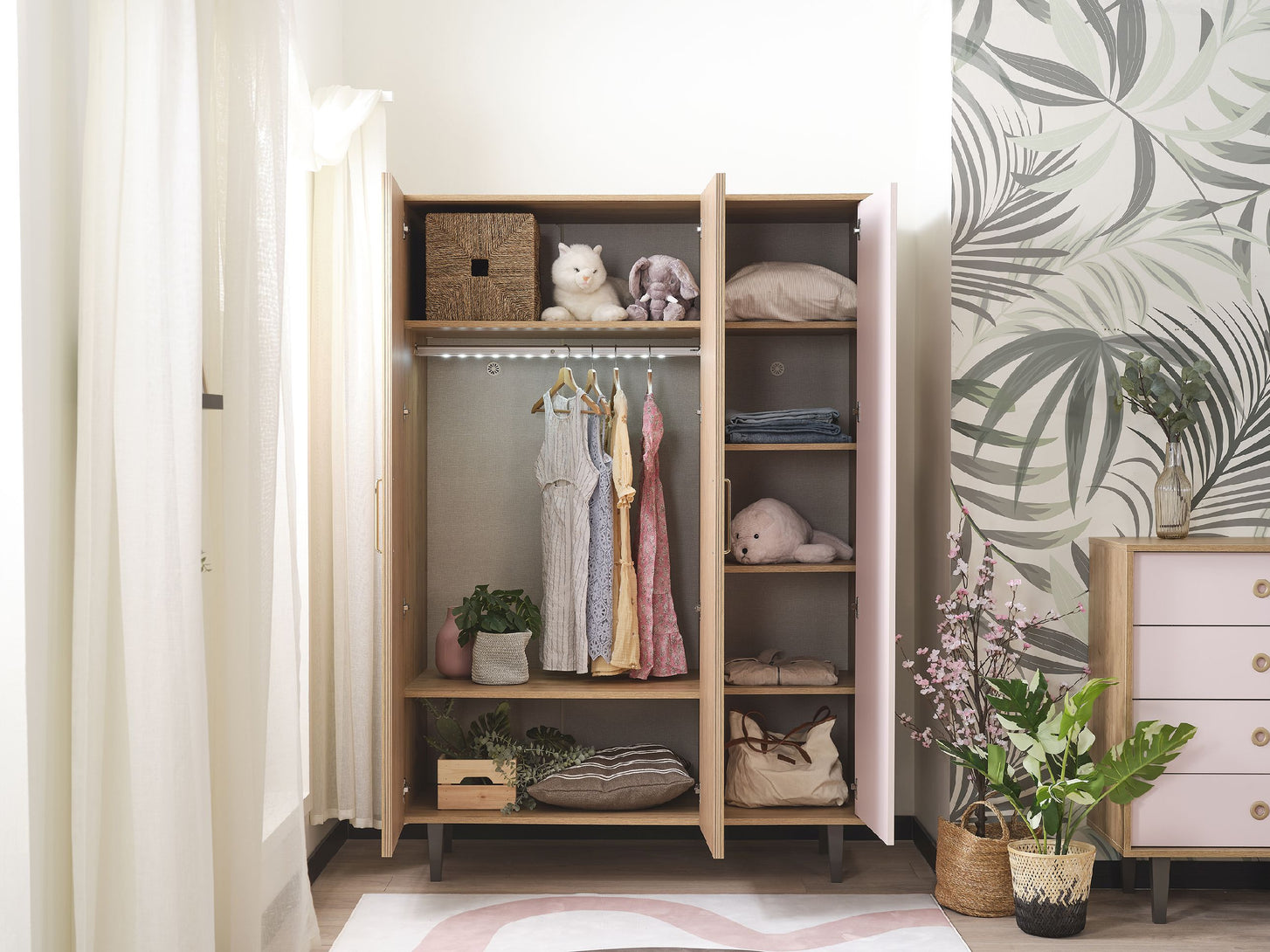 Entdecken Sie die Serie ALICE: Für ein gemütliches Zuhause. Der 3-türige Kleiderschrank ALICE ist ein Highlight dieser beliebten Serie. Mit seinen warmen Farben und dem vielseitigen Stauraum schafft er eine angenehme Atmosphäre in Ihrem Schlafzimmer. Die Kombination aus Holzoptik, sanftem Roséton und goldfarbenen Griffen verleiht dem Kleiderschrank eine elegante Note