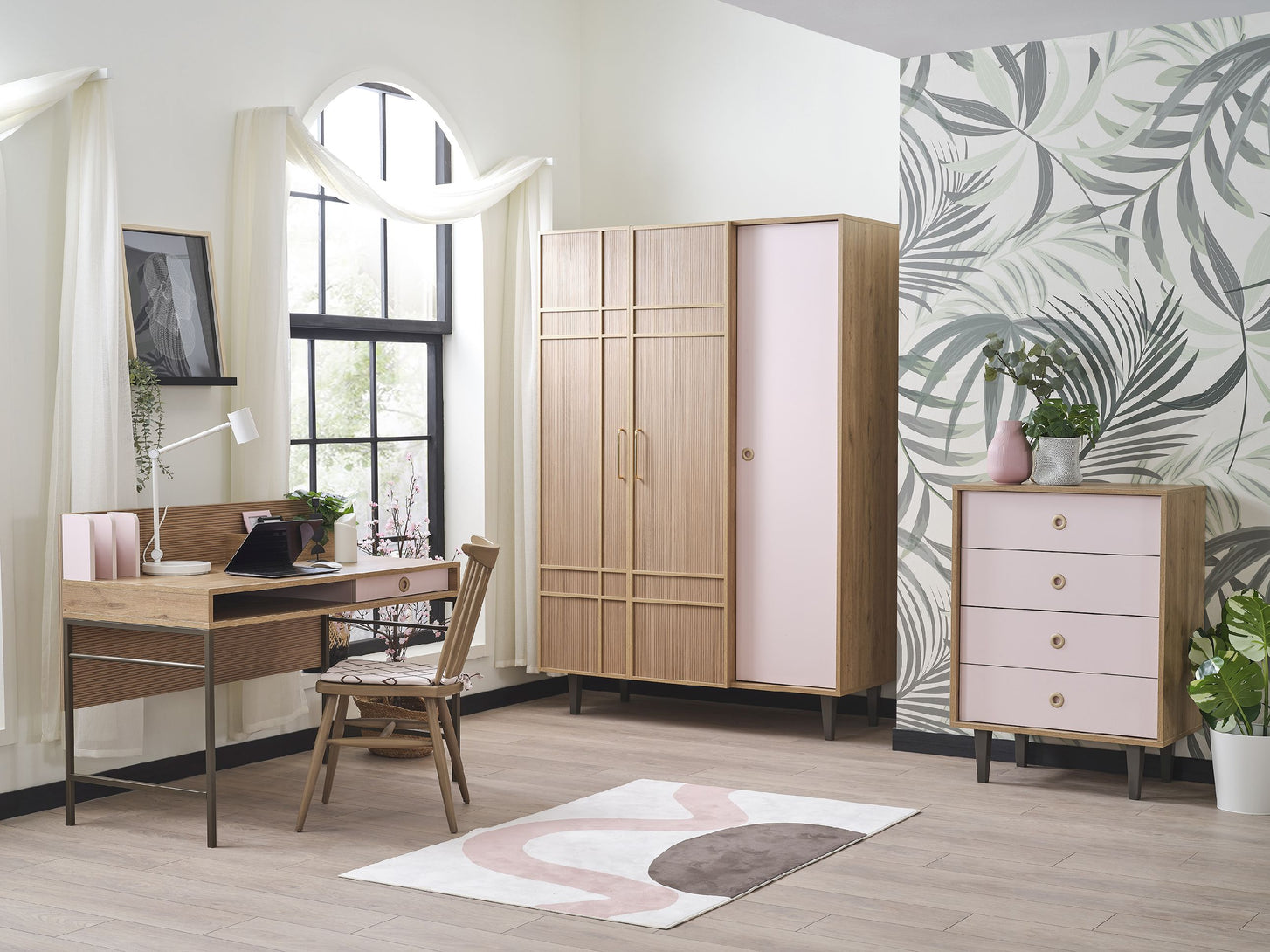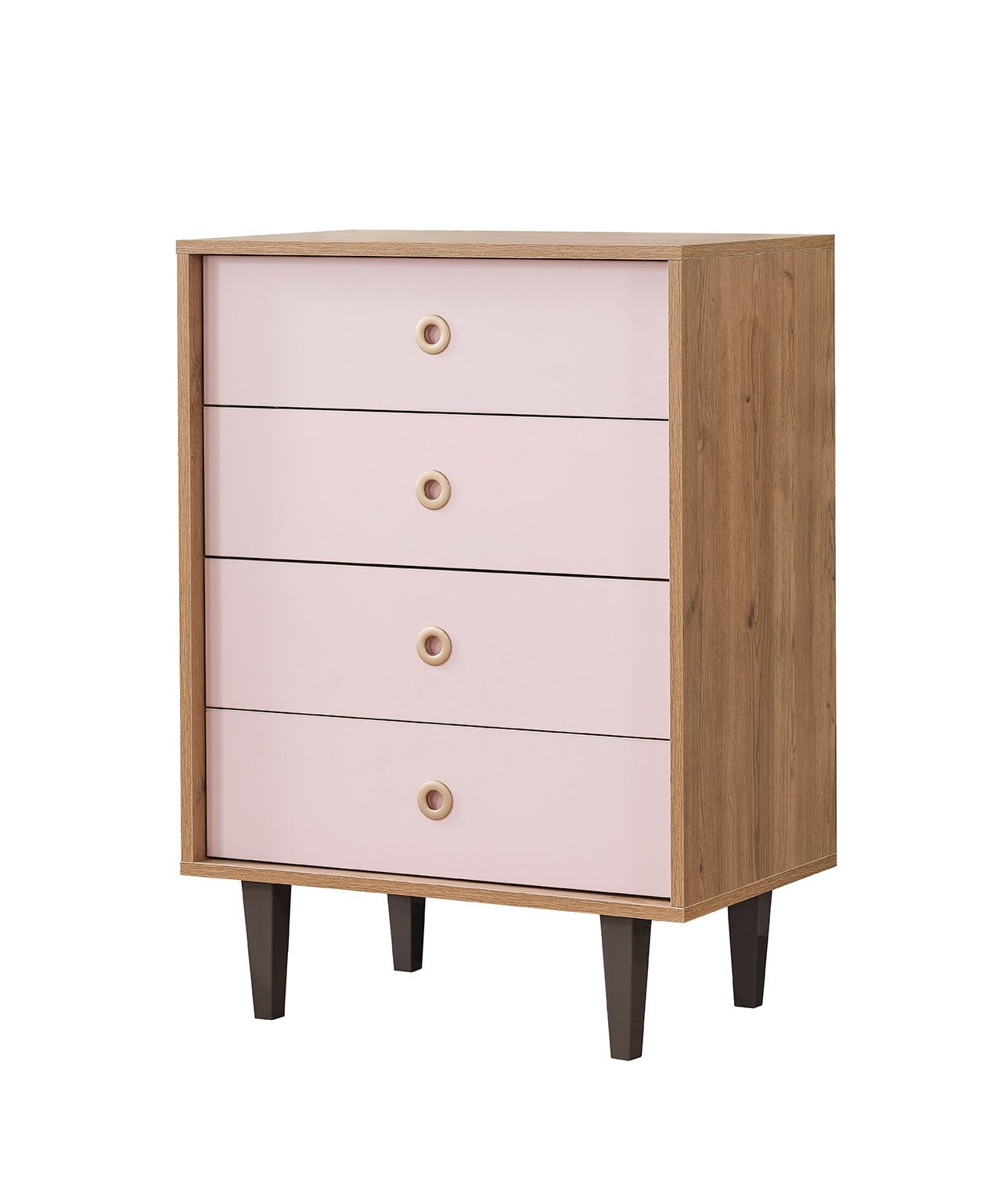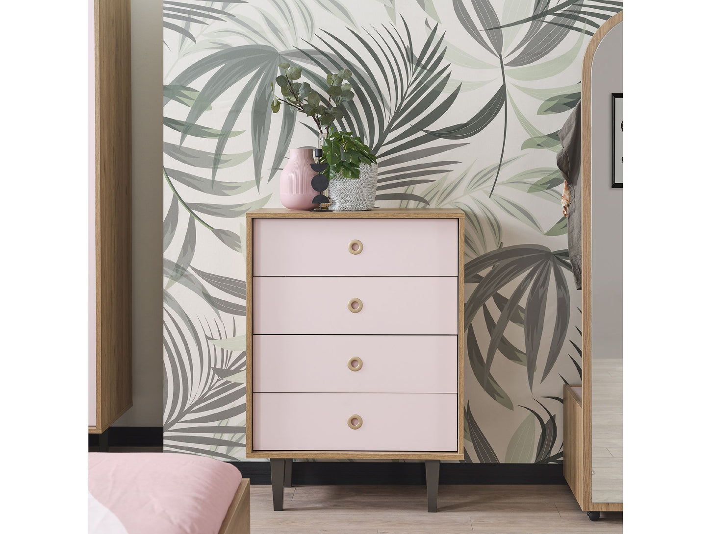 Mehr Stauraum und mehr Stil – das bietet Ihnen die Kommode ALICE. Die vier großzügigen Schubladen sorgen für Ordnung in Ihrem Schlafzimmer, während das elegante Design mit der charakteristischen Holzoptik und den zarten Rosatönen für eine gemütliche Atmosphäre sorgt.