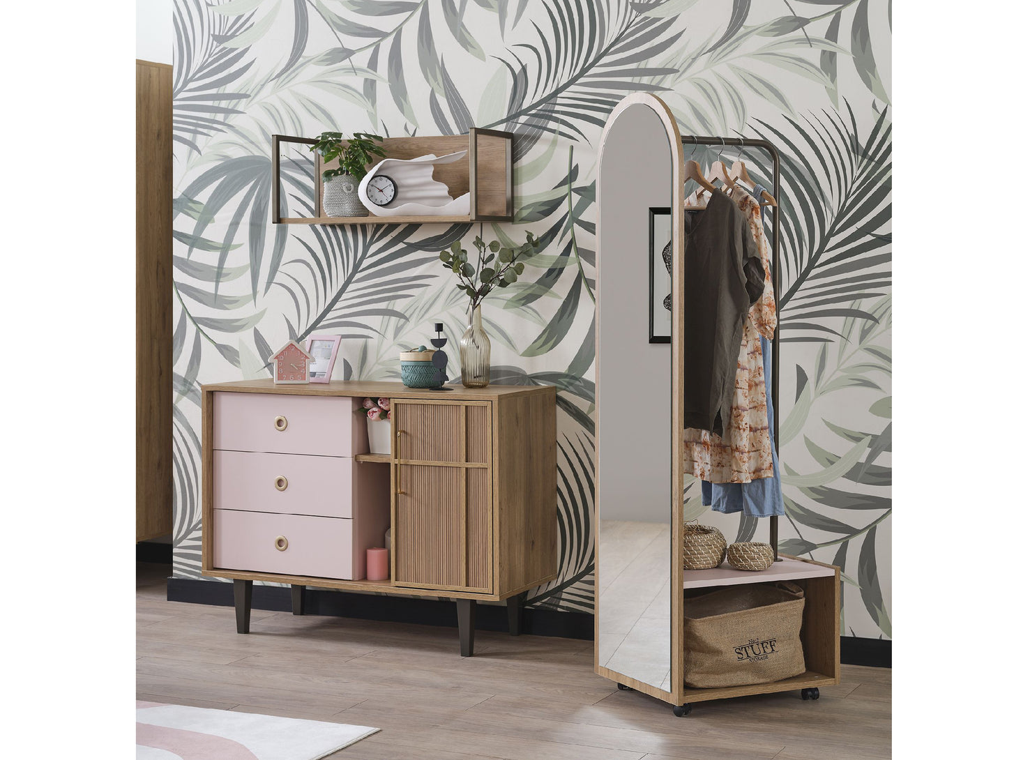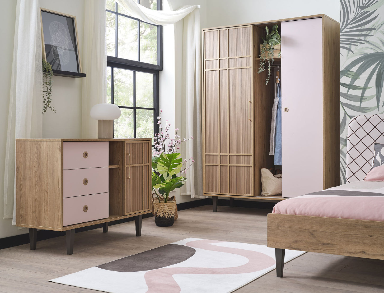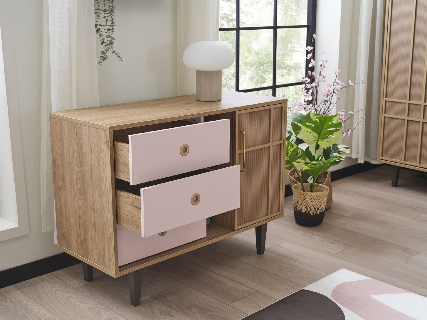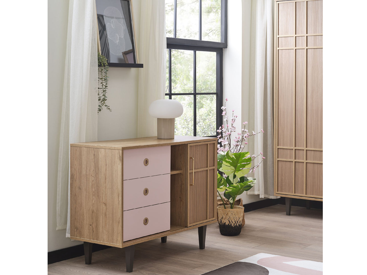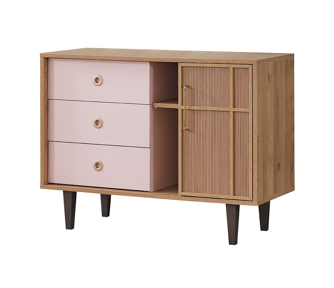 Die Alice Kommode von Kupa vereint Funktionalität mit Ästhetik. Mit ihren drei geräumigen Schubladen und einem Fach hinter der Tür bietet sie reichlich Platz für Kleidung und Spielzeug. Das moderne Design in warmen Holztönen und zarten Pastelltönen macht sie zum Hingucker in jedem Raum.