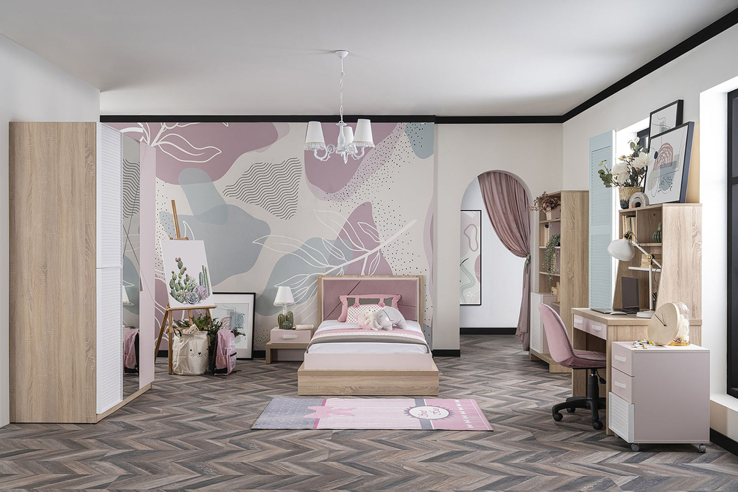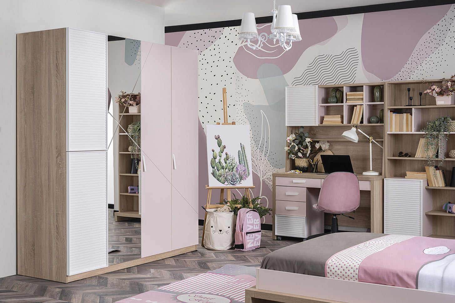 Der 4-türige Kleiderschrank ANGEL CITY von Kupa kombiniert großzügigen Stauraum mit einem zeitlos eleganten Design in Holz, Weiß und Pastellrosa, veredelt durch stilvolle Akzente. Im Inneren sorgen acht geräumige Regalfächer und drei LED-beleuchtete Kleiderstangen für eine optimale und übersichtliche Aufbewahrung von Kleidung und Accessoires. Dank der Soft-Close-Funktion schließen die Türen sanft und geräuschlos.