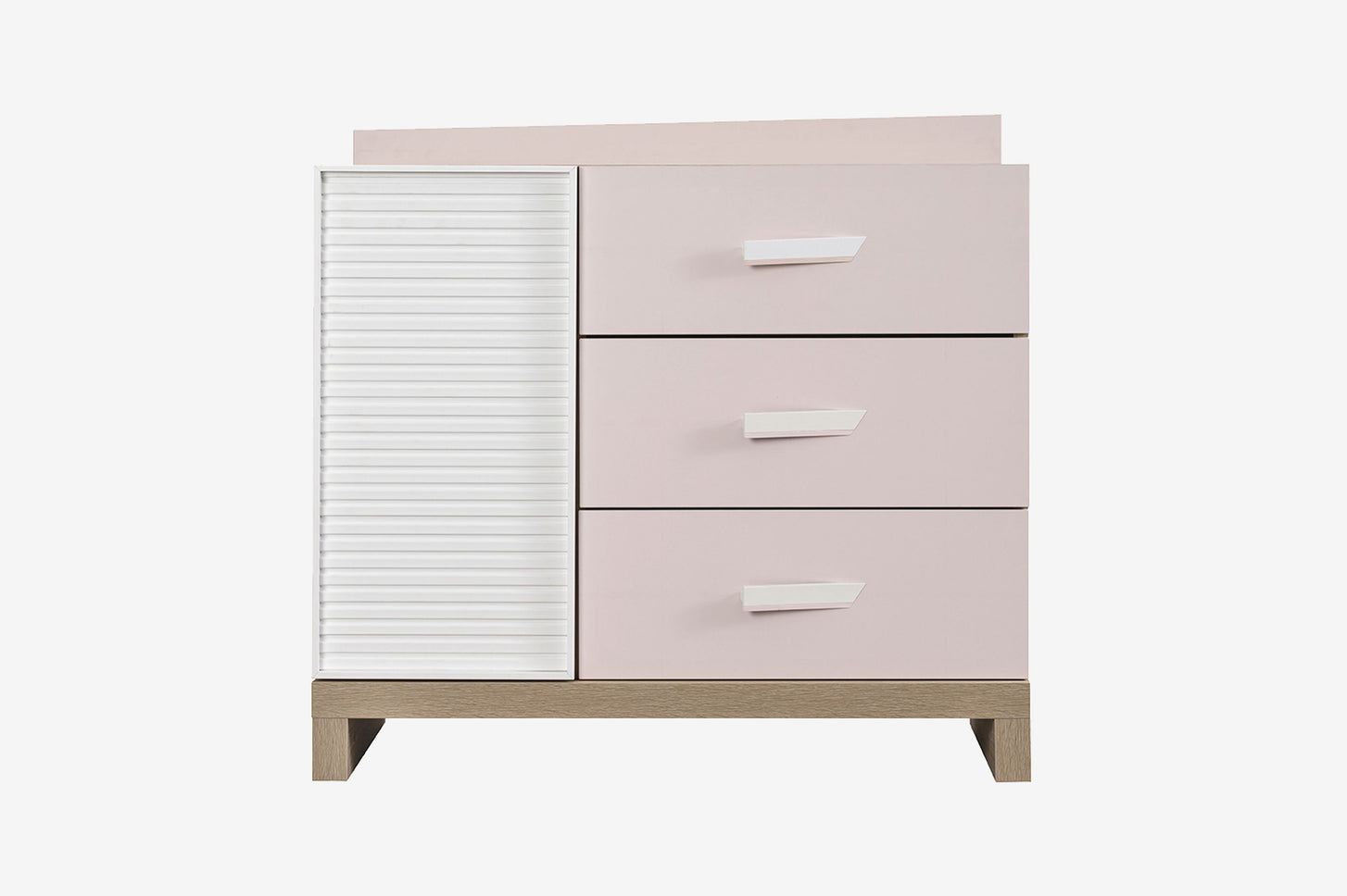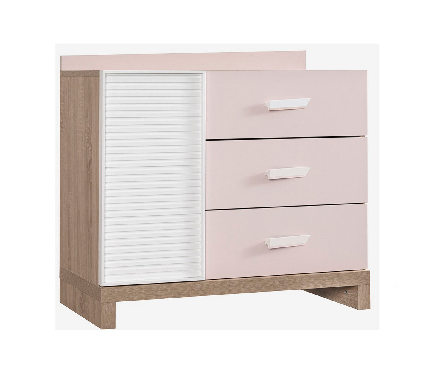 - drei Schubladen in Pastellrosa mit weißem Griff