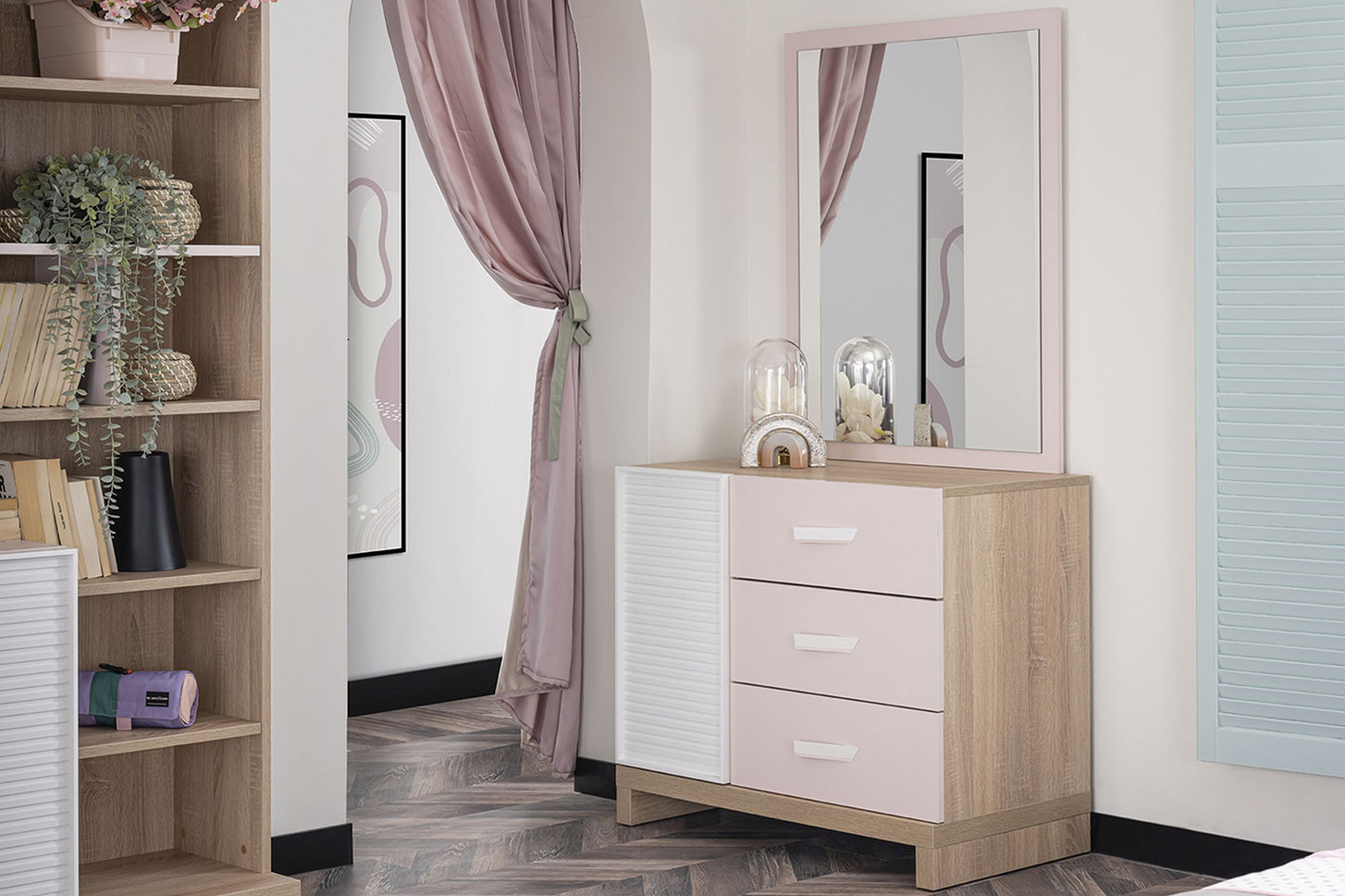 Die Kommode ANGEL CITY von Kupa überzeugt durch ihr freundliches Design und ihre warme Farbgebung. In den drei geräumigen Schubladen und hinter der Tür finden viele Utensilien ihren Platz. Der optional erhältlich Spiegel ergänzt die Kommode perfekt.
