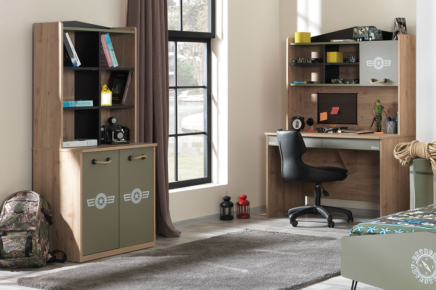 Das Bücherregal CAMP von Kupa ergänzt den Abenteuerlook der Serie perfekt. Gefertigt in heller Holzoptik, verfügt es über zwei grüne Türen mit thematisch passendem UV-Druck und robusten Tauseilen als Türgriffe. Sechs geräumige Regalfächer bieten viel Platz für Bücher, Spielzeug oder Deko. Die Regalböden und Trenner in Schwarz setzen stilvolle Kontraste und unterstreichen das markante, abenteuerliche Design.