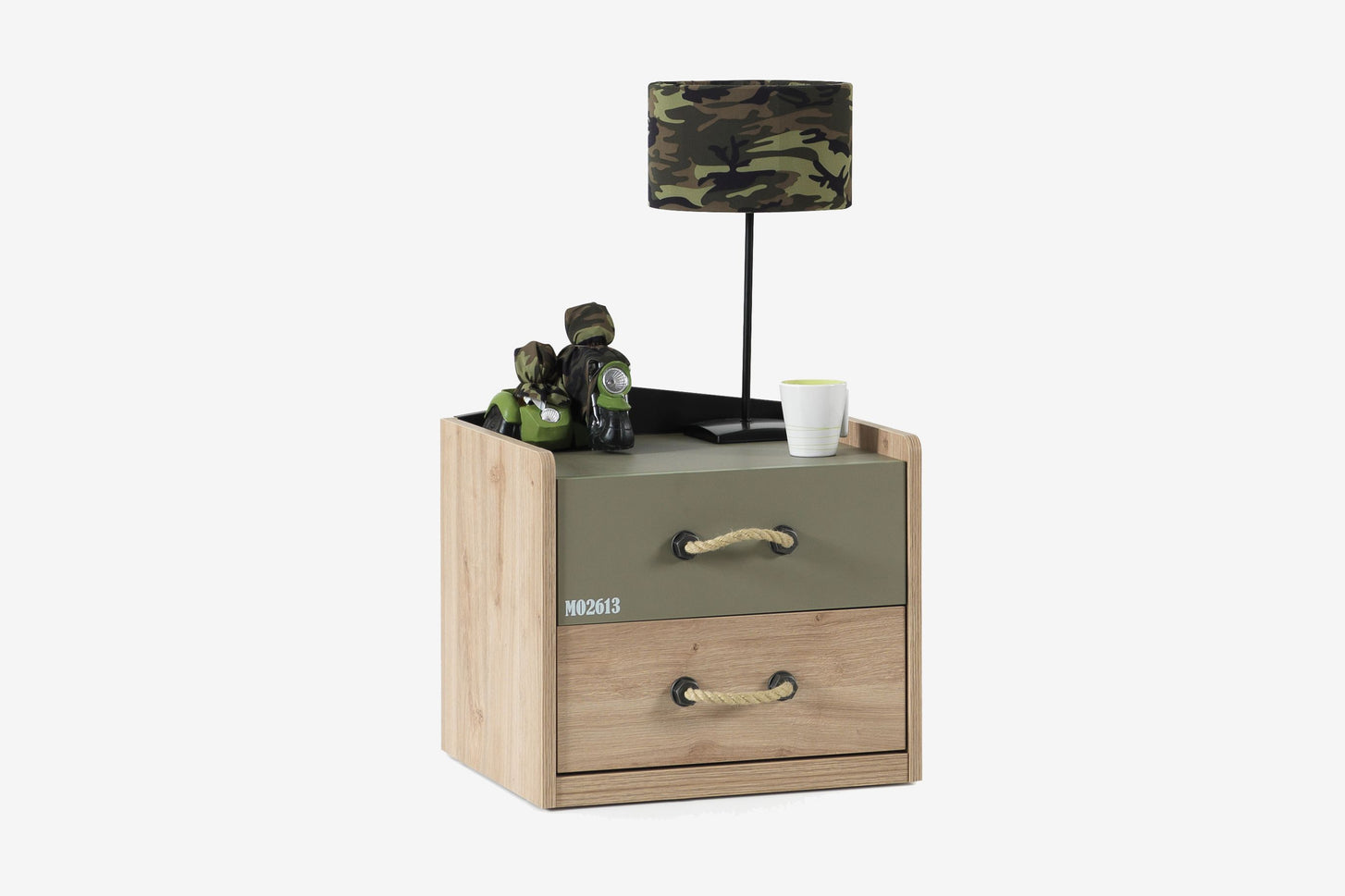 Die Nachtkommode CAMP von Kupa präsentiert sich im robusten Abenteuer-Look mit Holzoptik, einer grünen Schubladenfront und einem Griff aus stabilem Tau – perfekt abgestimmt auf das Camp-Thema. Die zwei geräumigen Schubladen bieten praktischen Stauraum, während die obere Ablagefläche ideal ist für eine Lampe, Bücher oder andere Dinge, die am Bett griffbereit sein sollen.