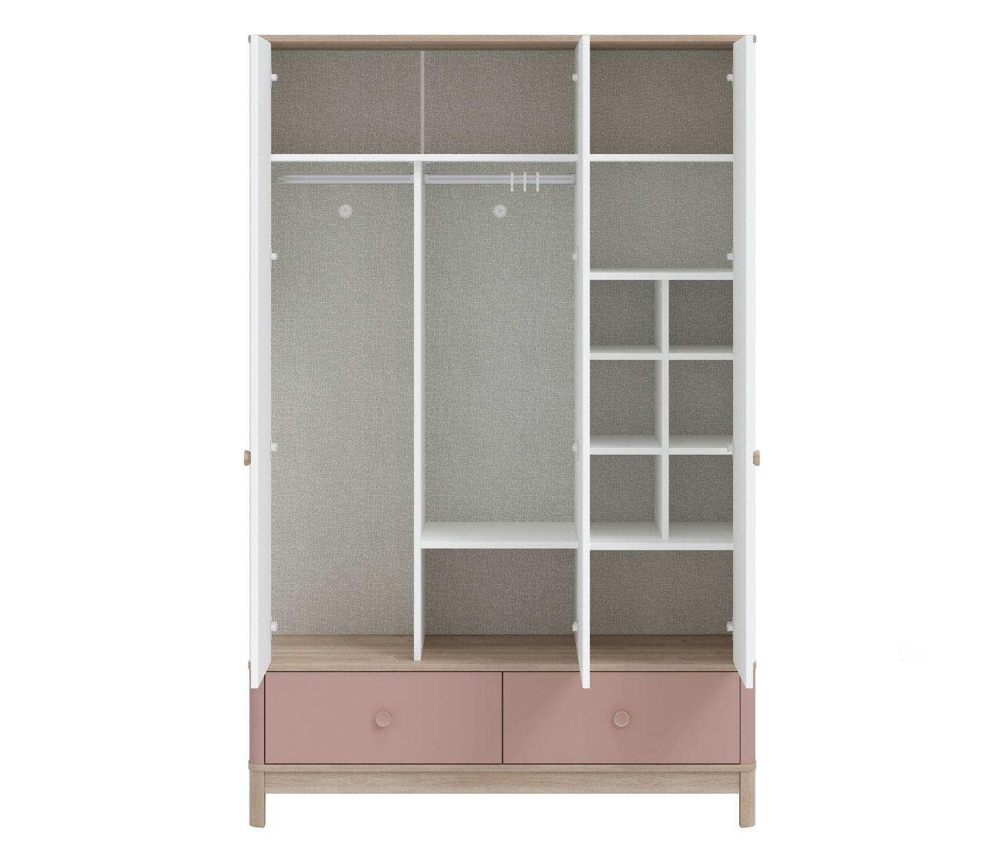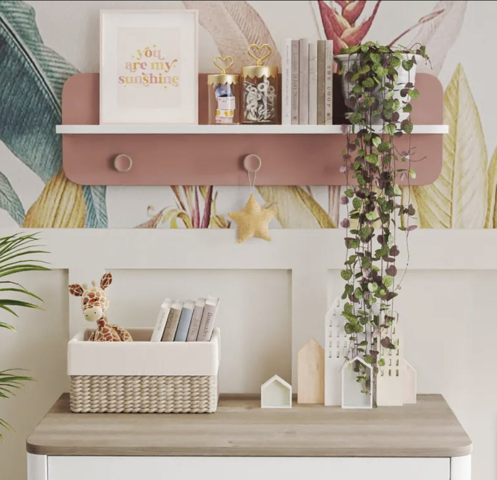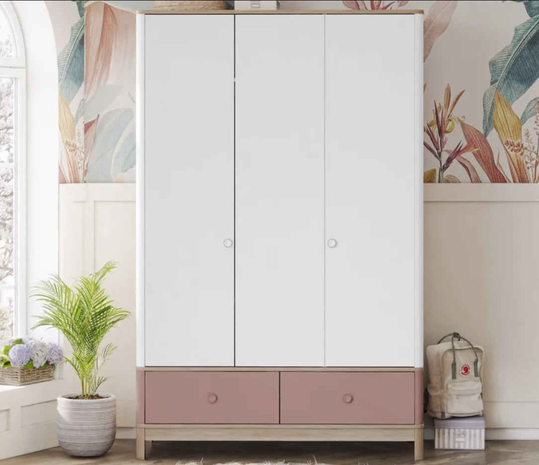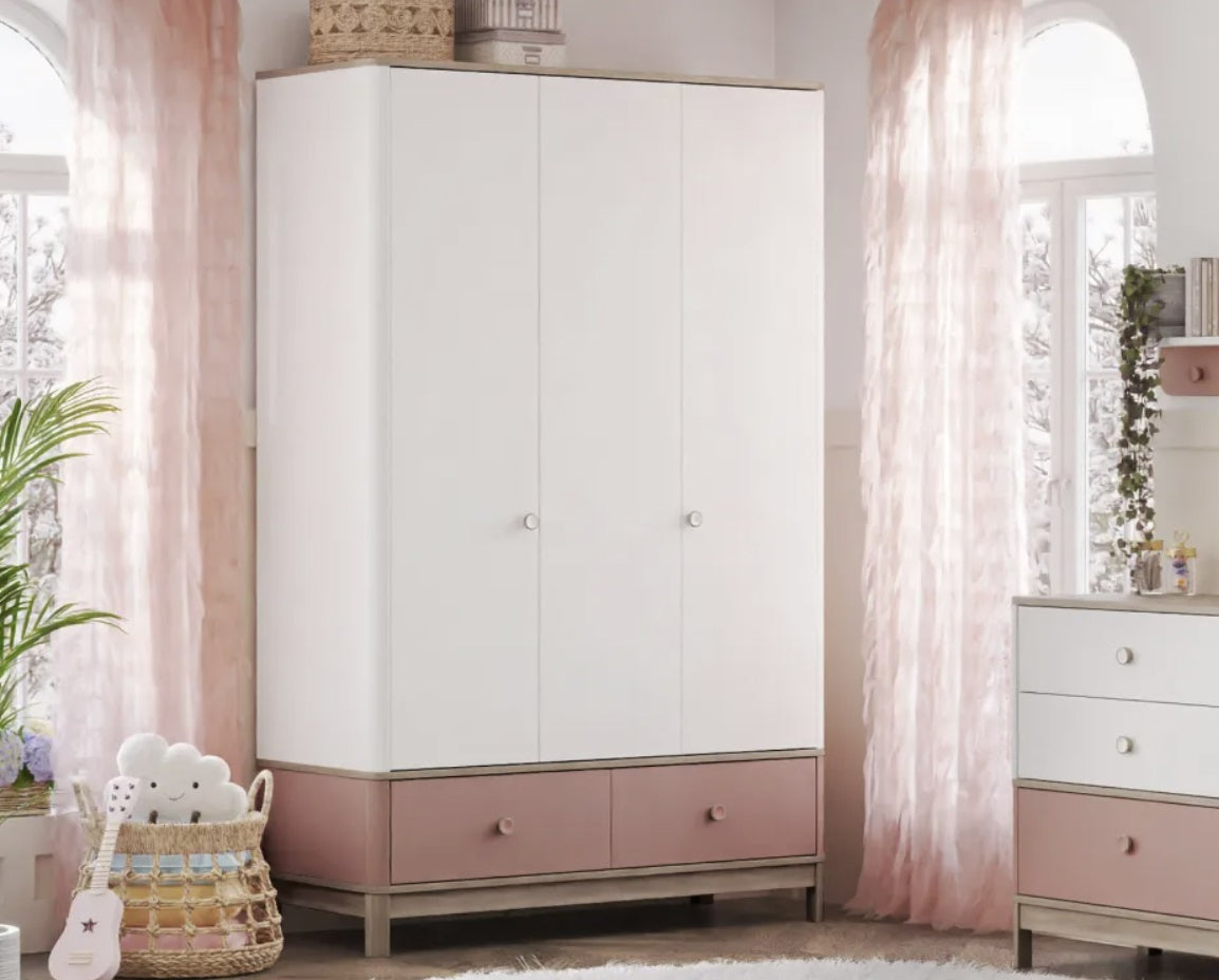 Der geräumige Kleiderschrank mit zwei Kleiderstangen, elf Regalfächern und zwei Schubladen bietet ausreichend Platz für die gesamte Garderobe. Soft-Close-Systeme an Türen und Schubladen sorgen für sanftes Schließen. Die Kommode mit drei geräumigen Schubladen und das Wandregal mit Garderobenknöpfen runden das Set perfekt ab. Die Farbkombination aus Weiß, Rosa und Naturtönen schafft eine warme und harmonische Atmosphäre im Kinderzimmer.