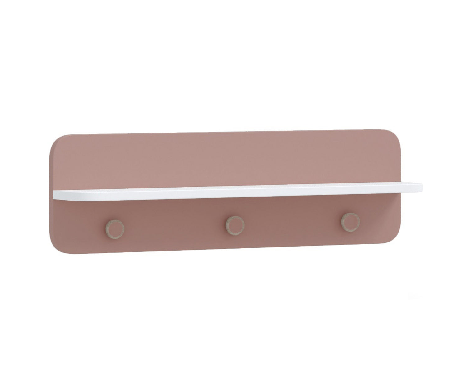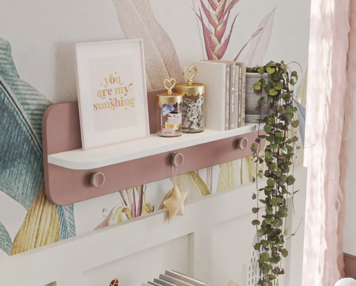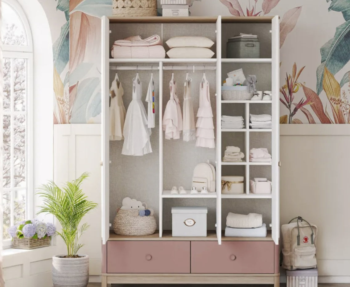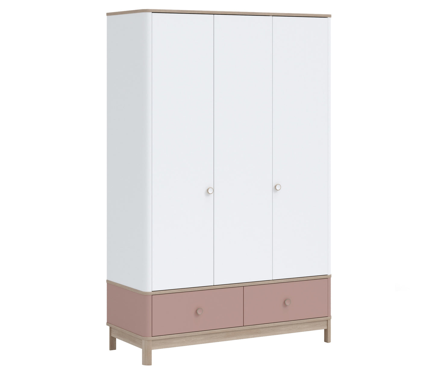 Der geräumige Kleiderschrank mit zwei Kleiderstangen, elf Regalfächern und zwei Schubladen bietet ausreichend Platz für die gesamte Garderobe. Soft-Close-Systeme an Türen und Schubladen sorgen für sanftes Schließen. Die Kommode mit drei geräumigen Schubladen und das Wandregal mit Garderobenknöpfen runden das Set perfekt ab. Die Farbkombination aus Weiß, Rosa und Naturtönen schafft eine warme und harmonische Atmosphäre im Kinderzimmer.
