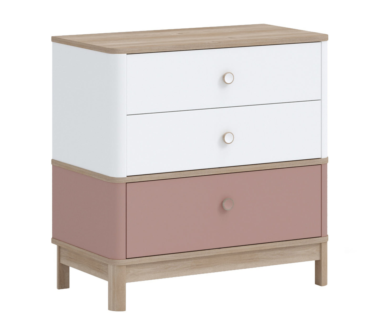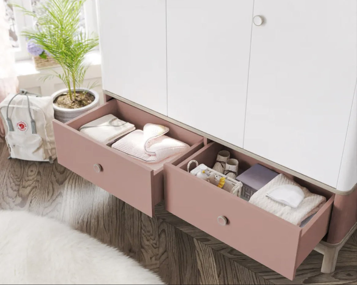 zwei Schubladen mit weißer Front, eine Schublade mit pinker Front