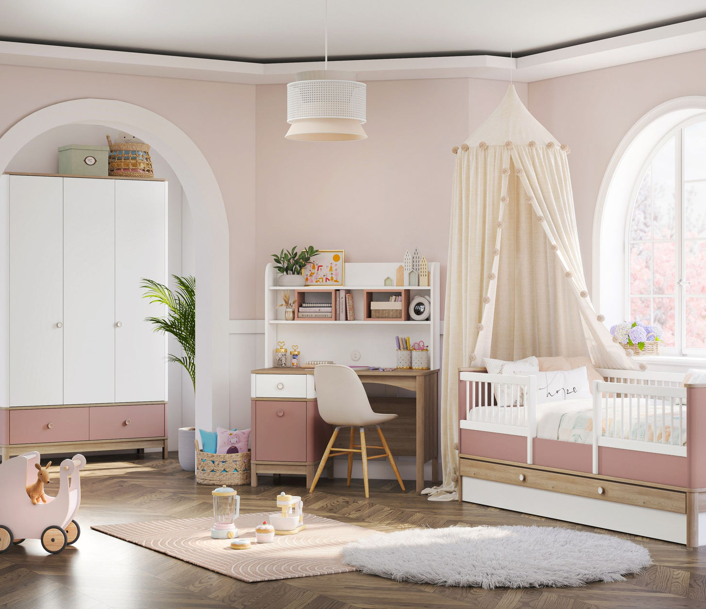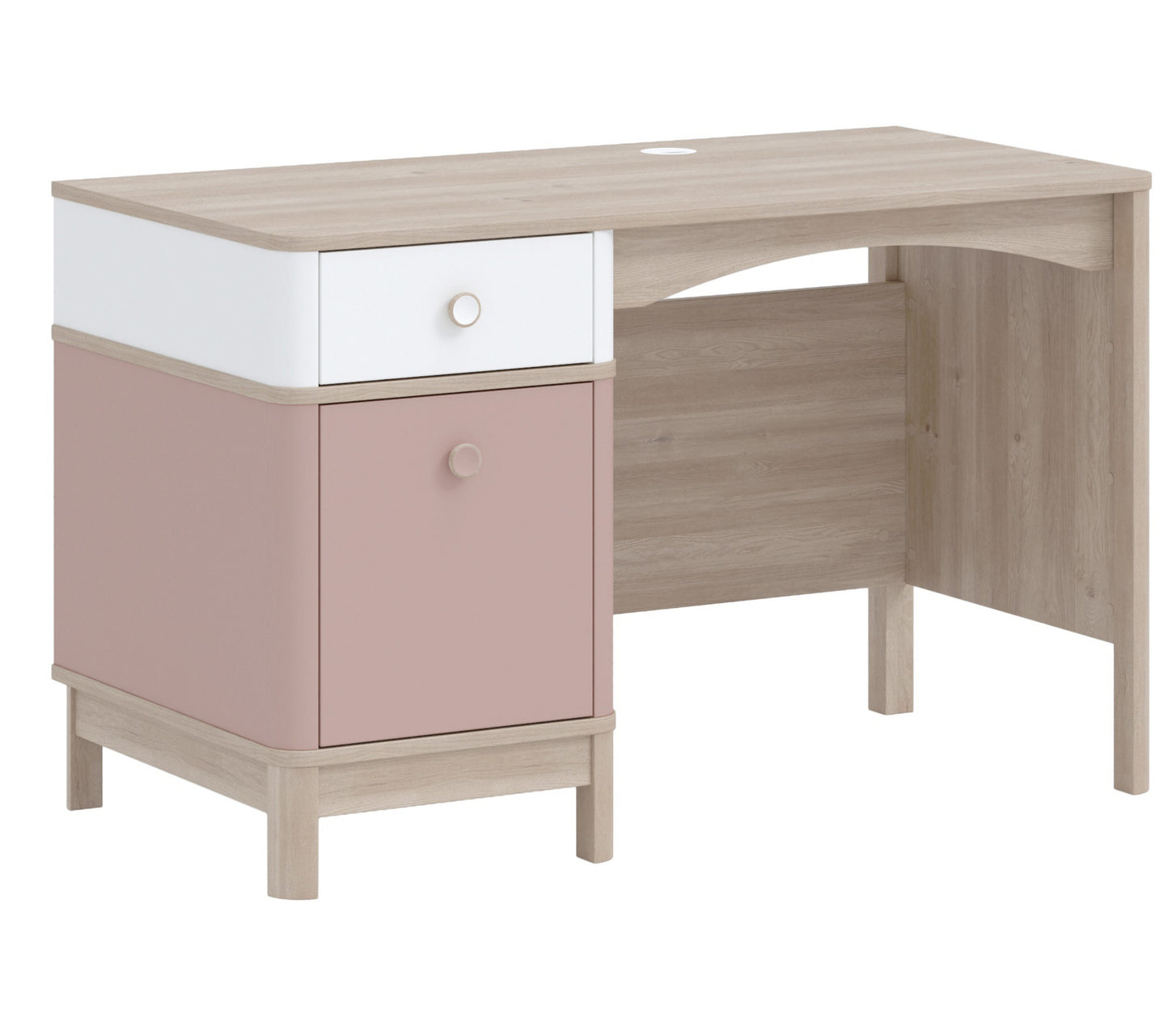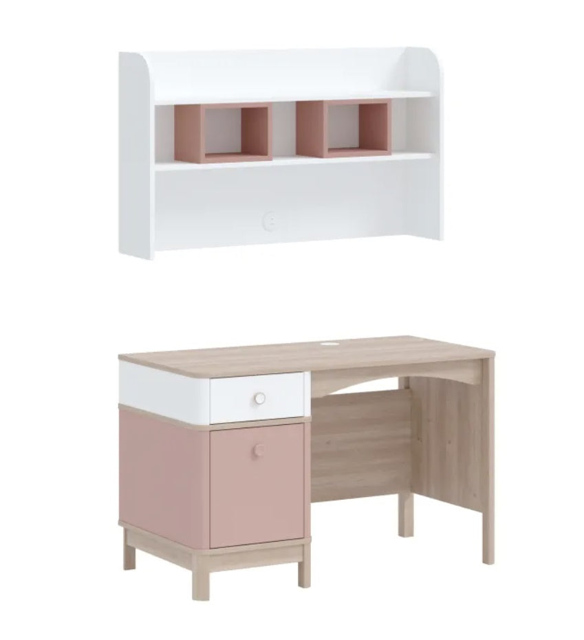 Die Schublade und das Fach hinter der Tür bieten Stauraum für Schreibutensilien und andere wichtige Dinge und sind mit Soft-Close-Mechanismus ausgestattet. Das harmonische Design in Weiß, Naturtönen und Rosa fügt sich perfekt in jedes Zimmer ein. Zusammen mit dem passenden Wandregal und Bücherregal entsteht ein vollständiger und inspirierender Arbeitsplatz.