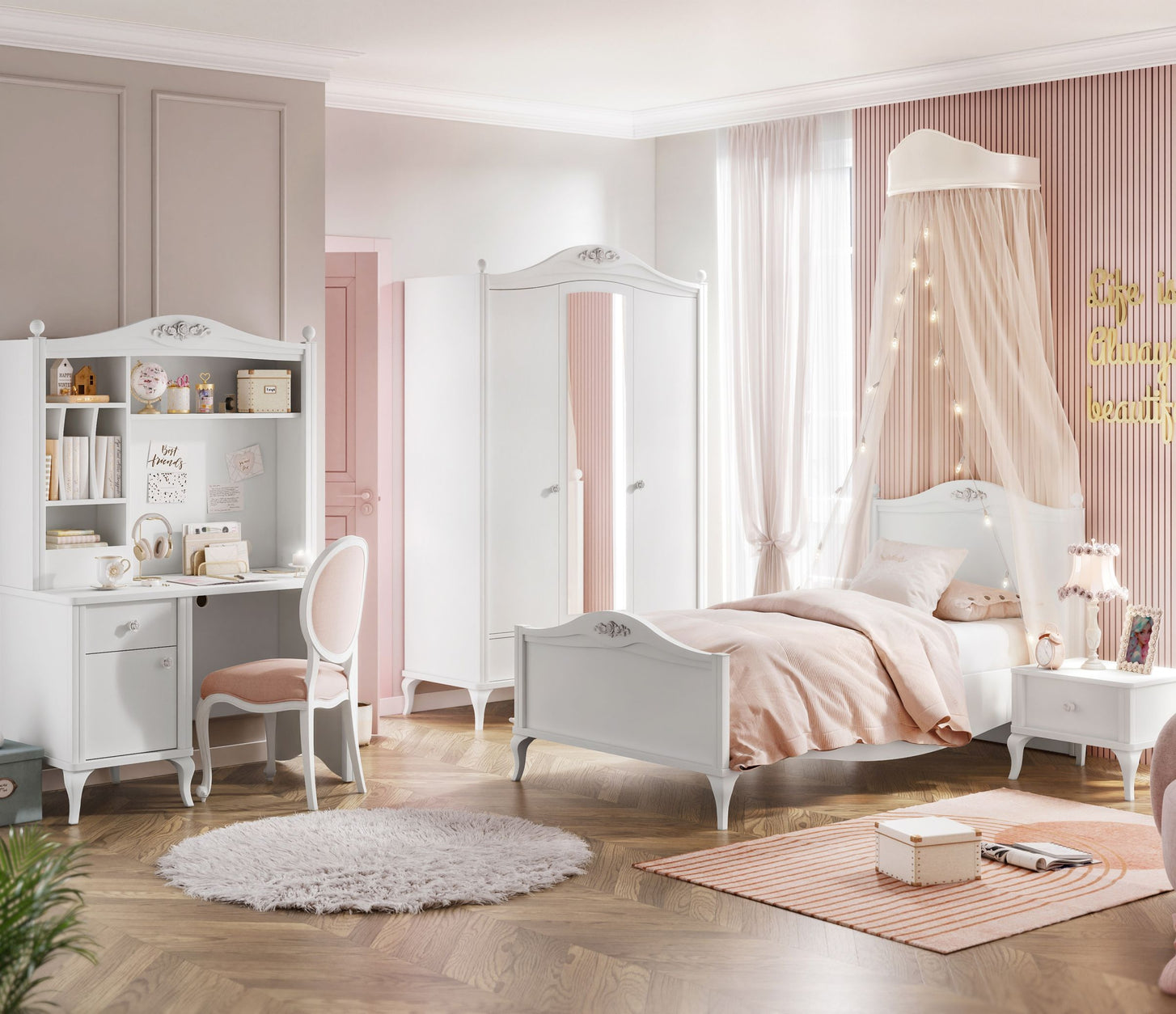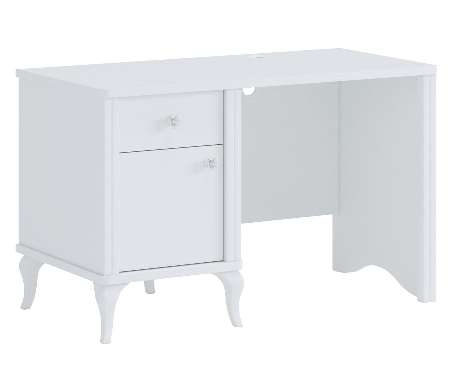 Der weiße Schreibtisch JASMIN im charmanten Landhausstil bietet eine großzügige Arbeitsfläche und viel Stauraum für Arbeitsmaterialien. Hinter der Tür und in der geräumigen Schublade, beide mit hübschen floralen Griffen verziert, finden alle wichtigen Utensilien ihren Platz. Zusammen mit dem passenden Schreibtischaufsatz und Bücherregal entsteht ein harmonischer und funktionaler Arbeitsplatz im romantischen Landhausstil.