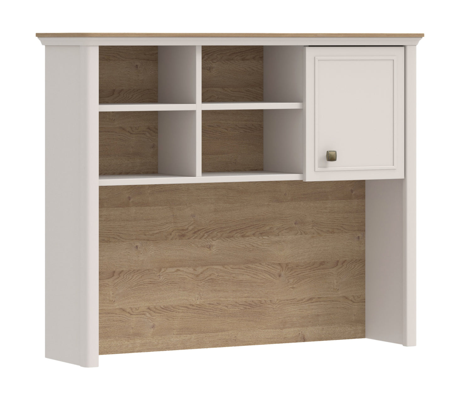 Der Schreibtisch-Aufsatz MUGLA ist die ideale Ergänzung für den Schreibtisch Mugla und schafft zusätzlichen Stauraum und Ordnung am Arbeitsplatz. Mit seinem charmanten Design im Landhausstil, der Kombination aus Cremeweiß und natürlichen Holztönen, fügt er sich nahtlos in das Gesamtbild ein. Vier offene Regale bieten Platz für Bücher, Ordner oder Deko-Objekte, während hinter der Tür weitere Utensilien diskret verstaut werden können.