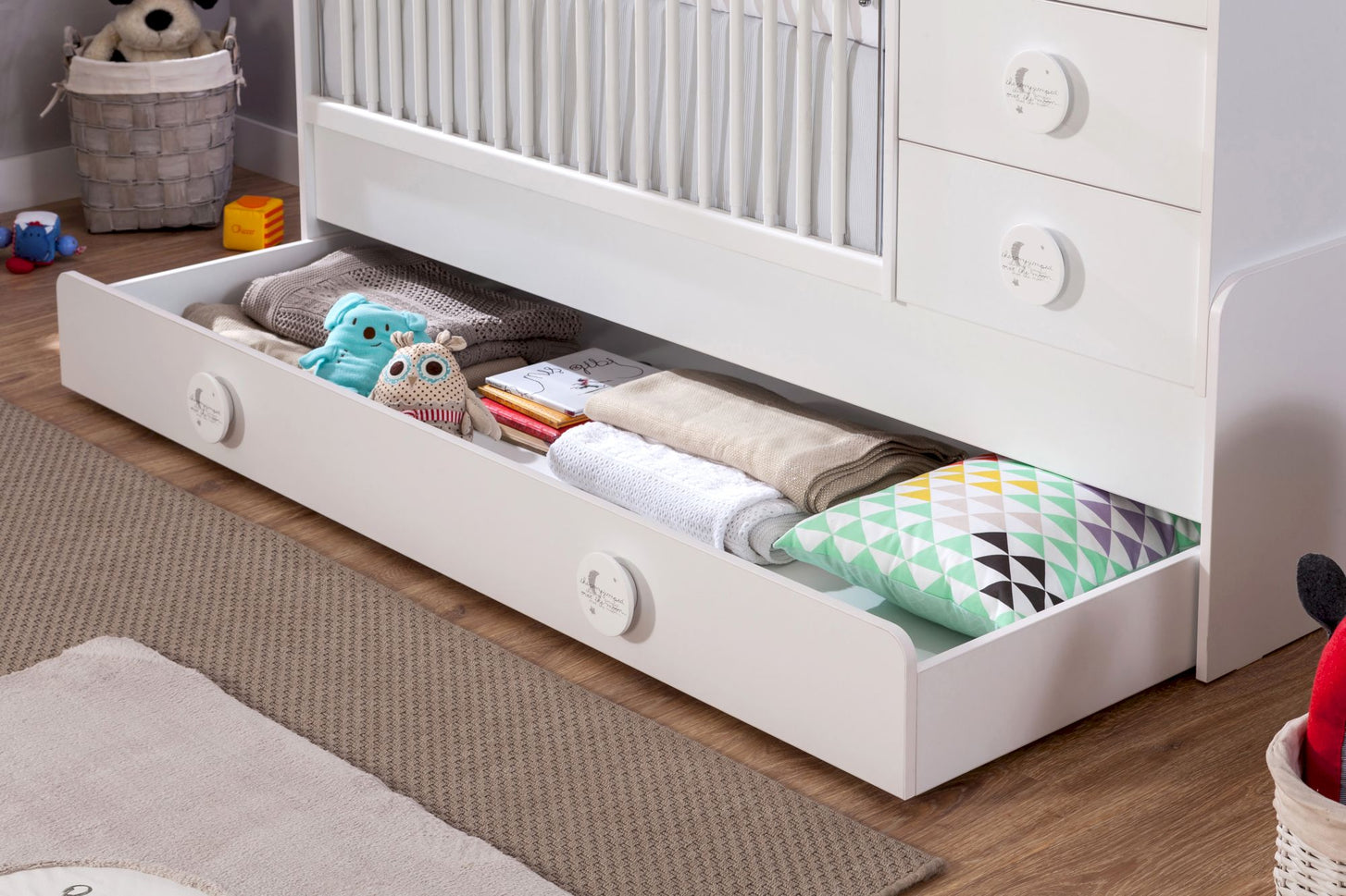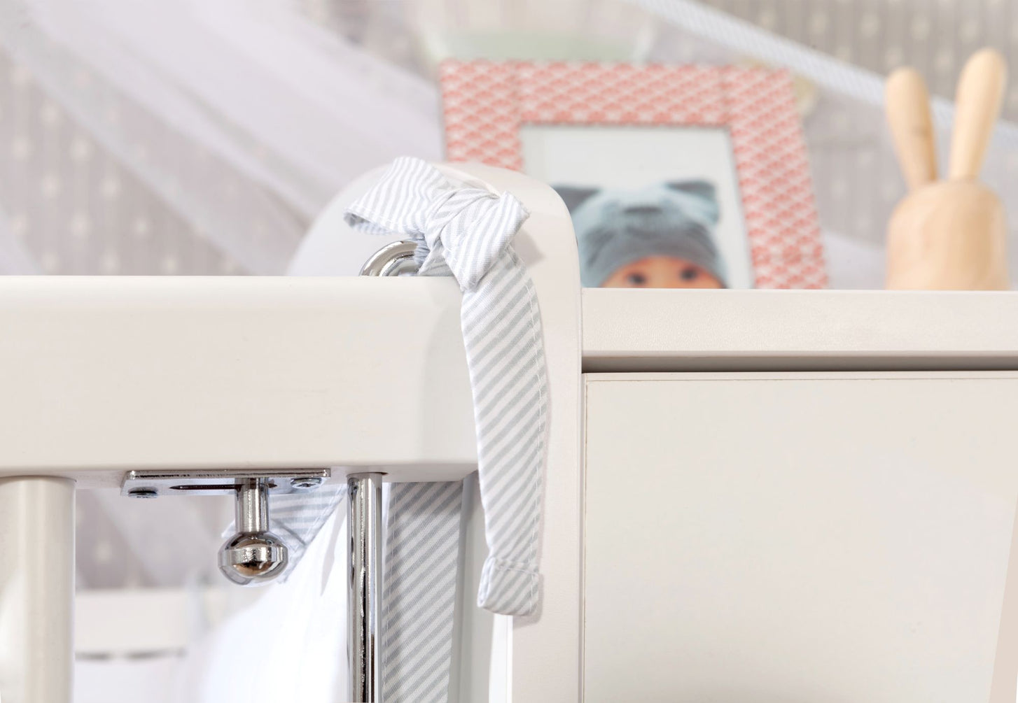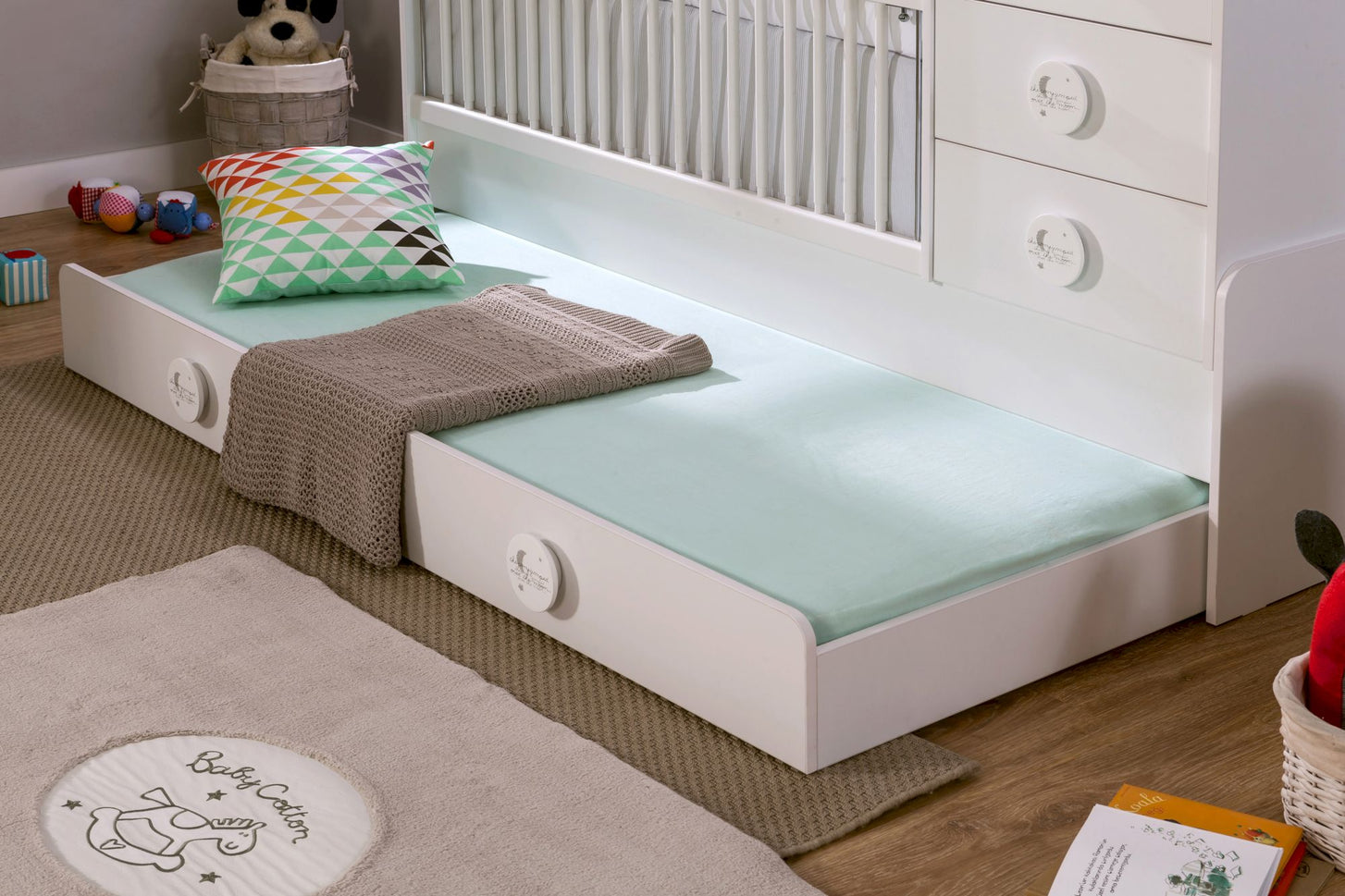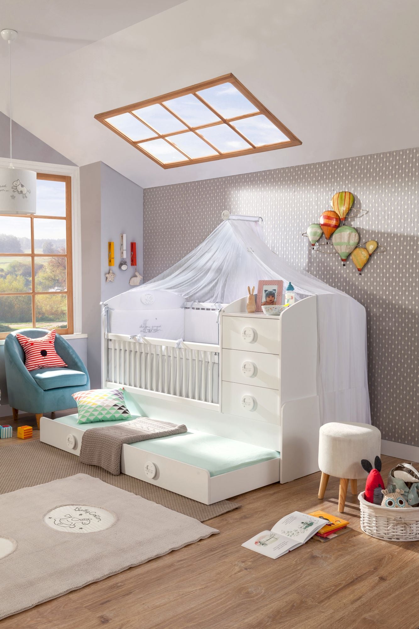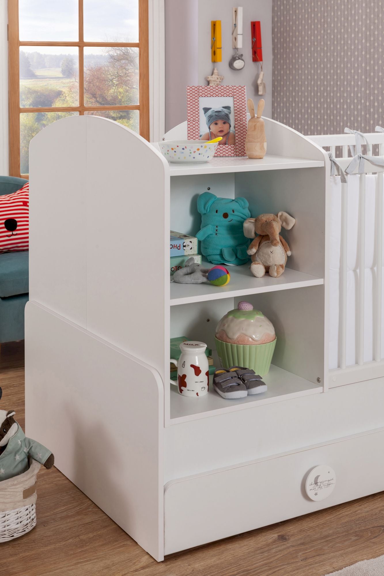 Die Farbe weiß ist zeitlos elegant, wie unsere Babyzimmer-Serie "Baby Cotton" eindrucksvoll zeigt. Pflegeleichte Oberflächen und frei von jeglichen Schad- und Giftstoffen ist es zudem perfekt für die Kleinsten geeignet. Dieses Babybett wächst sozusagen mit. Am Anfang bietet es mit einer Liegefläche von 80x130 cm genügend Platz für das Neugeborene. Eine Wickelkommode wurde in das stabile Bett bereits mit integriert. Die Gitterfront lässt sich leicht abmontieren. Sobald das Kind größer wird, lässt sich das Bett mühelos auf eine Liegefläche von 80x180 cm erweitern. Die ehemalige Wickelkommode verwandelt sich dann in zwei kleine Regale.