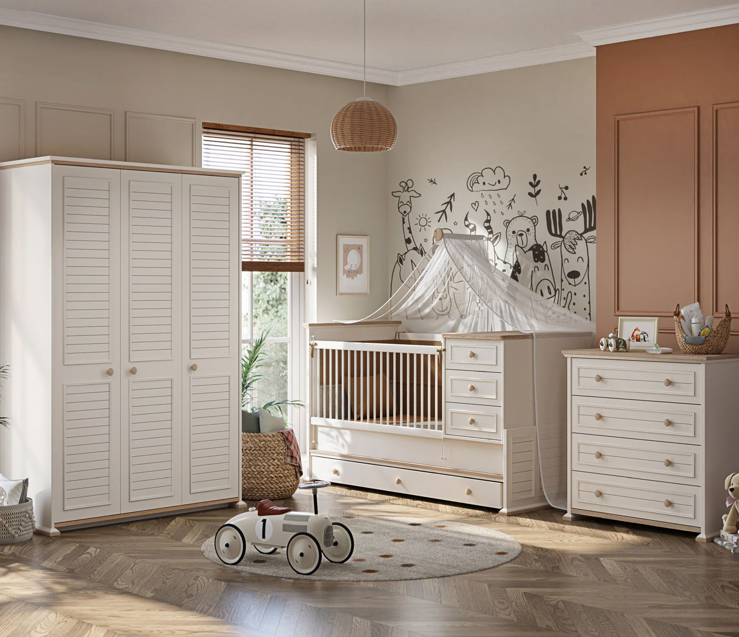 in cremeweiß-naturfarben gehaltenes Babybett