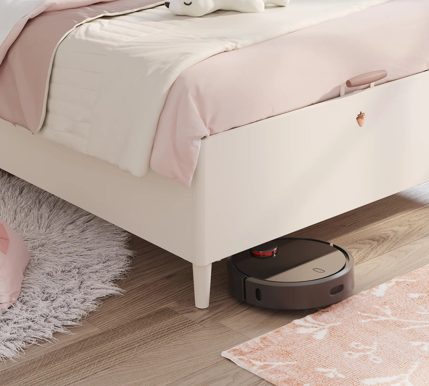 Neben der optischen Raffinesse überzeugt das Bett durch praktische Highlights. Der integrierte Bettkasten lässt sich dank der hochwertigen Hydraulik-Öffnung kinderleicht bedienen. So verschwinden Bettwäsche, Kissen oder Spielzeug im Handumdrehen, und das Zimmer bleibt stets aufgeräumt.