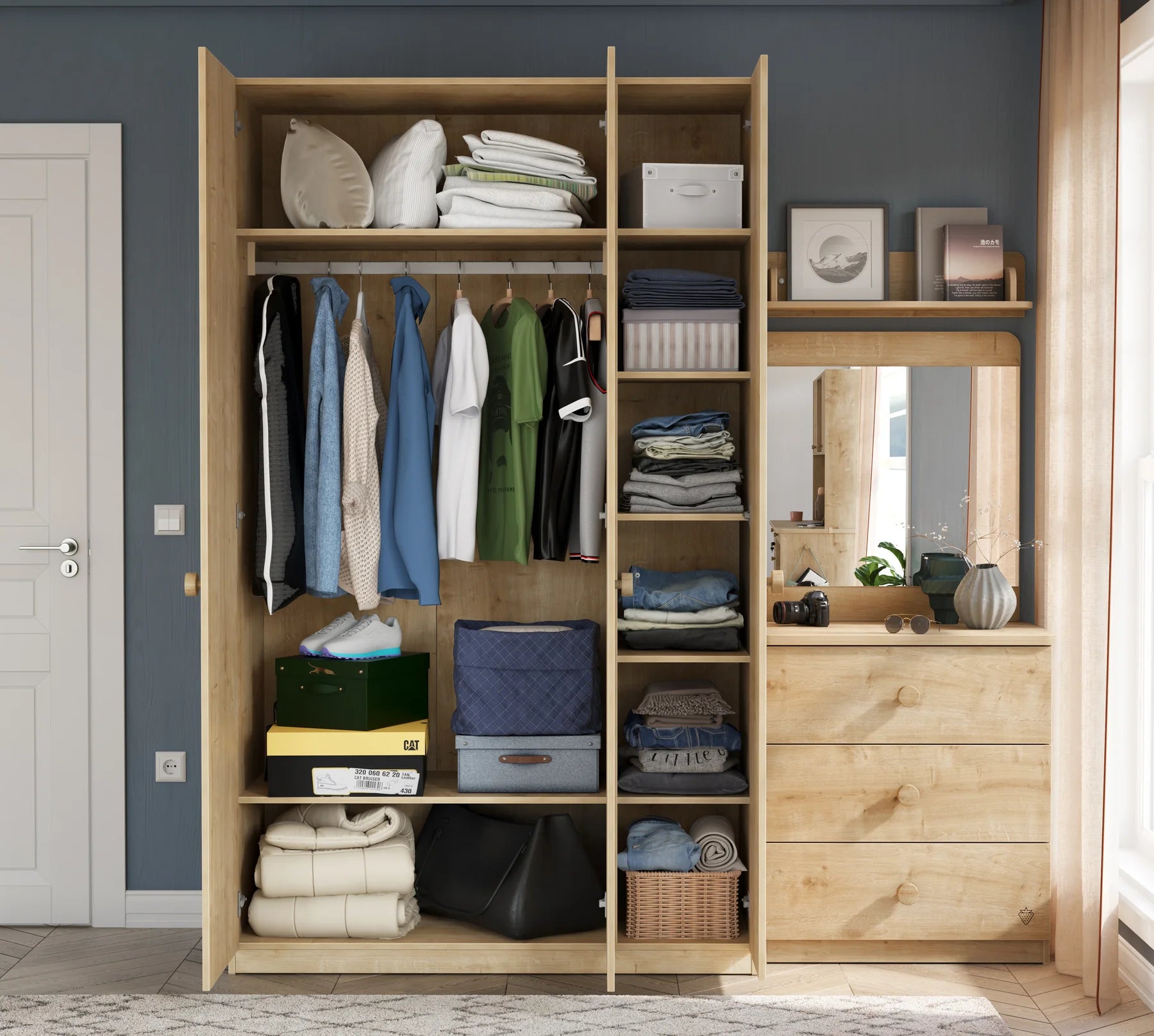 Suchen Sie eine stilvolle Lösung für Ihre Garderobe? Dieser geräumige 3-türige Kleiderschrank überzeugt durch seine warme Holzoptik und ein intelligentes Innenleben. Ob als harmonische Ergänzung im Landhausstil oder als moderner Akzent im Mix-and-Match-Design – dieses Möbelstück wertet jeden Raum optisch auf.
