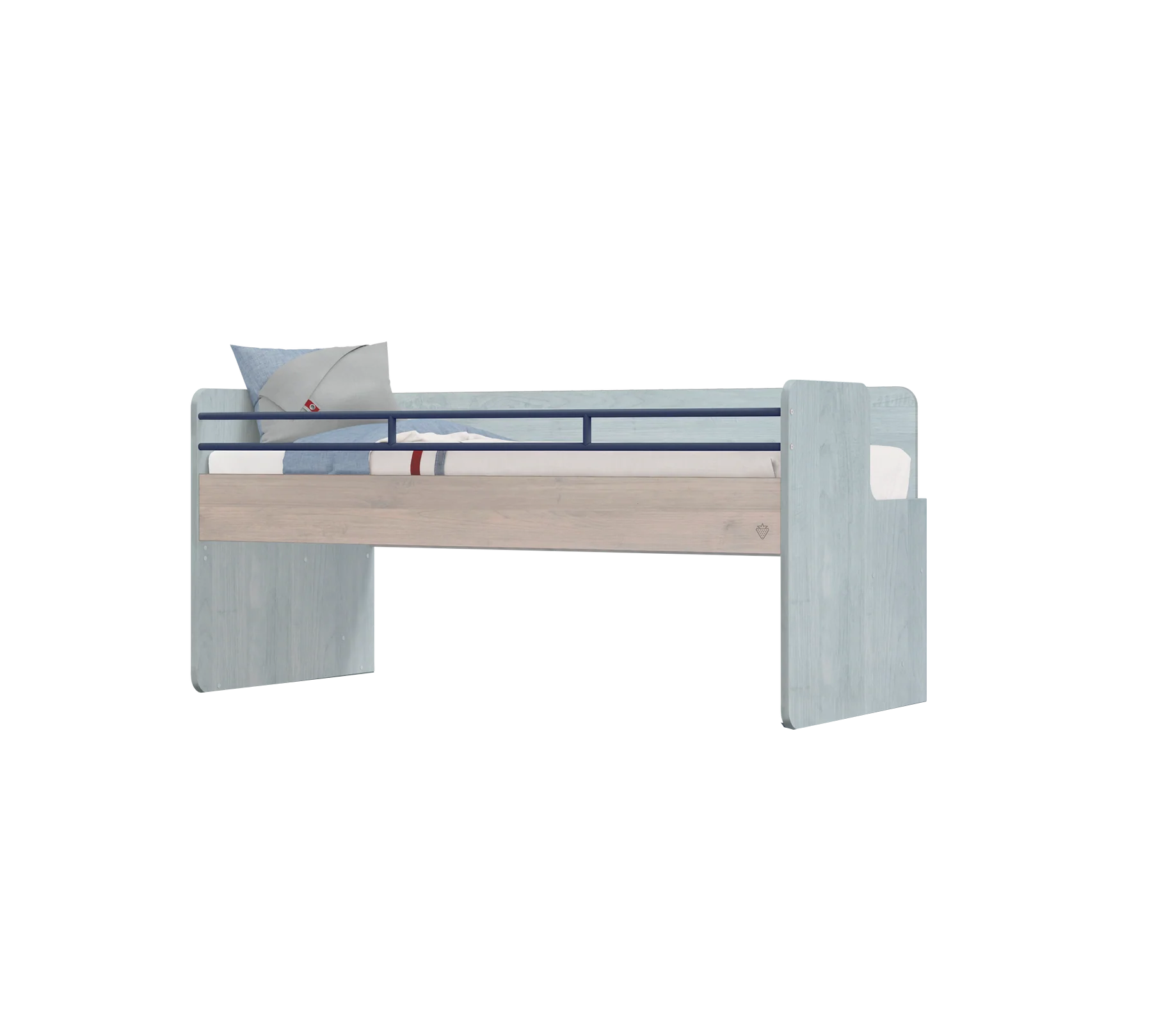 Praktische Extras: Ein integriertes Ablagefach bietet Platz für das Lieblingsbuch oder das Smartphone. Die mitgelieferten Metallgeländer sorgen für Sicherheit (z. B. bei der Nutzung als oberes Etagenbett) und sind bei Bedarf einfach abmontierbar.
