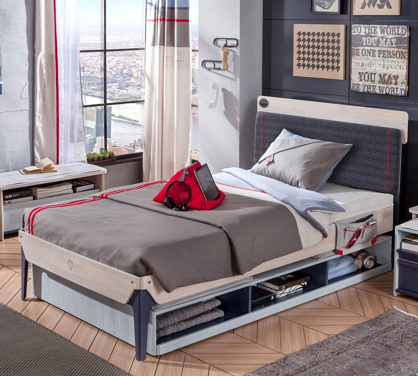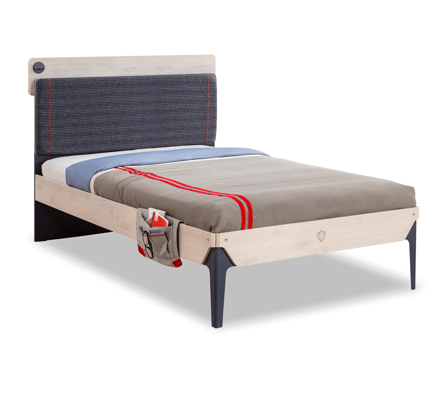 Das Kinderbett Trio ist nicht nur ein optisches Highlight, es ist auch noch überaus funktionell. Dank der seitlich angebrachten Stofftasche lassen sich Handy, Ladekabel, Notizbuch oder MP3- Player in greifbarer Nähe verstauen. Das Kopfteilposter in den Farben blau und grau lässt sich ganz einfach durch ein Klettverschluss abnehmen und wenden. Eine interessante Ergänzung zum Bett ist das Ausziehbare Unterbett, welches Sie bei uns im Onlineshop optional erwerben können.