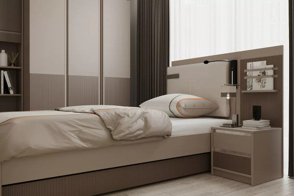 Das SHADOW Jugendbett von Kupa vereint Komfort und zeitloses Design in Beige und Creme. Es bietet eine großzügige Liegefläche von 120 x 200 cm, ein gepolstertes Kopfteil und eine höhenverstellbare Leselampe für zusätzlichen Komfort. Die integrierte Liegeplatte dient als Lattenrost und sorgt für zusätzlichen Schlafkomfort. Ideal für ein stilvolles und funktionales Jugendzimmer.