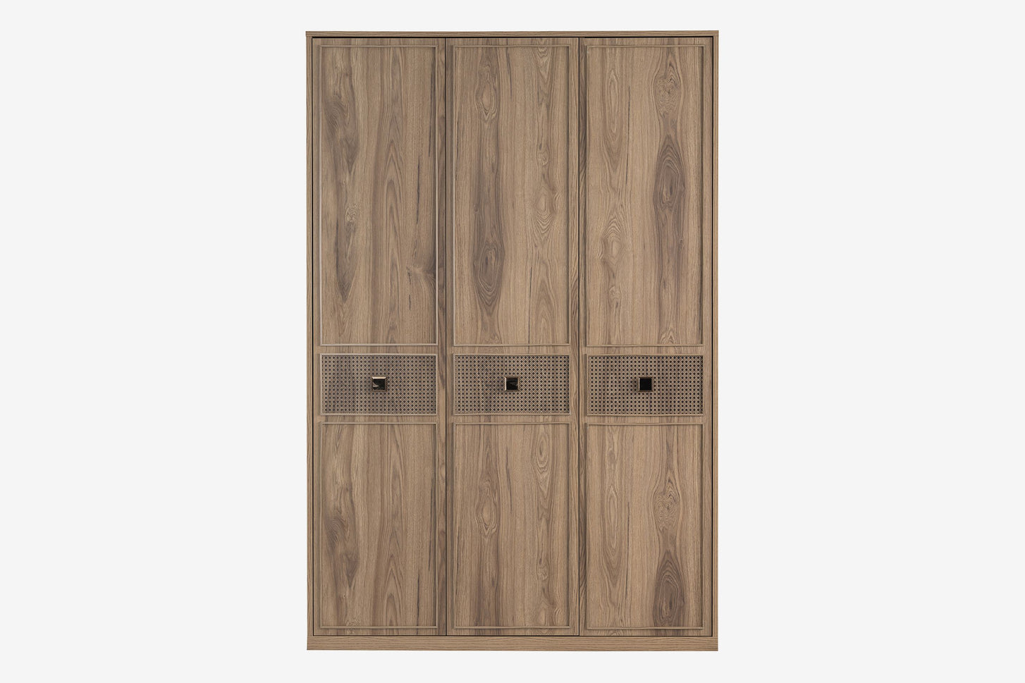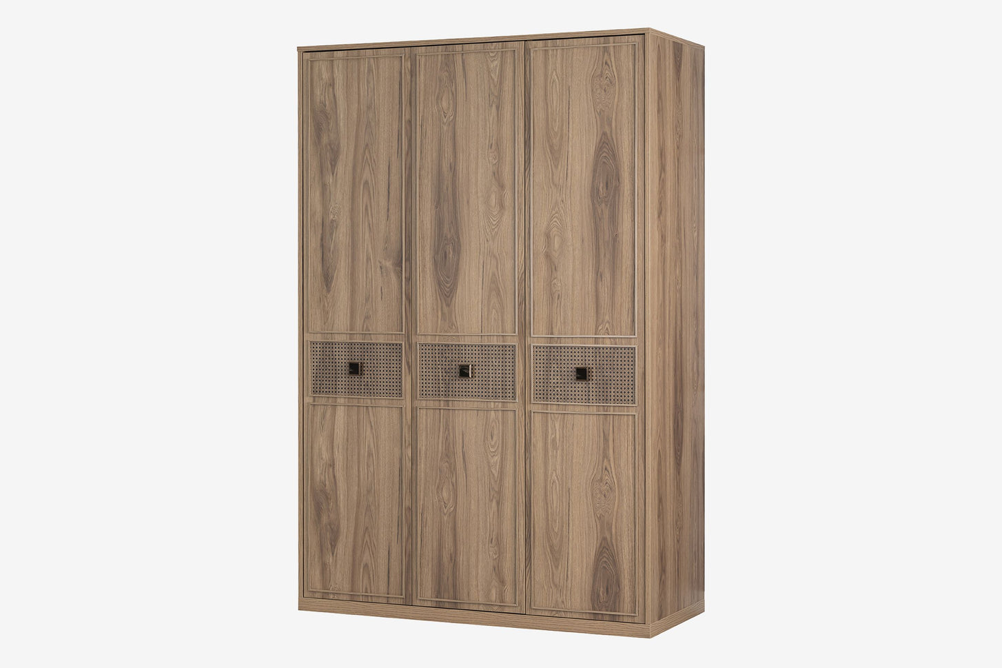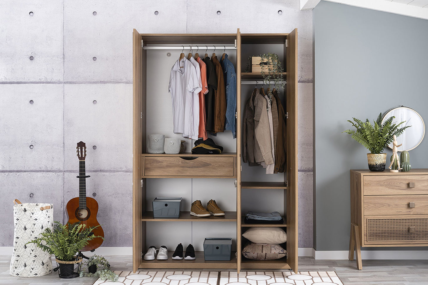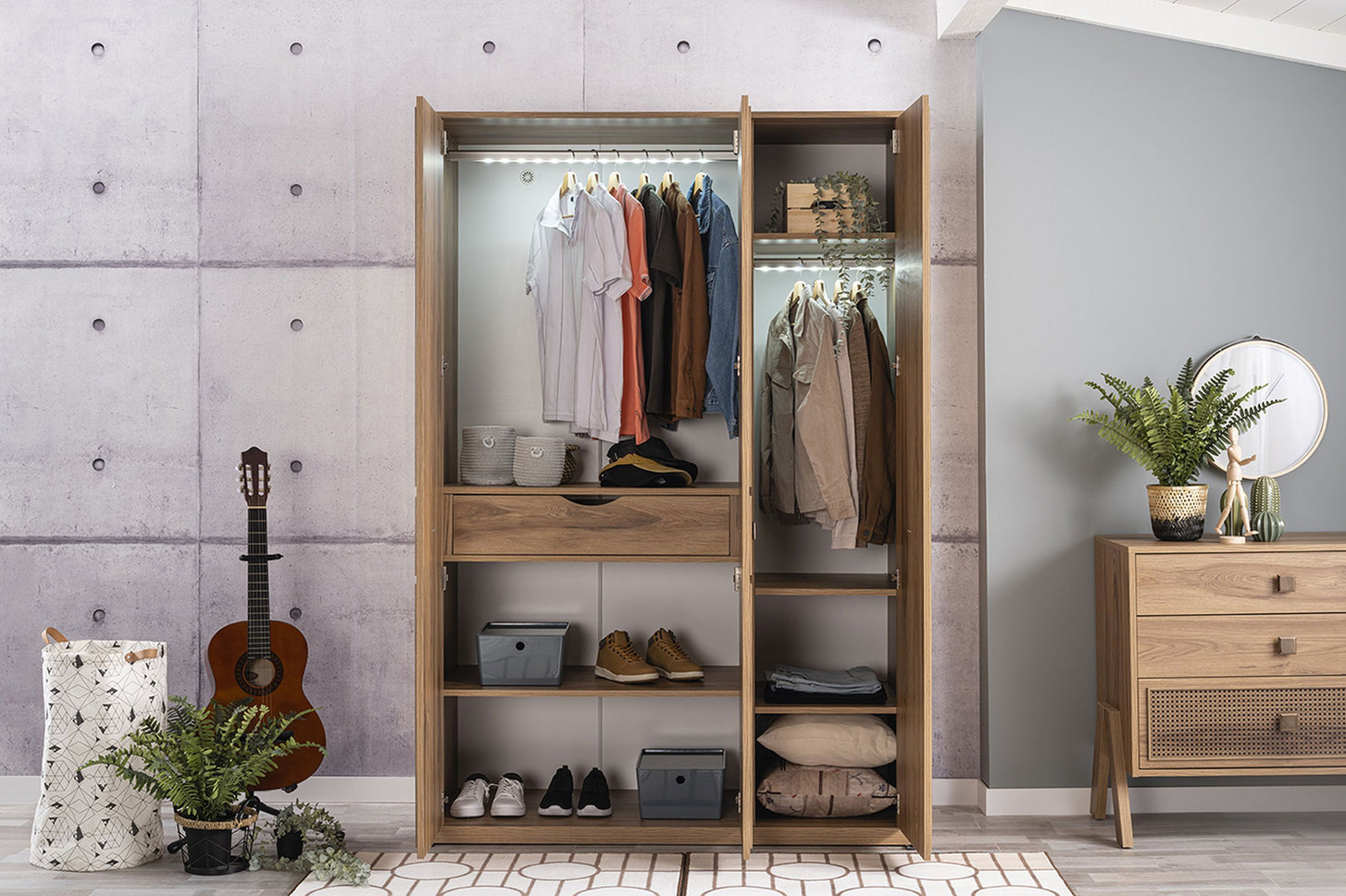 Der 3-türige Kleiderschrank TRIO von Kupa bietet großzügigen Platz für Kleidung und Accessoires. Hinter den Türen verbergen sich zwei beleuchtete Kleiderstangen, eine praktische Schublade sowie fünf Regalfächer für eine strukturierte Aufbewahrung.