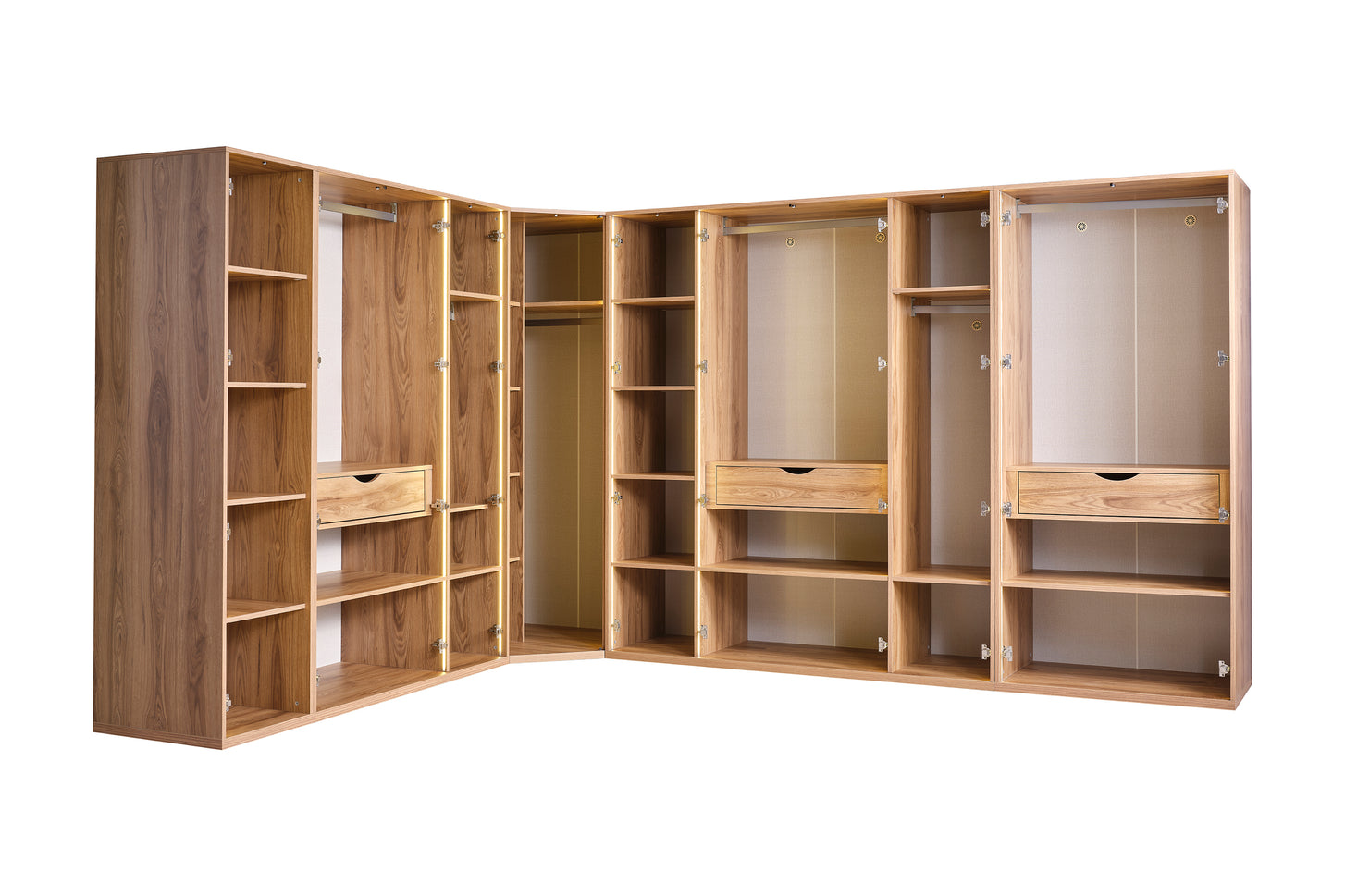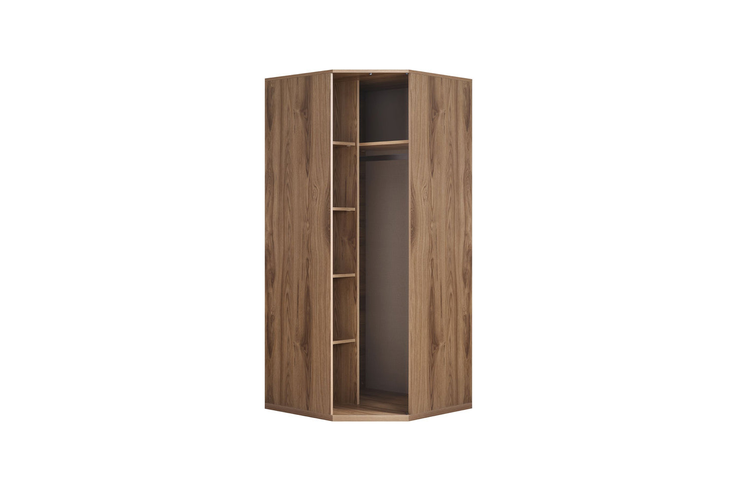 Der Eckschrank TRIO von Kupa überzeugt durch seine clevere Raumausnutzung und ein elegantes Design. Gefertigt in einem warmen Holzton und veredelt mit einer Tür im Hazeran-Druck, fügt er sich nahtlos in moderne Wohnkonzepte ein.