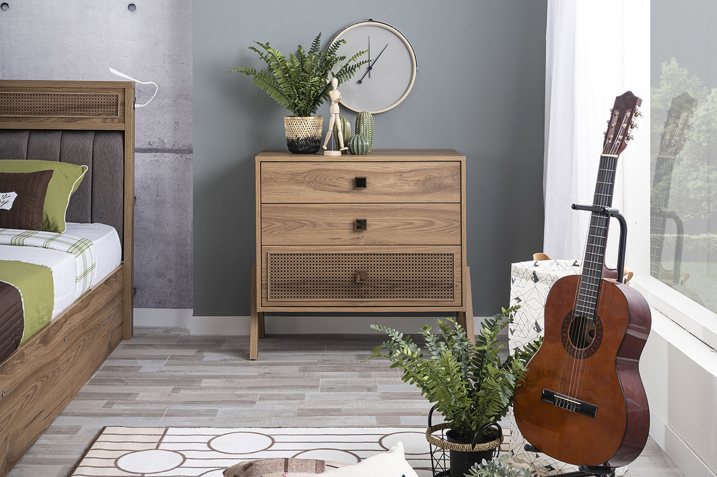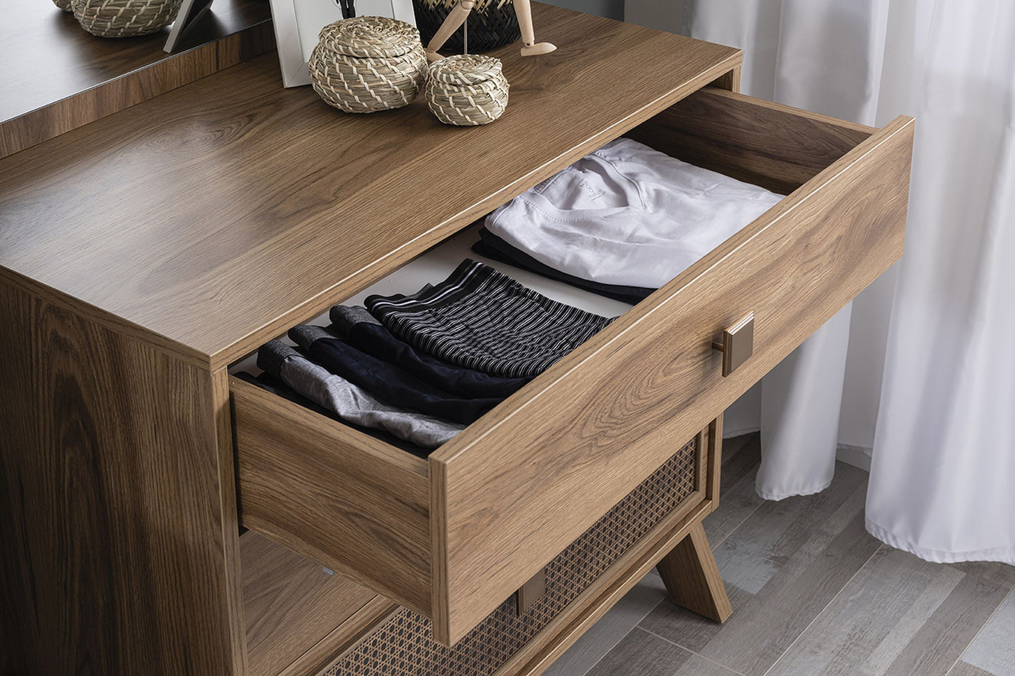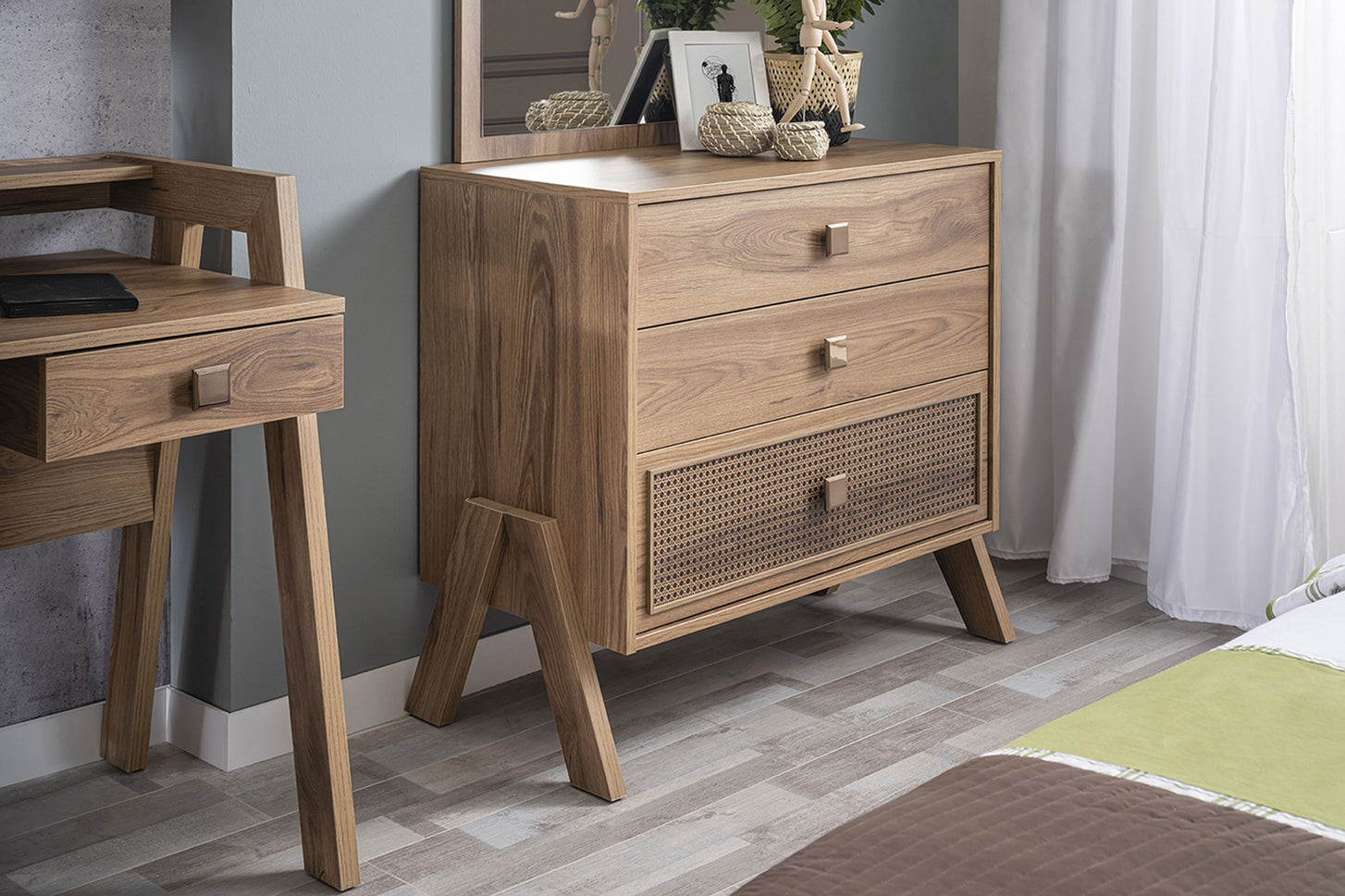 Ein besonderes Highlight ist die Front mit Hazeran-Abdeckung im digitalen UV-Druck, die der holzfarbenen Kommode einen modernen Akzent verleiht. Auf den markanten A-förmigen Füßen stehend, wird sie zum echten Blickfang im Jugendzimmer – funktional und stilbewusst zugleich.