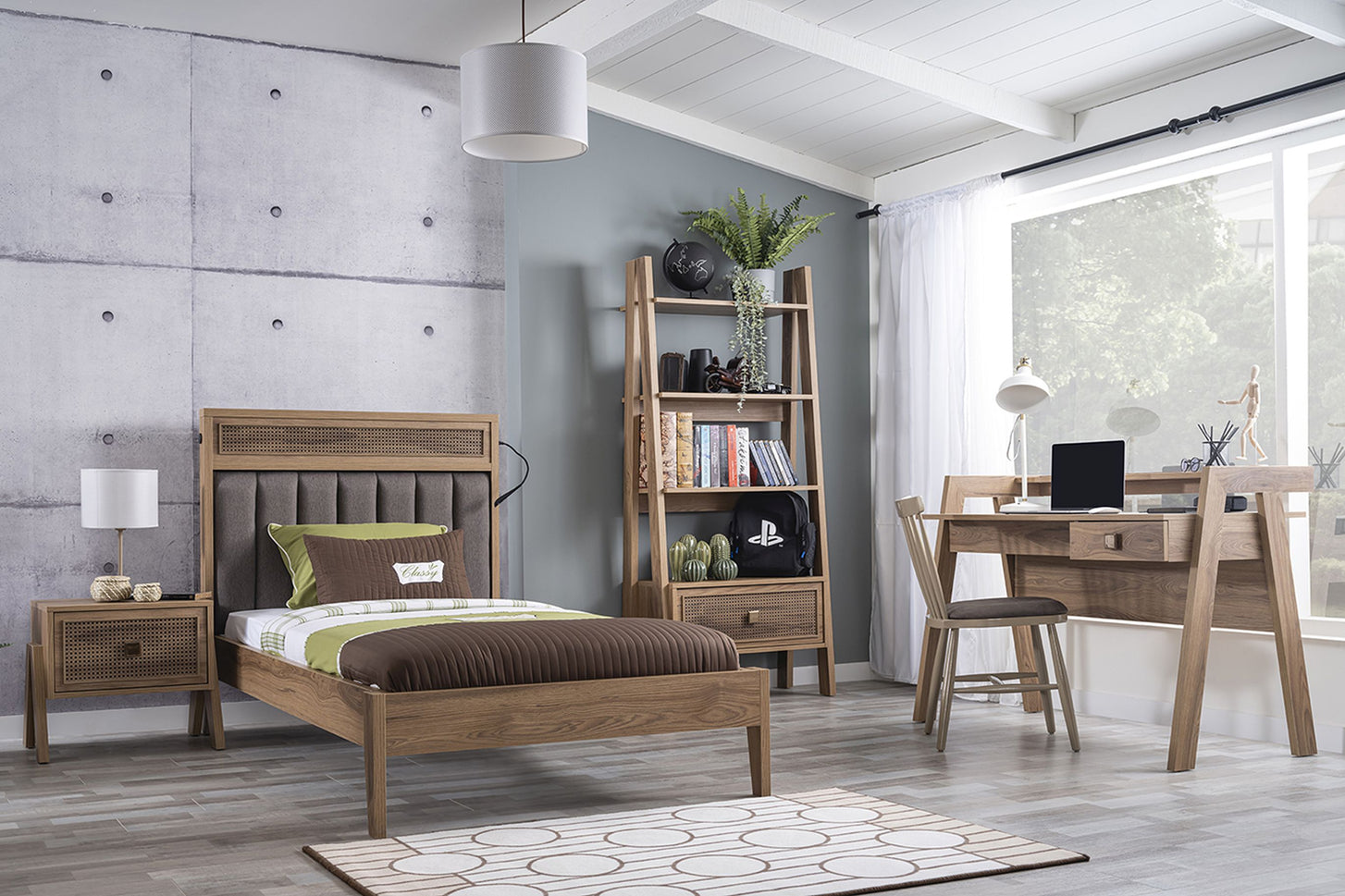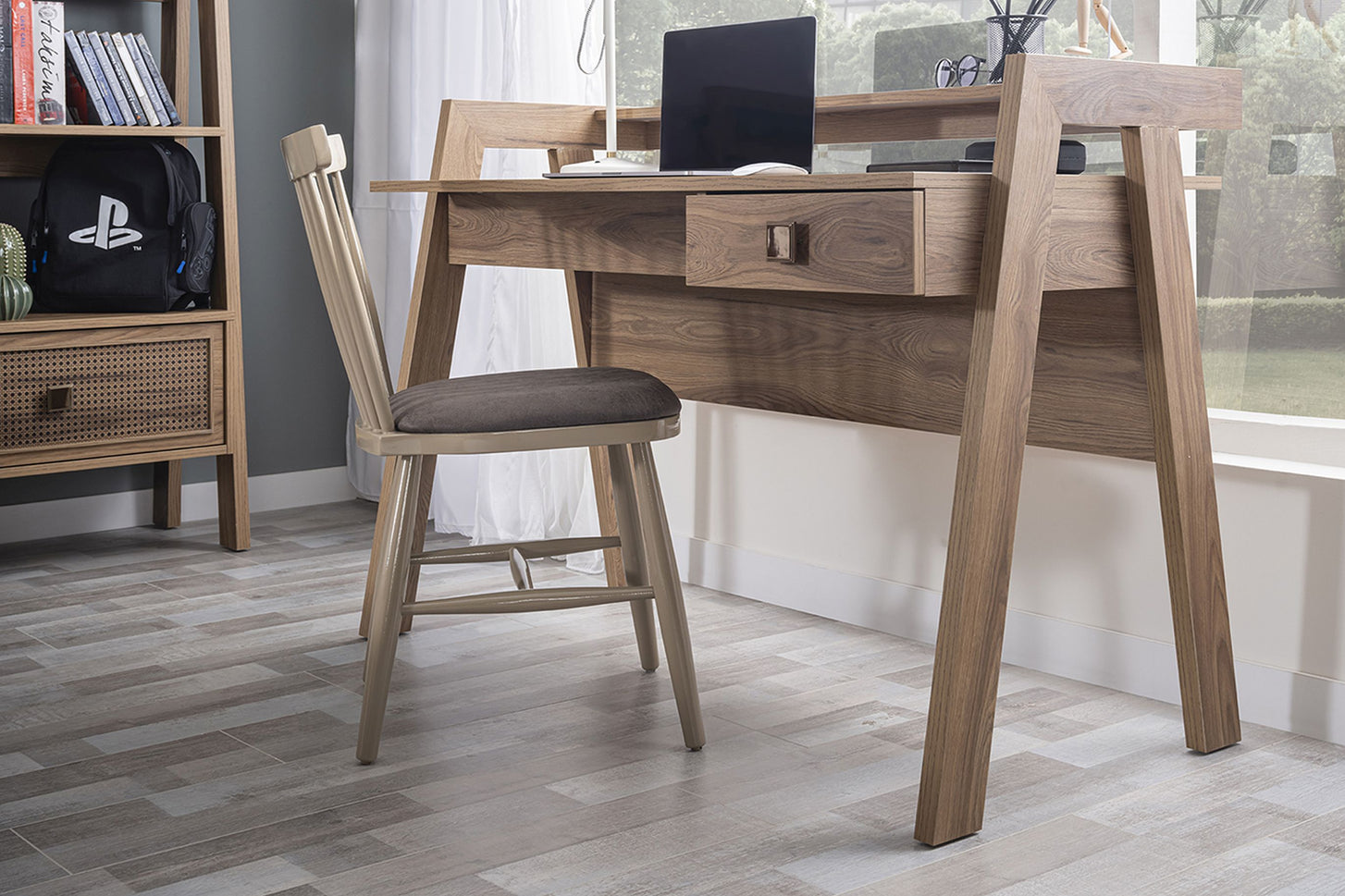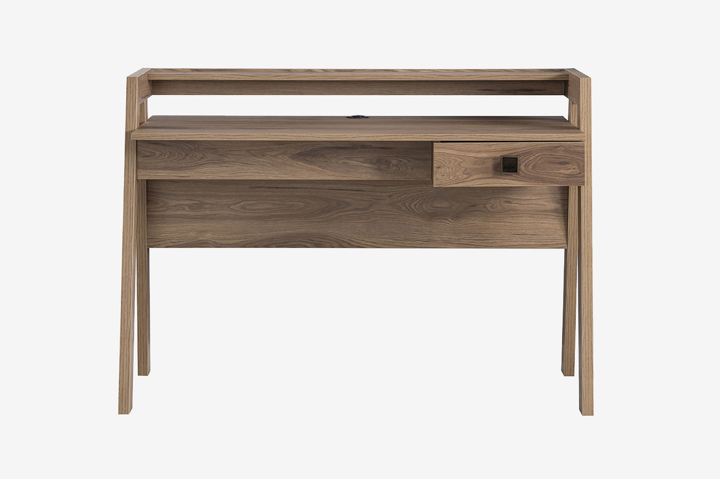 In die Tischplatte sind zwei USB-Anschlüsse integriert – perfekt für das Aufladen von Smartphone, Tablet & Co. Die rechte Schublade mit Dämpfern sorgt für sanftes Schließen und hält Schreibutensilien ordentlich verstaut. Mit seinen charakteristischen A-förmigen Seitenteilen ist der Schreibtisch nicht nur funktional, sondern setzt auch ein stilvolles Statement im Jugendzimmer.