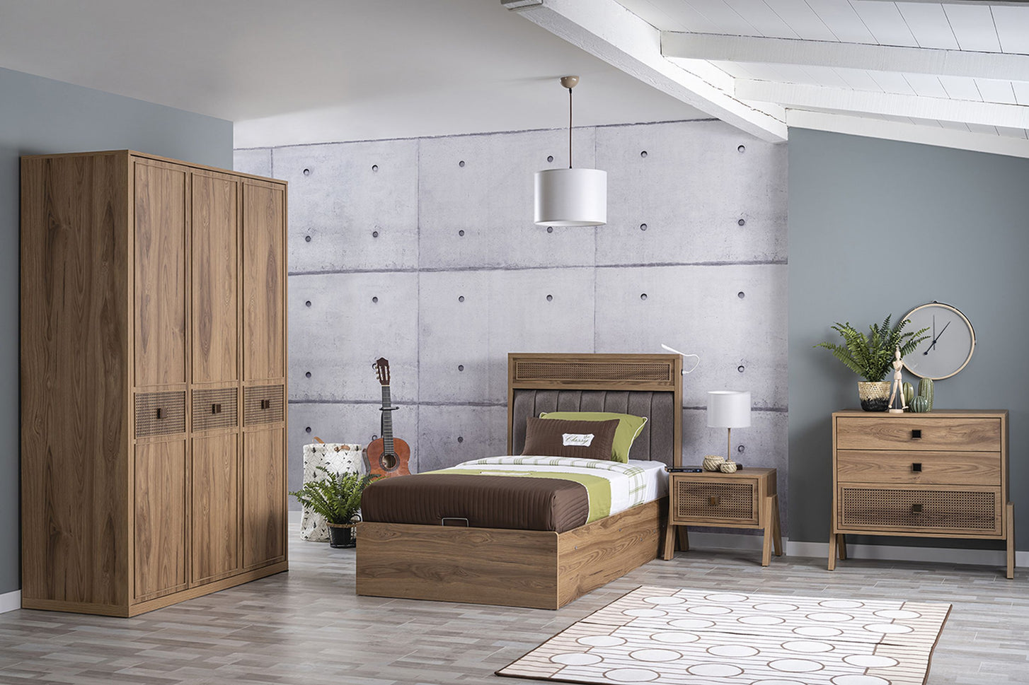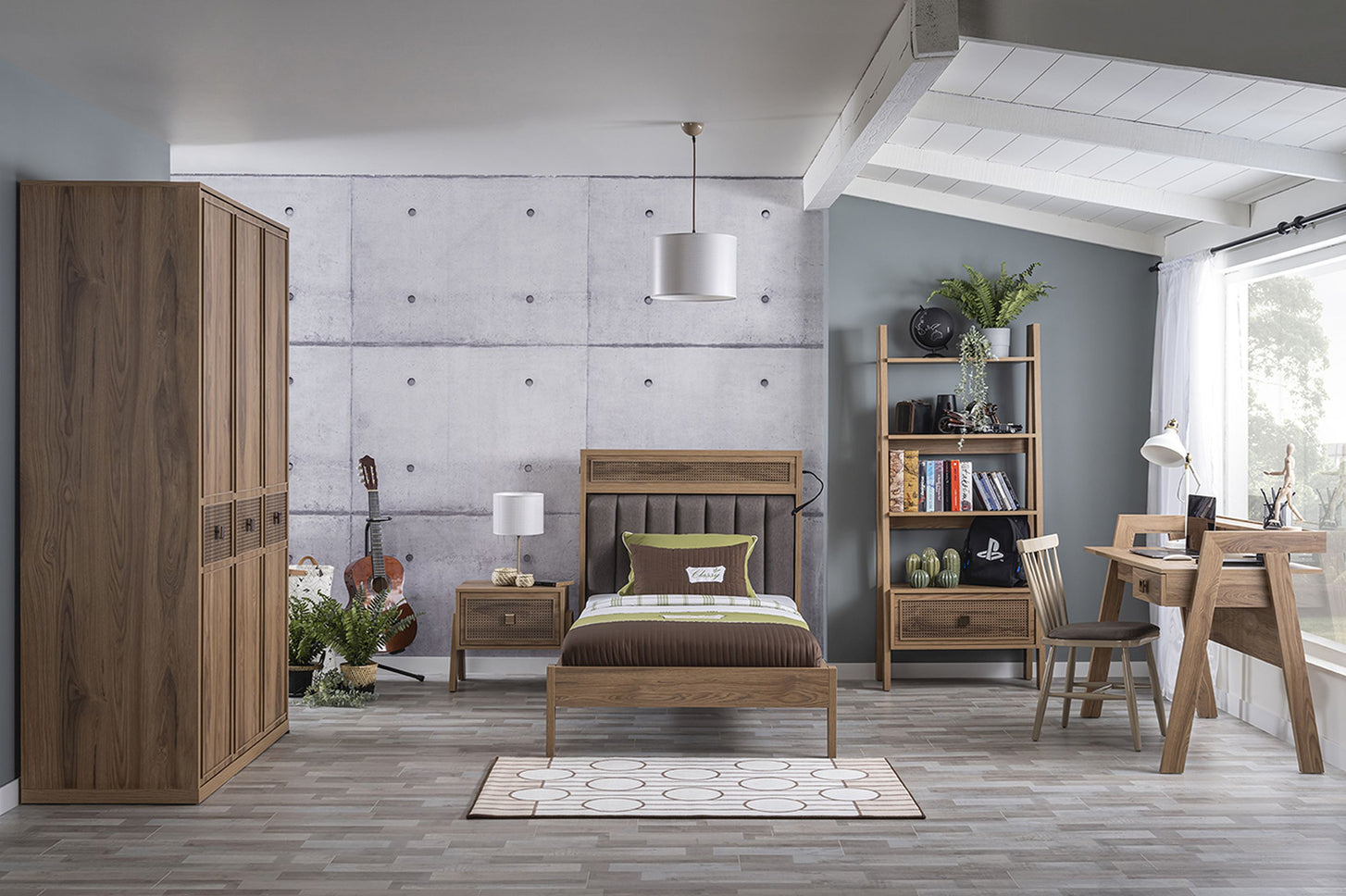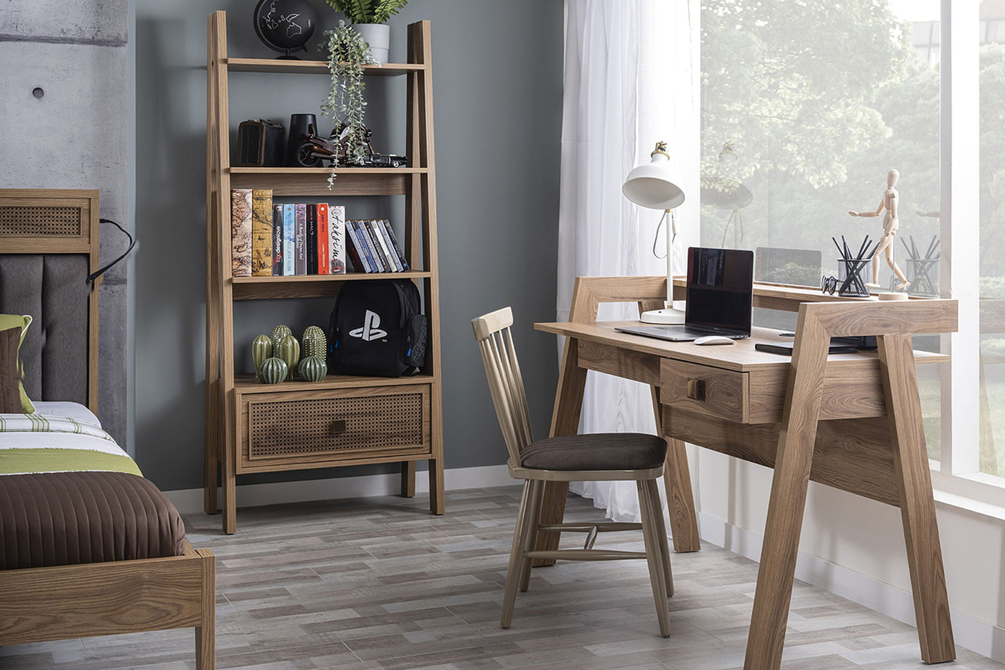 In die Tischplatte sind zwei USB-Anschlüsse integriert – perfekt für das Aufladen von Smartphone, Tablet & Co. Die rechte Schublade mit Dämpfern sorgt für sanftes Schließen und hält Schreibutensilien ordentlich verstaut. Mit seinen charakteristischen A-förmigen Seitenteilen ist der Schreibtisch nicht nur funktional, sondern setzt auch ein stilvolles Statement im Jugendzimmer.