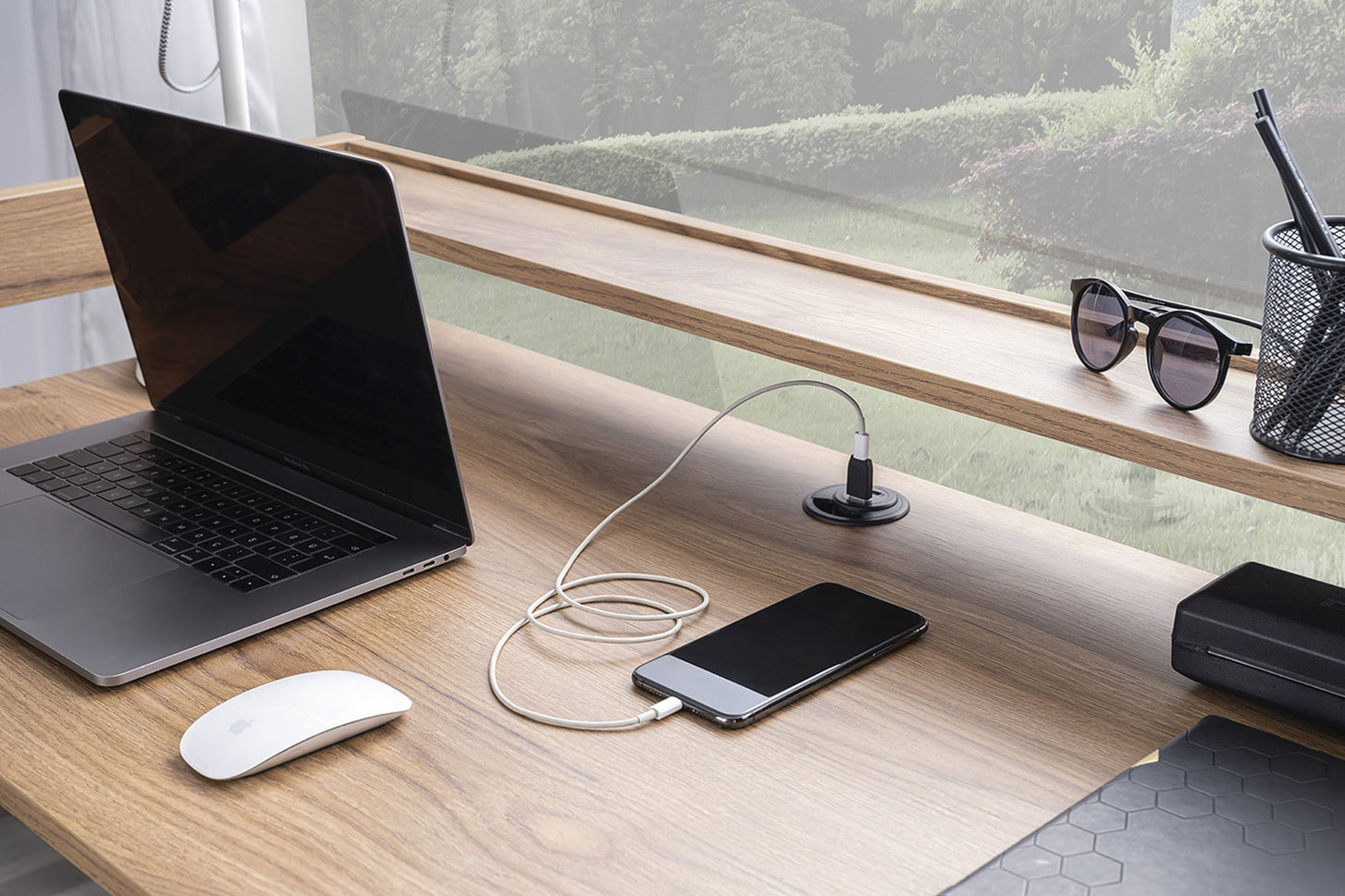 - 2 USB-Anschlüsse und Kabeldurchführung