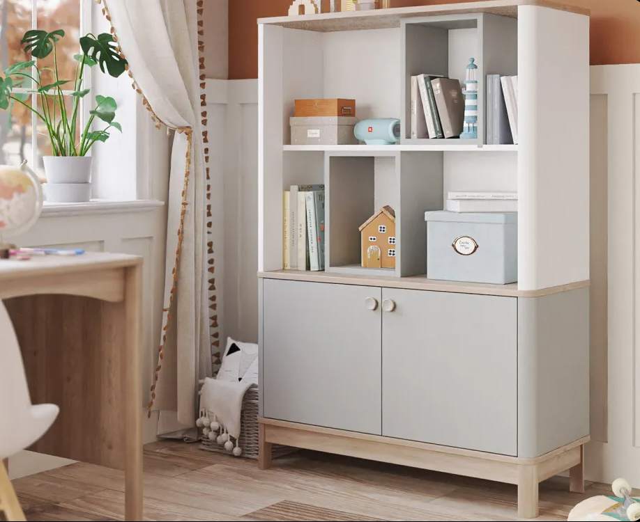 Das Newjoy BONO GREY Bücherregal besticht durch sein zeitloses Design in Weiß, Grau und Naturtönen und bietet großzügigen Platz für Bücher, Deko-Objekte und andere Schätze. Die helle Farbgebung schafft eine freundliche und einladende Atmosphäre im Raum. Die zwei offenen Regalfächer bieten Platz für häufig genutzte Gegenstände, während die beiden Türen zusätzlichen Stauraum bieten und für Ordnung sorgen. Die grauen Regaleinsätze im oberen Bereich lassen sich flexibel verschieben, um das Regal individuell anzupassen.