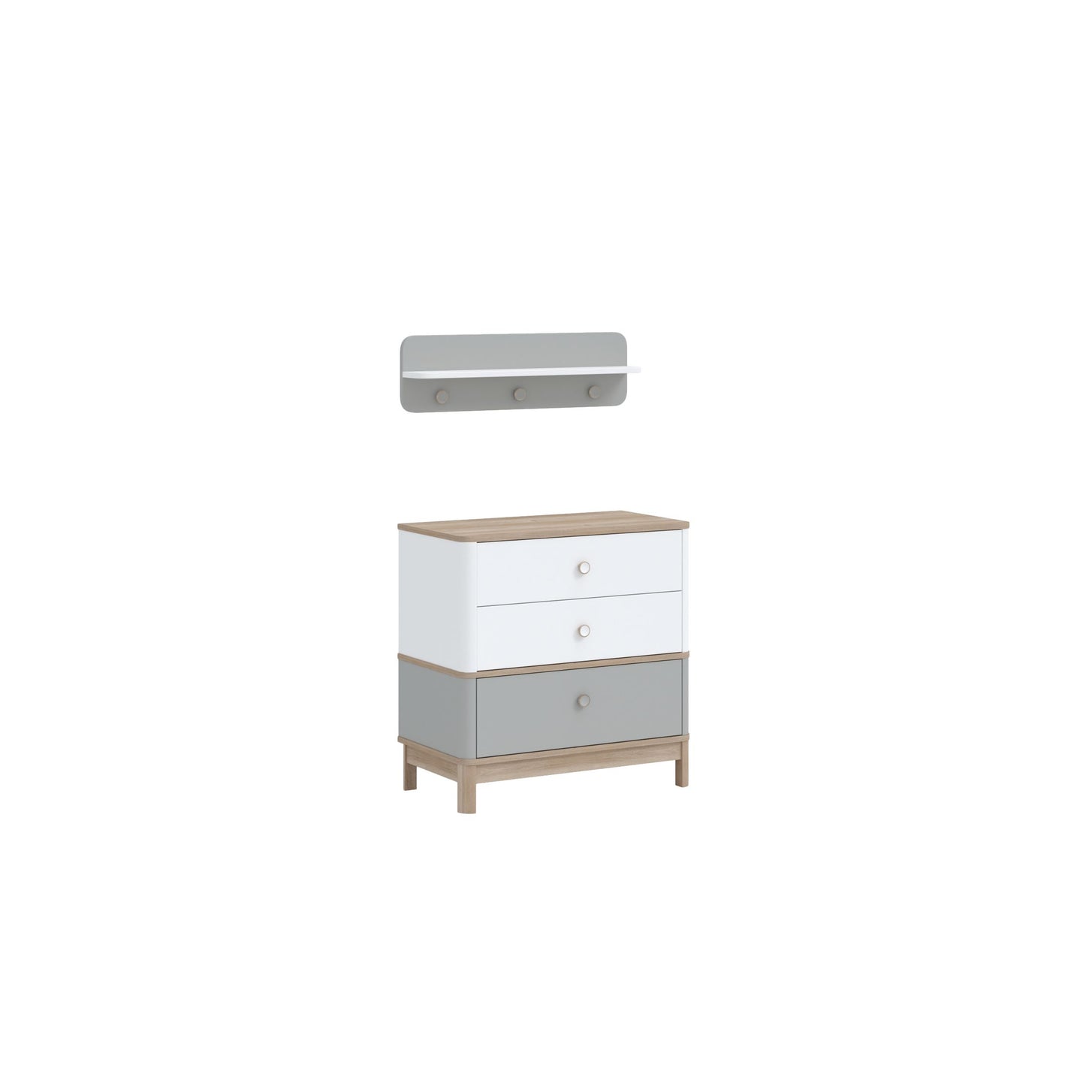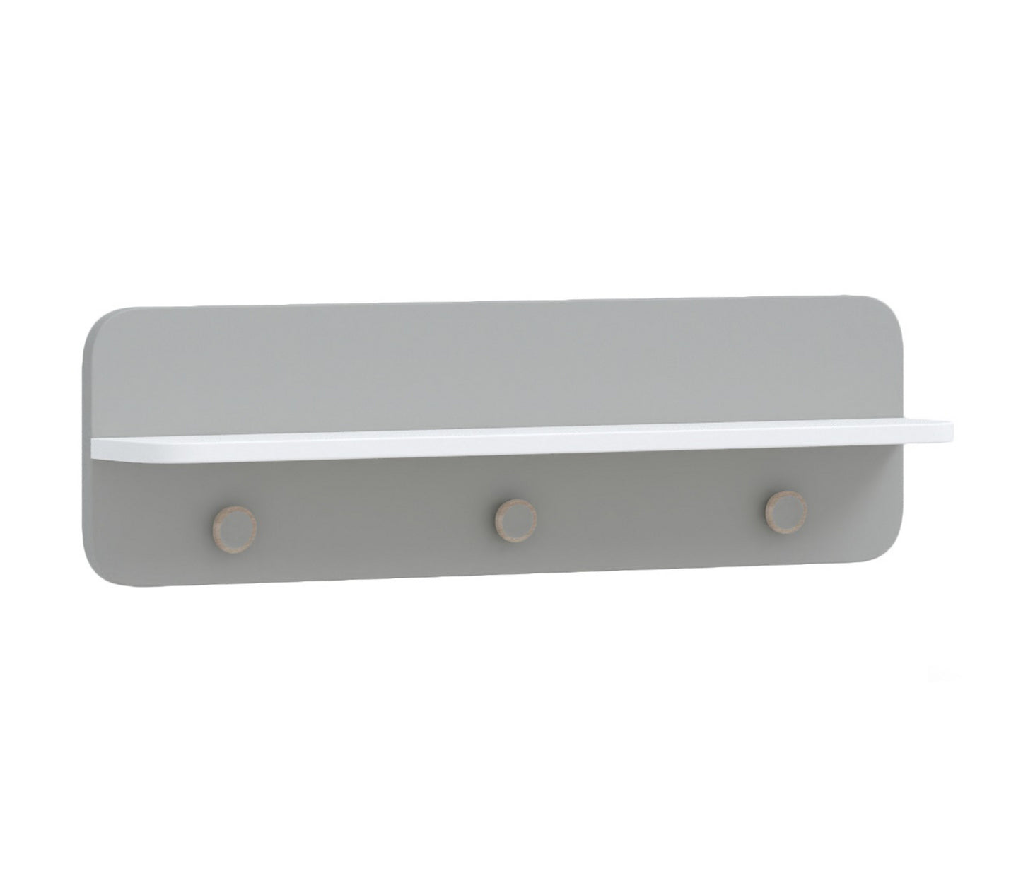 Das graue Wandregal BONO GREY mit weißem Regalbord und drei runden Garderobenknöpfen ist die ideale Ergänzung zur gleichnamigen Kommode. Dank seines zeitlosen und ansprechenden Designs fügt es sich jedoch auch harmonisch in viele andere Einrichtungsstile ein. Das Regal bietet Platz für kleine Gegenstände und Accessoires, während die Garderobenknöpfe für Ordnung sorgen.