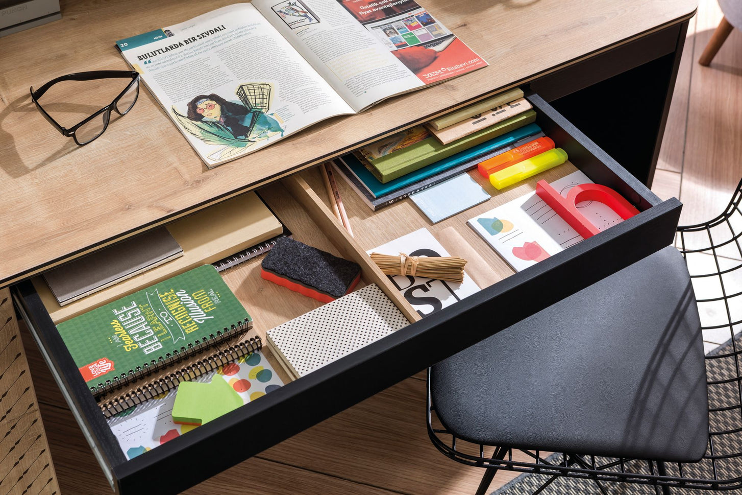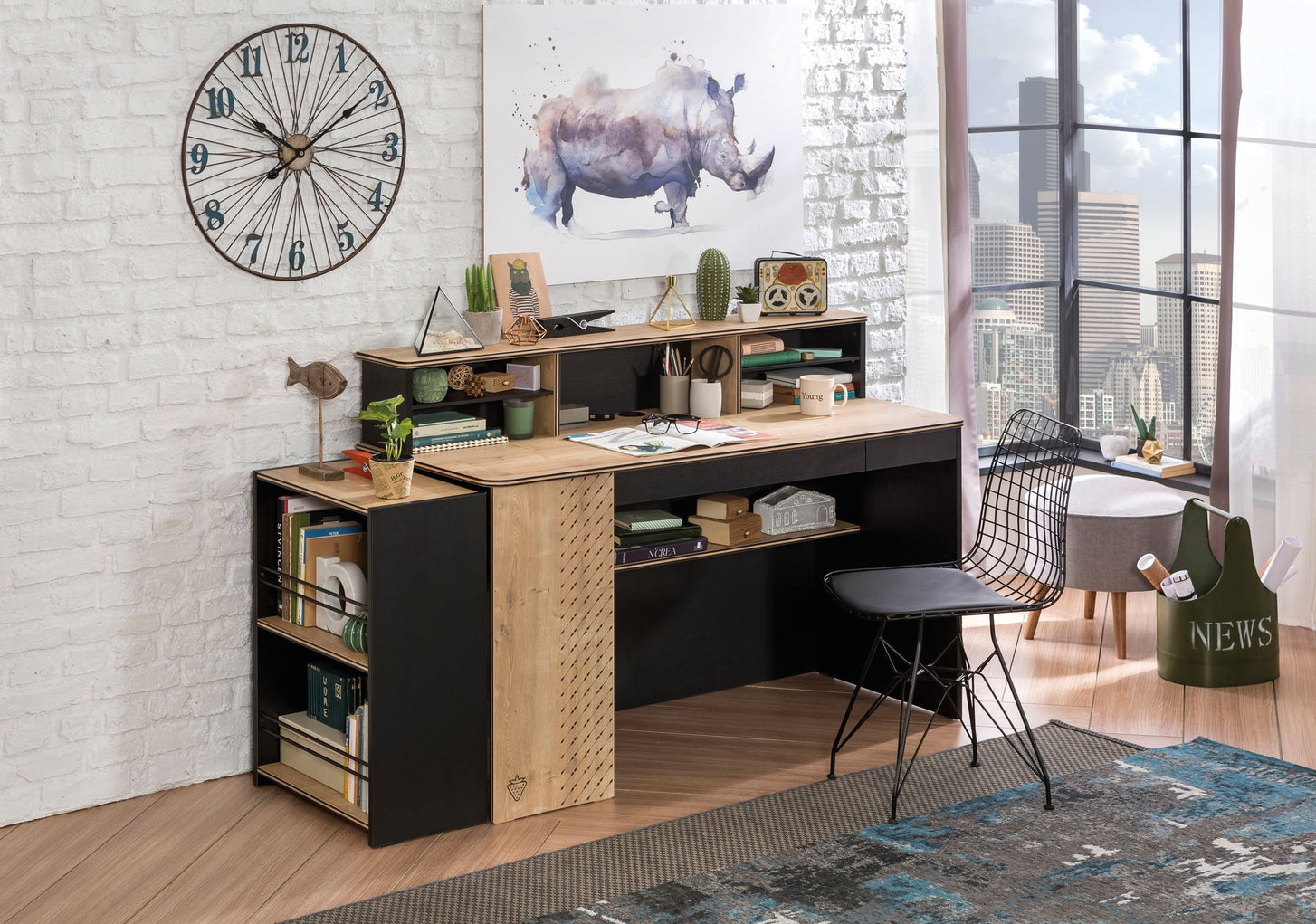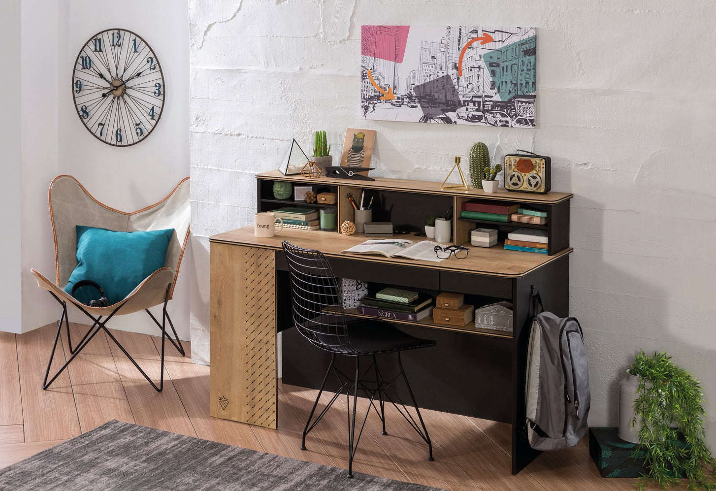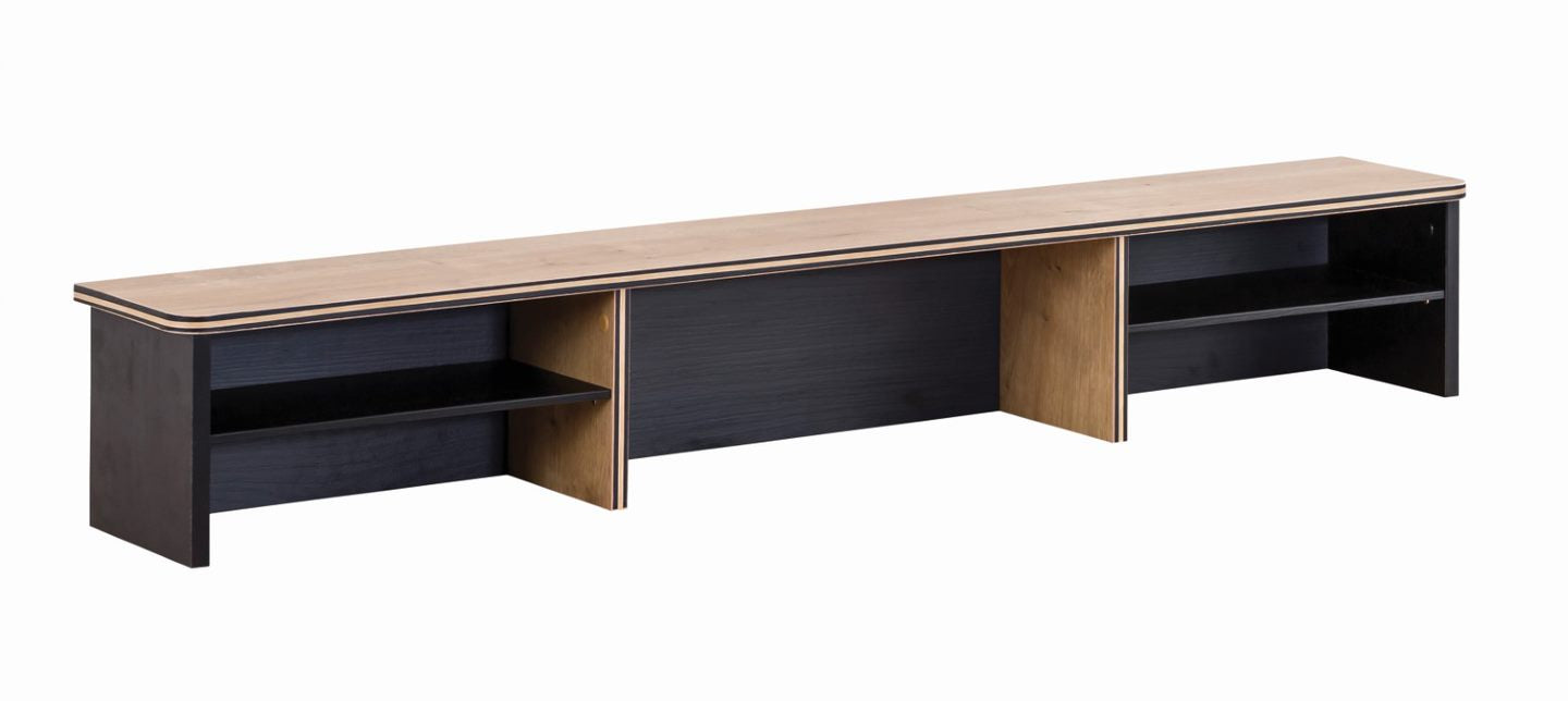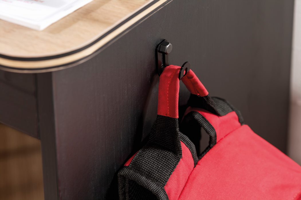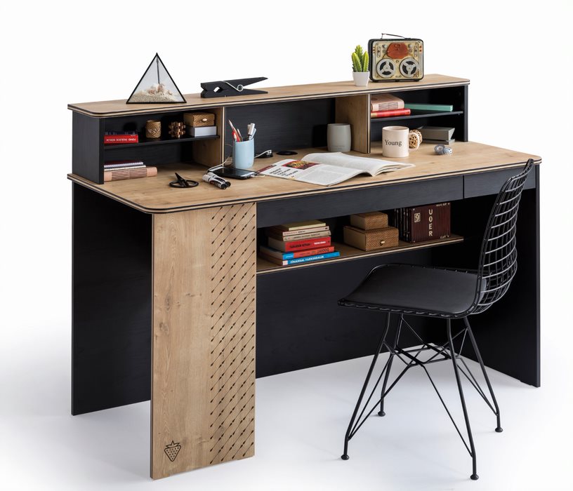 Schreibtisch Black breitDer BLACK Schreibtisch, besticht durch sein klares und modernes Design. Am Schreibtisch sorgen zwei Schubladen für Übersicht und Ordnung. Unter der Tischplatte befindet sich ein Regal, der für zusätzliche Ablagefläche sorgt - durch die schmale Tiefe des Regals ist genügend Beinfreiheit gewährt. Ein USB-Anschluss, zum Laden von Handy oder IPad, wurde direkt in der Tischplatte integriert. Der Schreibtisch kann noch mit zusätzlichem Regal und Tischaufsatz ergänzt werden. Firma Cilek konzentriert sich darauf, das Leben mit praktischen Details einfacher zu machen. Mit der Serie BLACK, kommt Coolness-Faktor ins Zimmer – das wird Ihr Teenager lieben! Mit diesen Möbeln gestalten Sie ein stylisches und praktisches Jugendzimmer. Die schwarzen Möbel wirken sehr stilvoll und die natürlichen Holzoptik-Elemente, sorgen für eine weiche Note beim schwarz - so wird das Kinderzimmer zu einem Rückzugsort! Ausstattung: - 2 Schubkästen mit Unterteilung