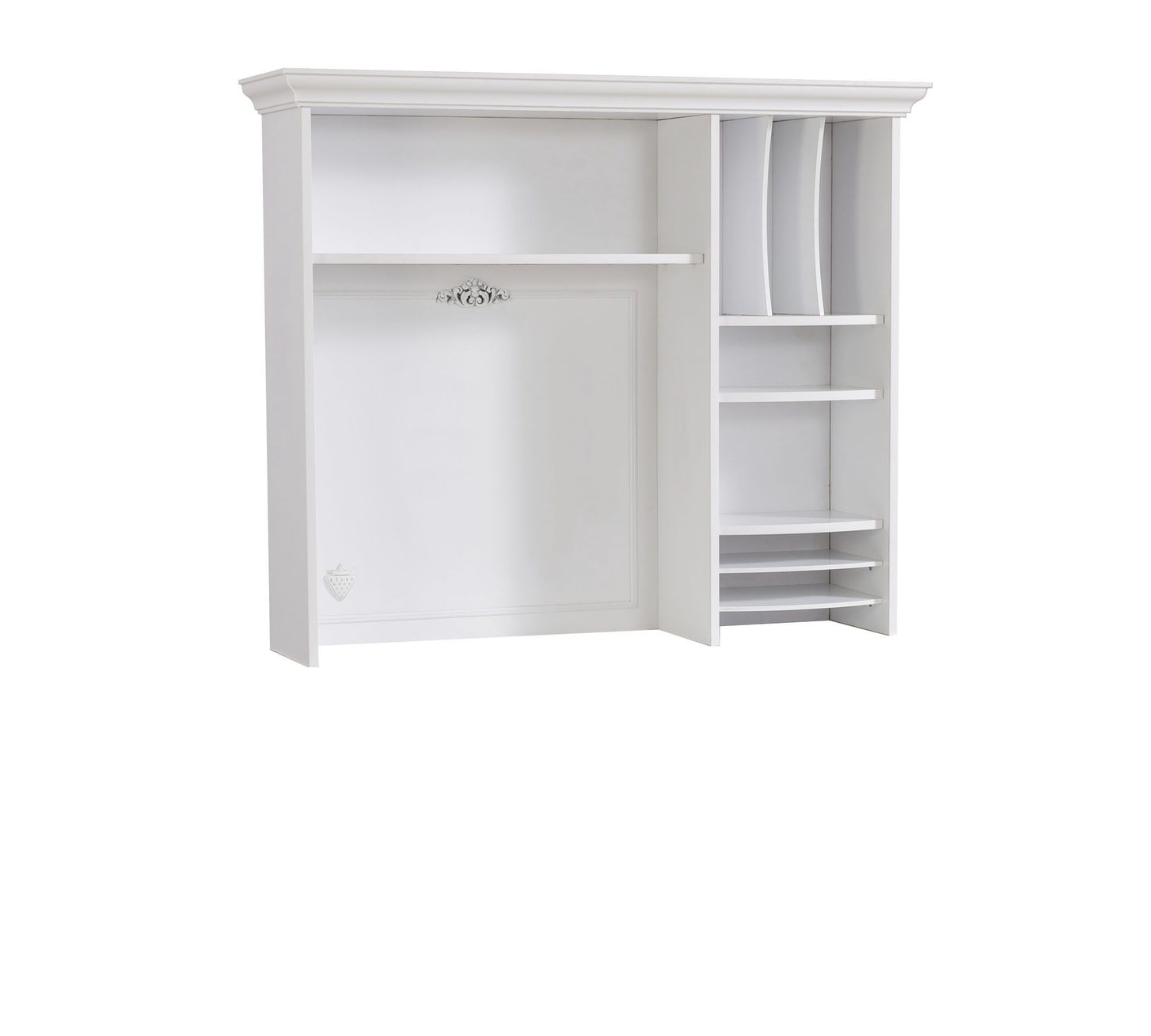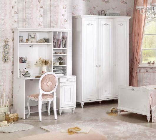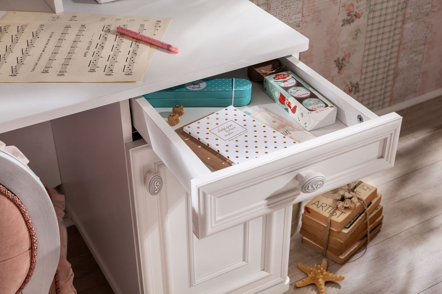 Schreibtisch RomanticaAn diesem wunderschönen Tisch, kann man sich gemütlich machen und kreativ werden. Der Schreibtisch ROMANTICA überzeugt, wie der Name schon sagt, mit seinem romantischen und stillvollen Design. Verspielte Details wie: geschnitzte Beine, Rahmenfronten und dekorative Griffe unterstreichen den Charmanten Look des Schreibtisches und sorgen für eine Märchenhafte Atmosphäre im Kinderzimmer. Der Arbeitsraum am Schreibtisch, kann durch einen passenden Tischaufsatz mit zusätzlichem Stauraum noch funktionaler und bequemer gemacht werden. Ausstattung: - 1 Schublade