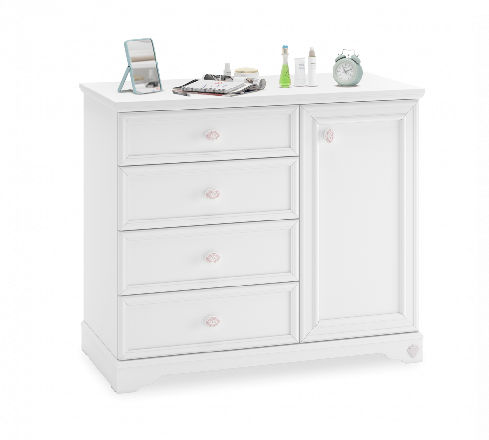 Die RUSTIK WHITE Kinderkommode in Weiß passt mit ihrem schlichten, aber formschönen Design zu bereits bestehenden Möbeln oder kann mit Möbeln aus der gleichen Serie ergänzt werden. 4 große Schubladen und ein Schrank mit Tür bieten viel Platz für Ordnung und Struktur im Kinderzimmer. In der oberen Schublade befindet sich ein mit Stoff überzogener Aufteiler aus Holz mit 9 Fächern für das ordentliche Verstauen von Kleinigkeiten. Dank des praktischen Bremssystems in den Schienen schließen die Schubladen langsam und leise.