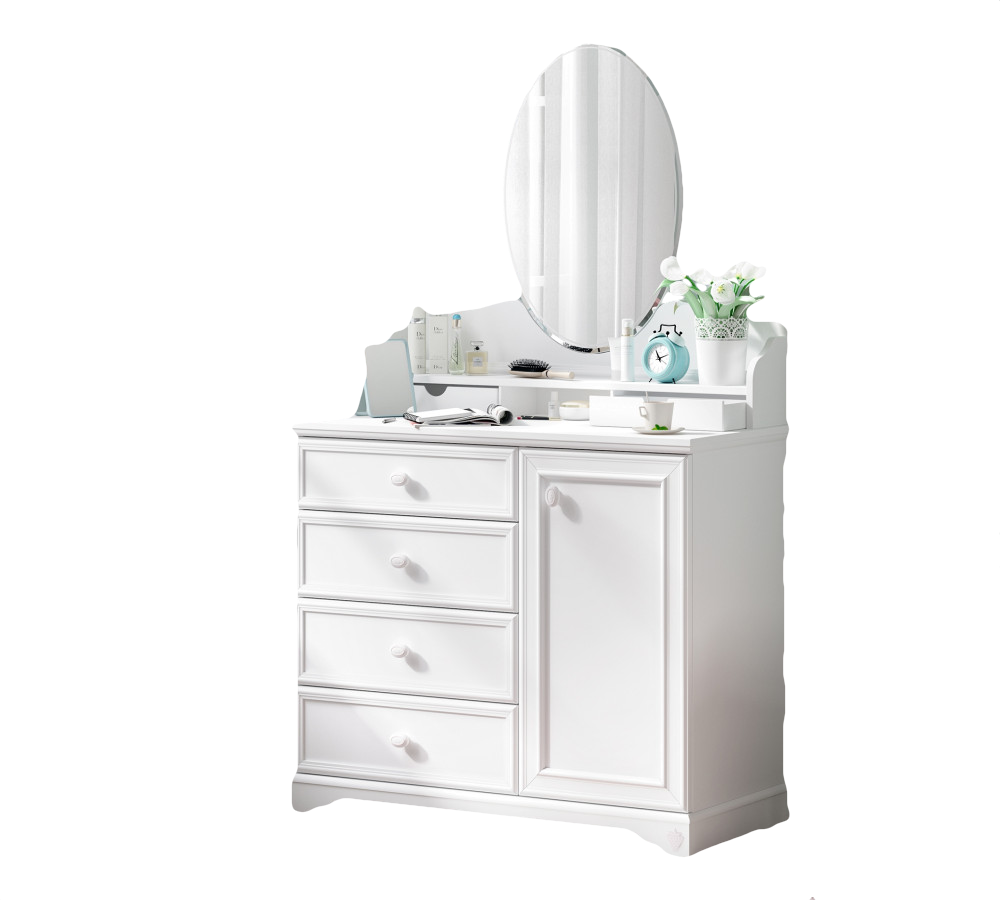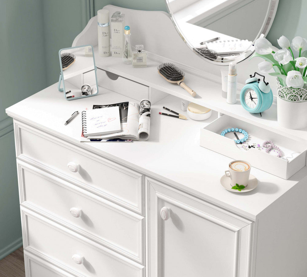Um den Platz zu erweitern bietet Cilek einen wunderschönen Aufsatz mit einem großen Regal, zwei kleinen Schubladen und ellipsenförmigen Spiegel an. Die Kanten des Spiegels sind aus Sicherheitsgründen abgeschrägt.