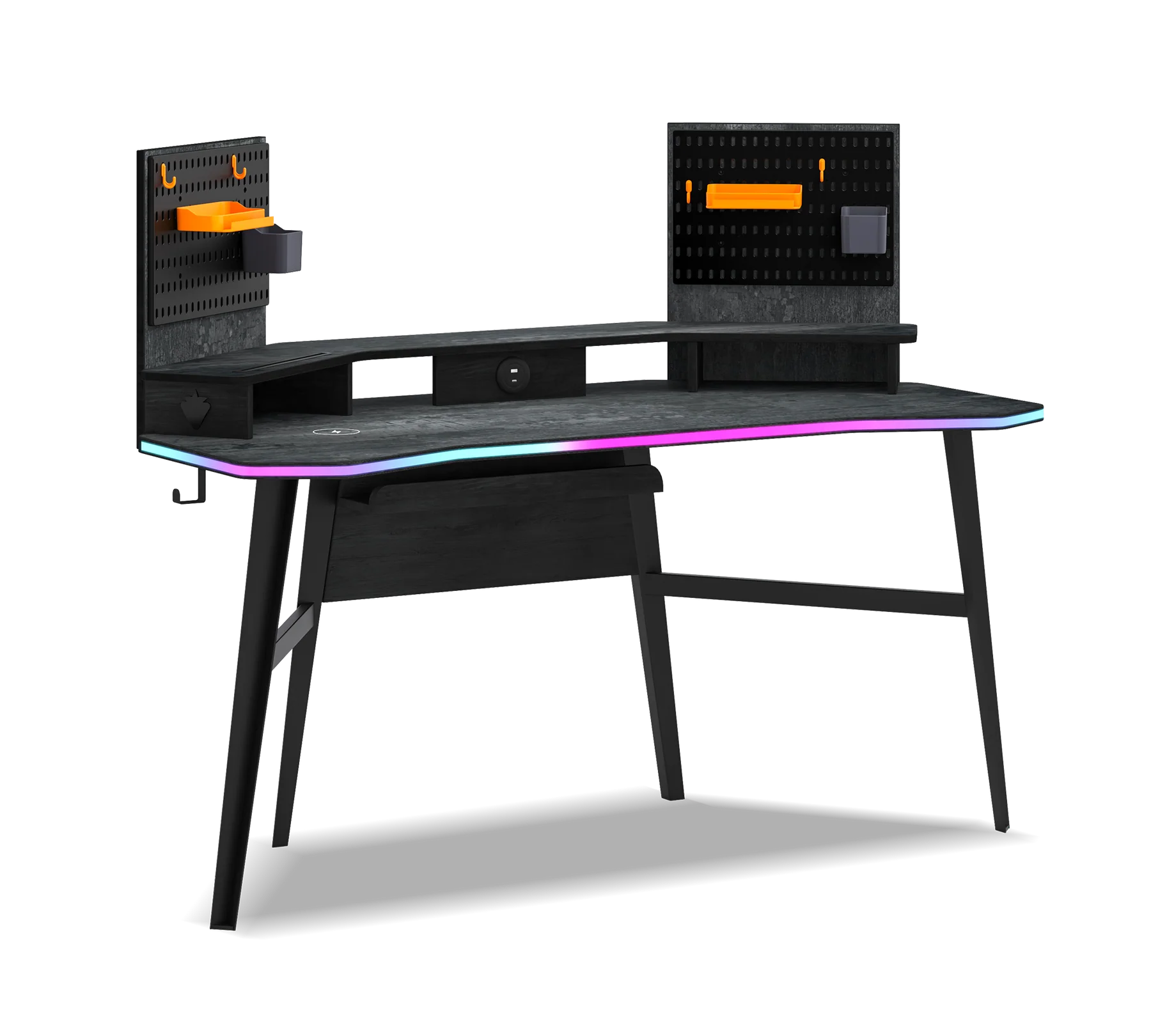 • Volle Power: Integrierte USB-Hubs (Typ-A & Typ-C) direkt in der Tischplatte für Controller oder Smartphone.
